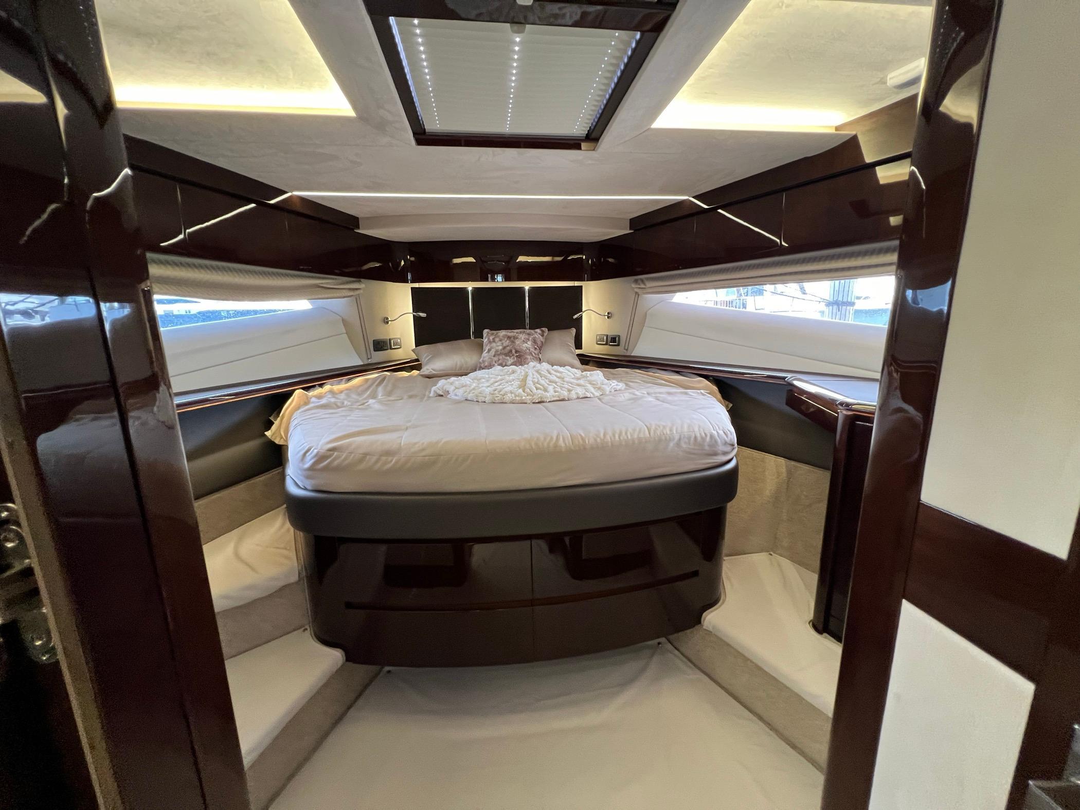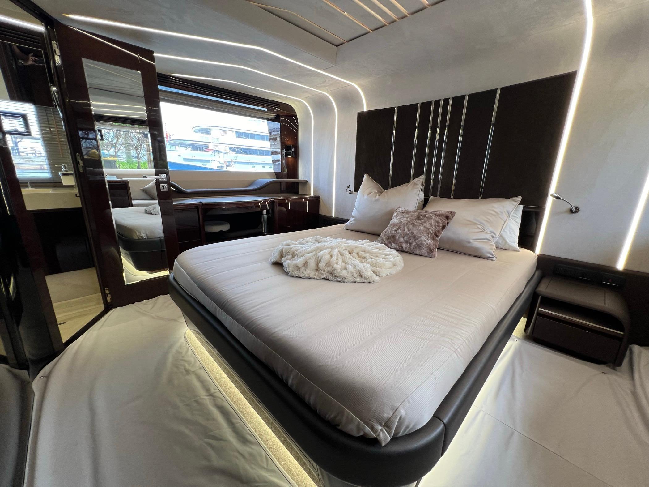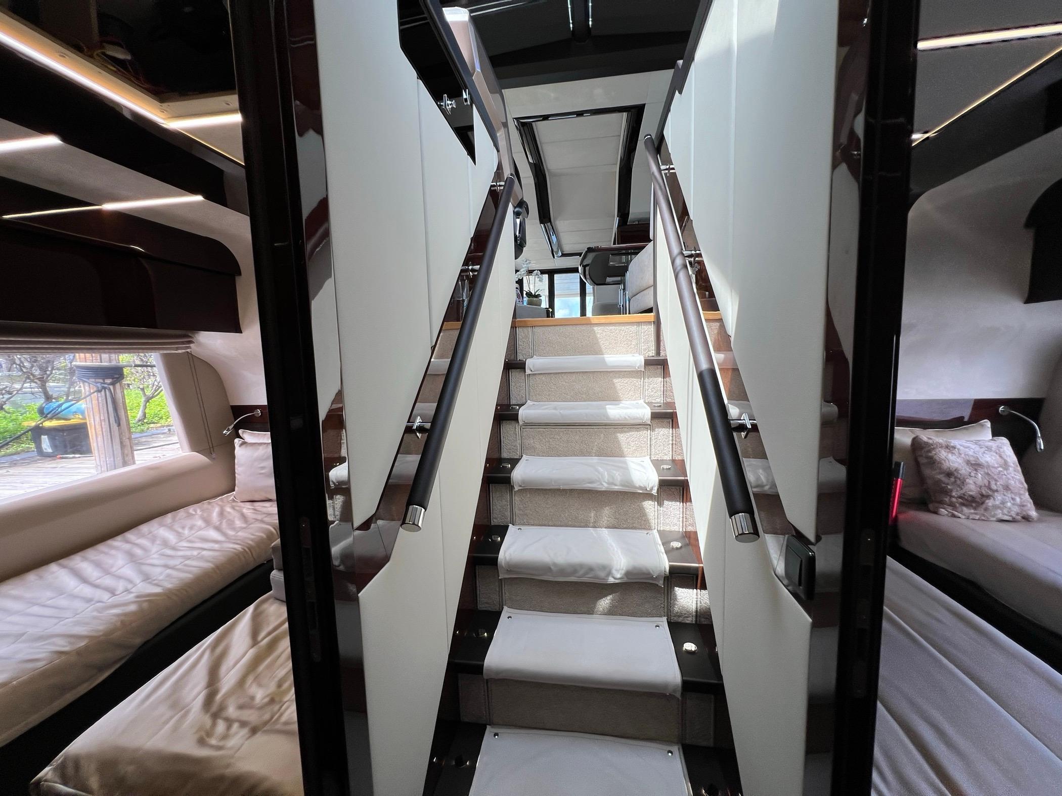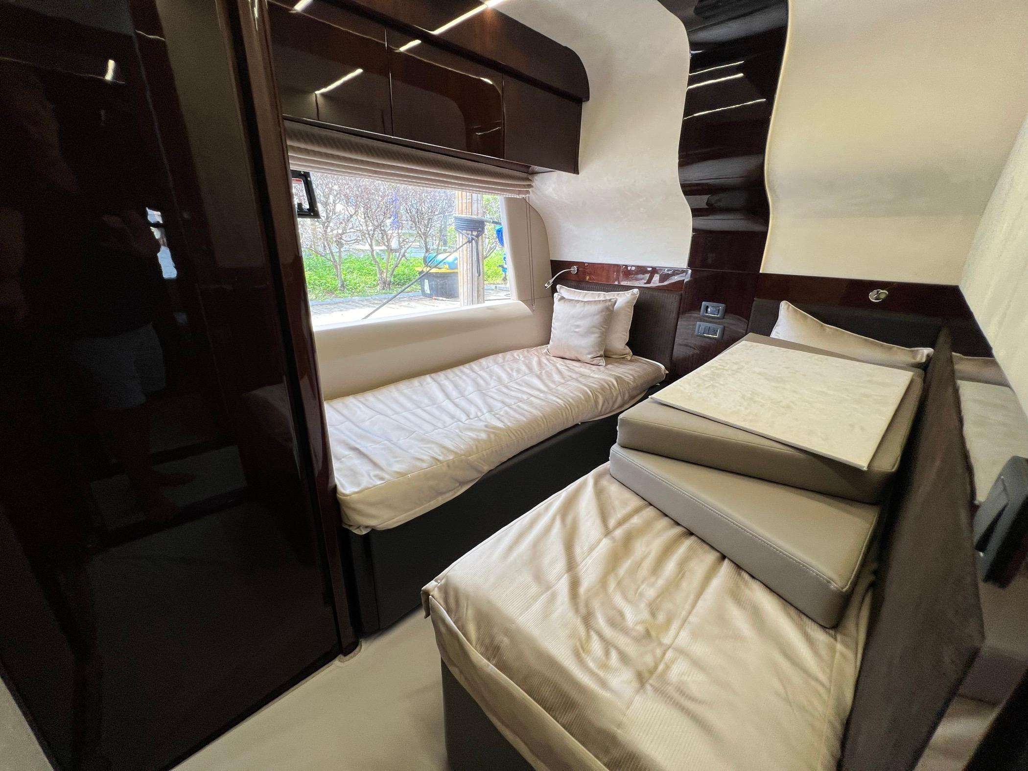 The foredeck can be transformed into an expansive seating area with a touch of a button for sunning or sunset cruising. The vast Flybridge is most impressive with plentiful seating, wet bar entertaining, and a carbon hardtop and the opening windows in the salon allow cool breezes to sinuously blend inside and outside spaces. With 4 cabins, 30+ knot performance, and amazing innovation the 680 FLY sets new benchmarks.