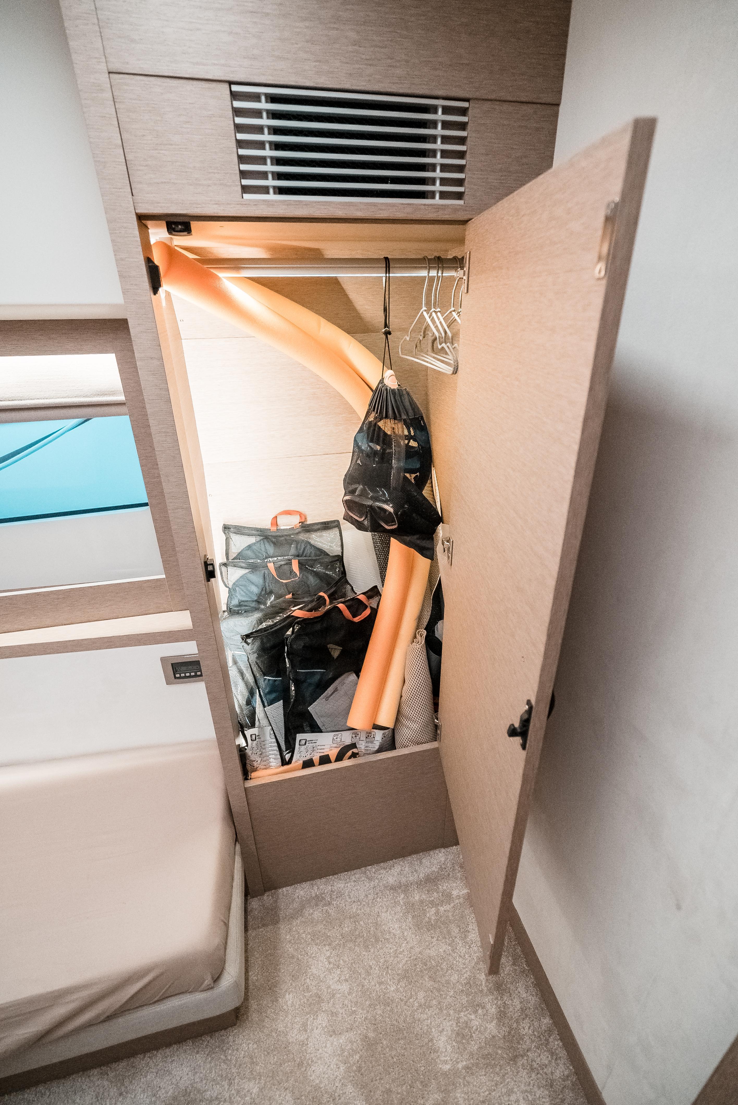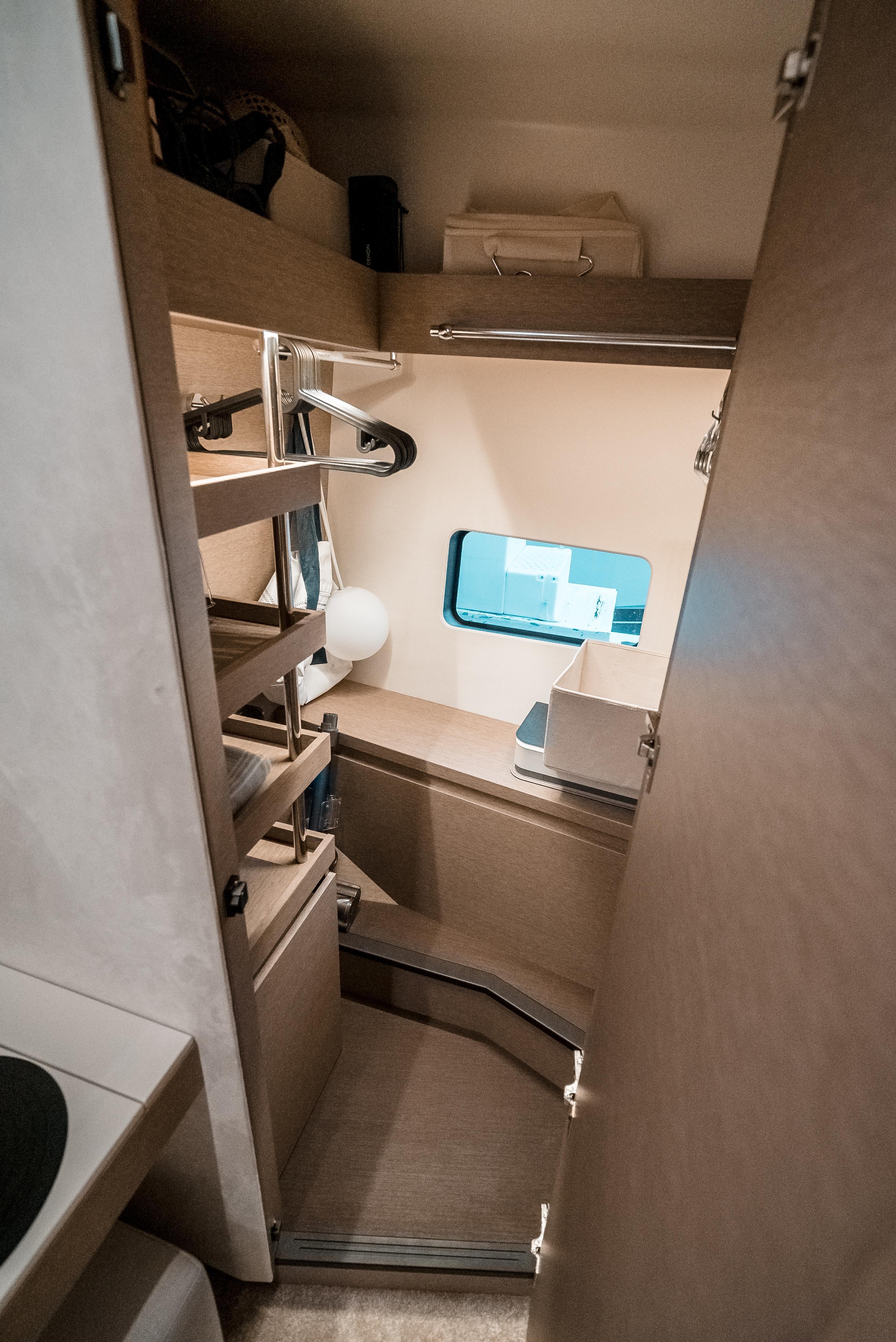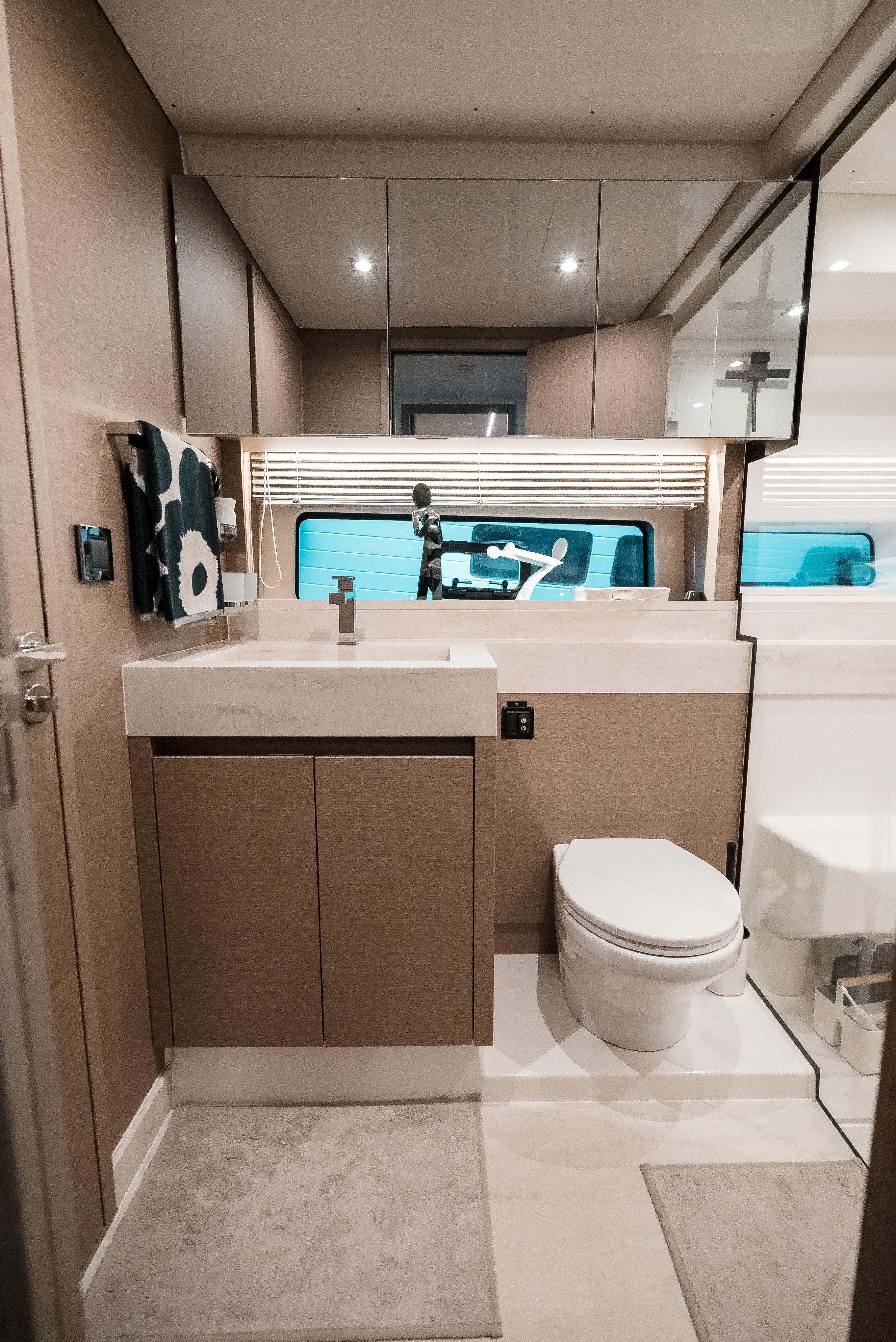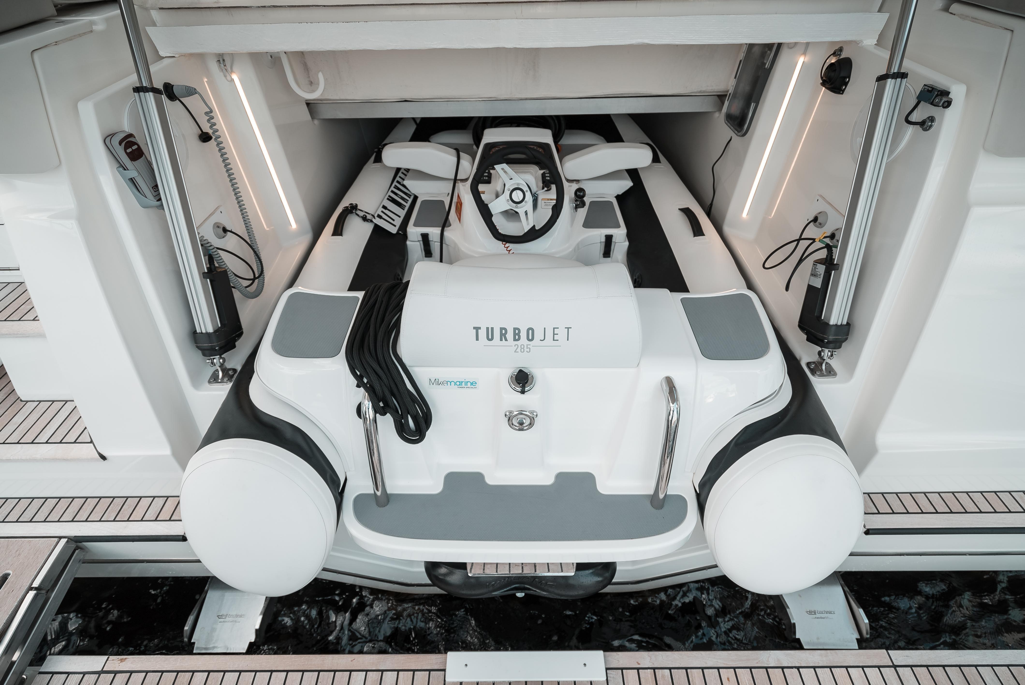 She benefits from an optimized engine and control system with Cummins 600 HP twin engines equipped with Zeus Pods. This configuration inherent to the tapered V-shaped hull enables facilitated handling by joystick. This ideal pairing of hull shape and propulsion system reduces noise and vibrations, as well as the fuel consumption of the boat.