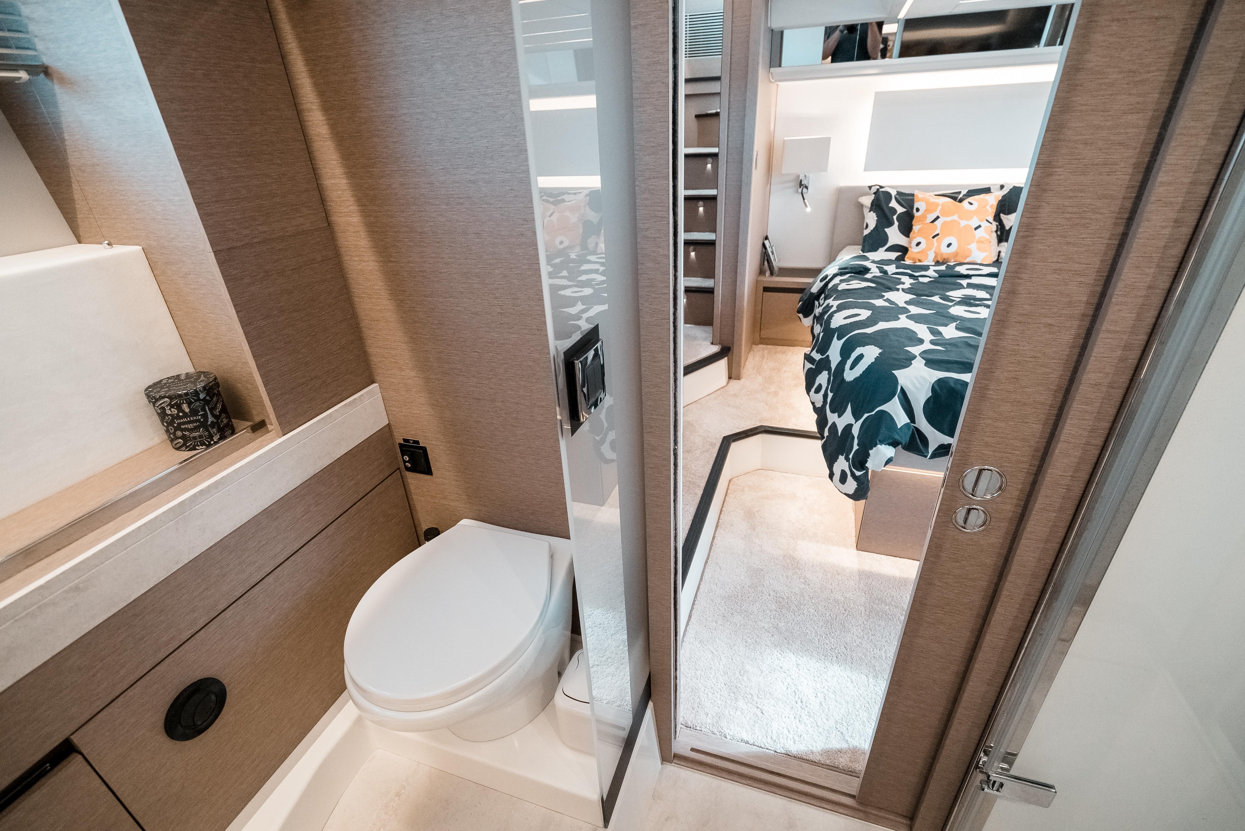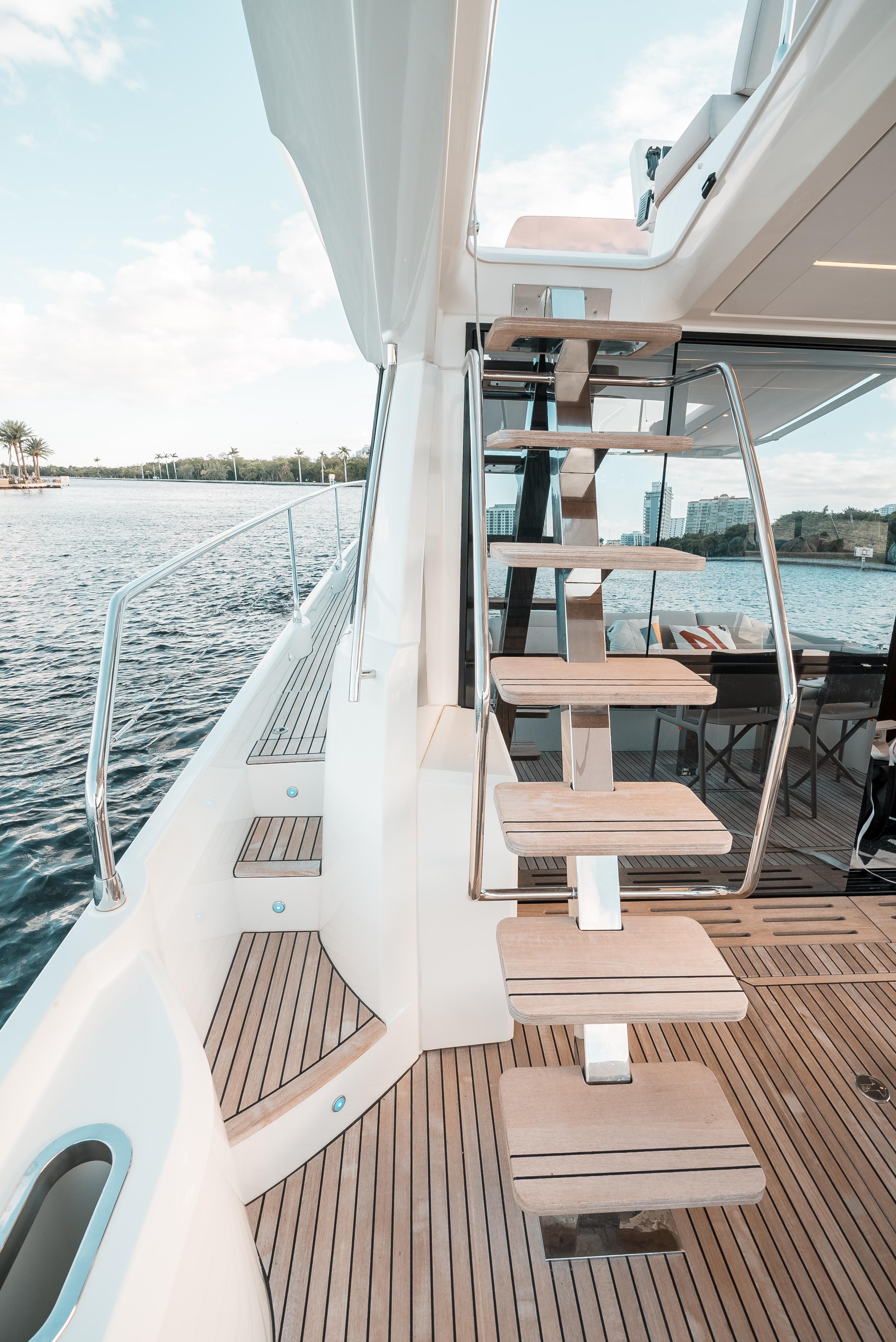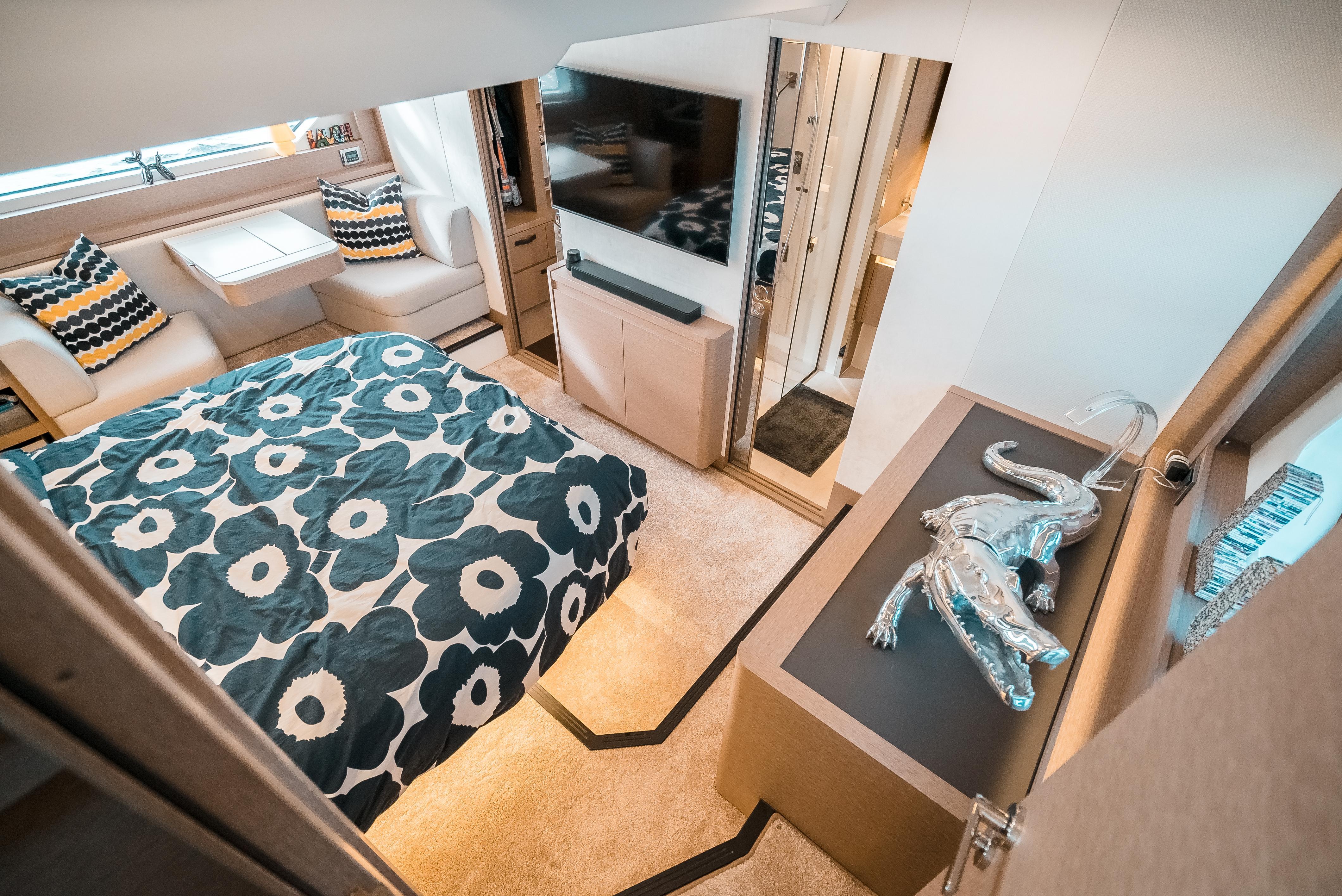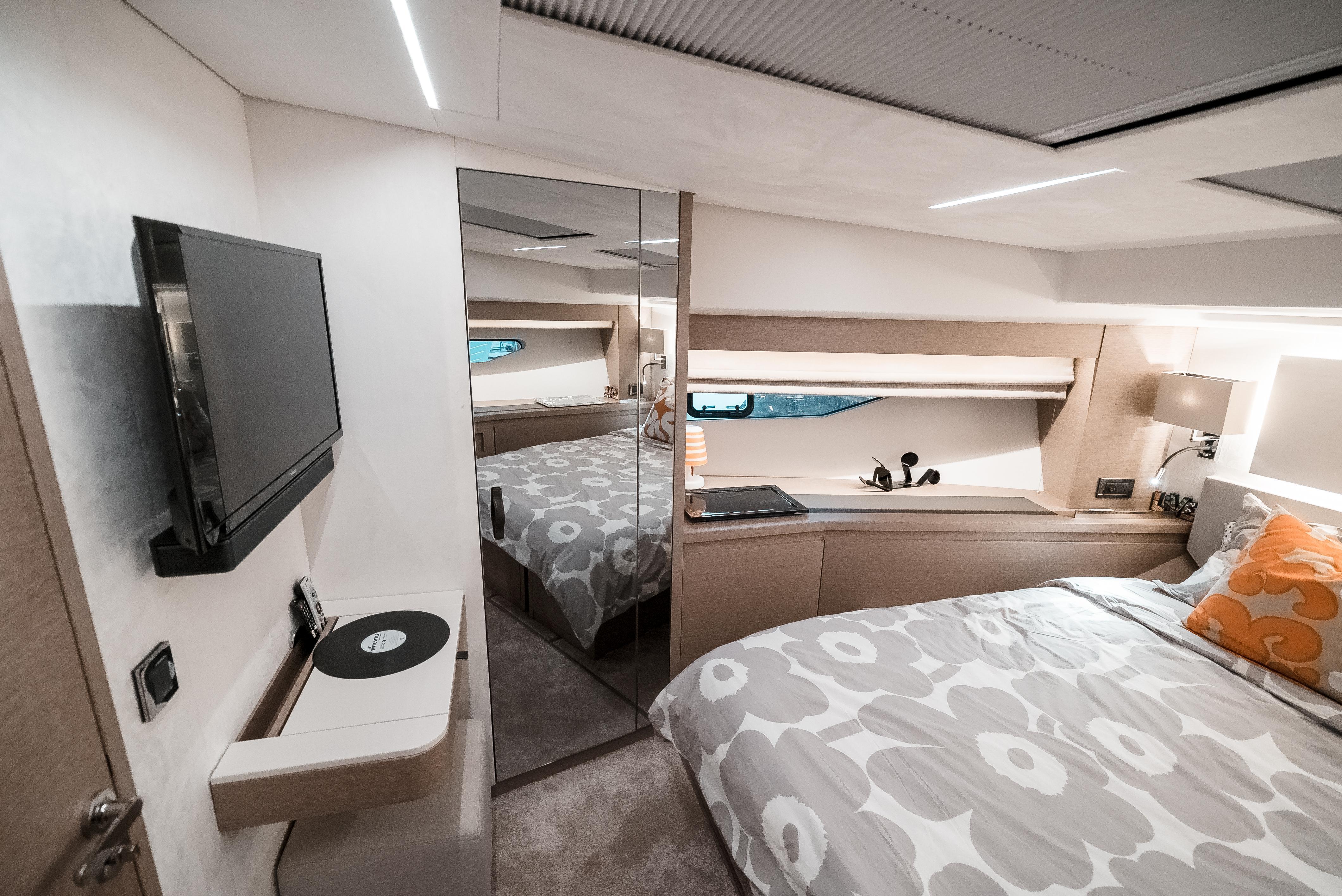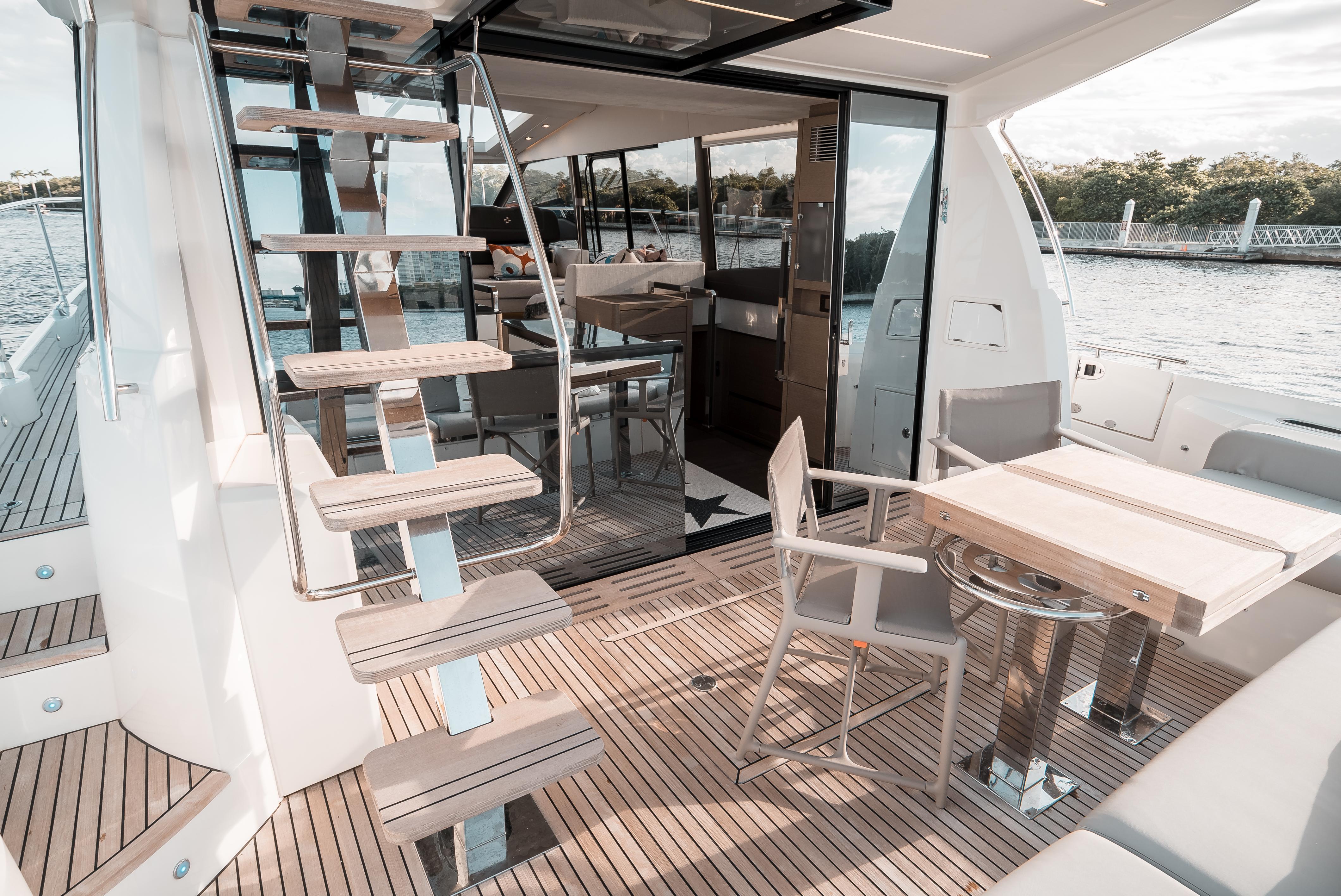 The Prestige 590S stands out with her dynamic and refined design by Garroni Design. Her powerful hull ensures reliable handling at sea. Immense windows feature prominently in the wide, elongated hull.