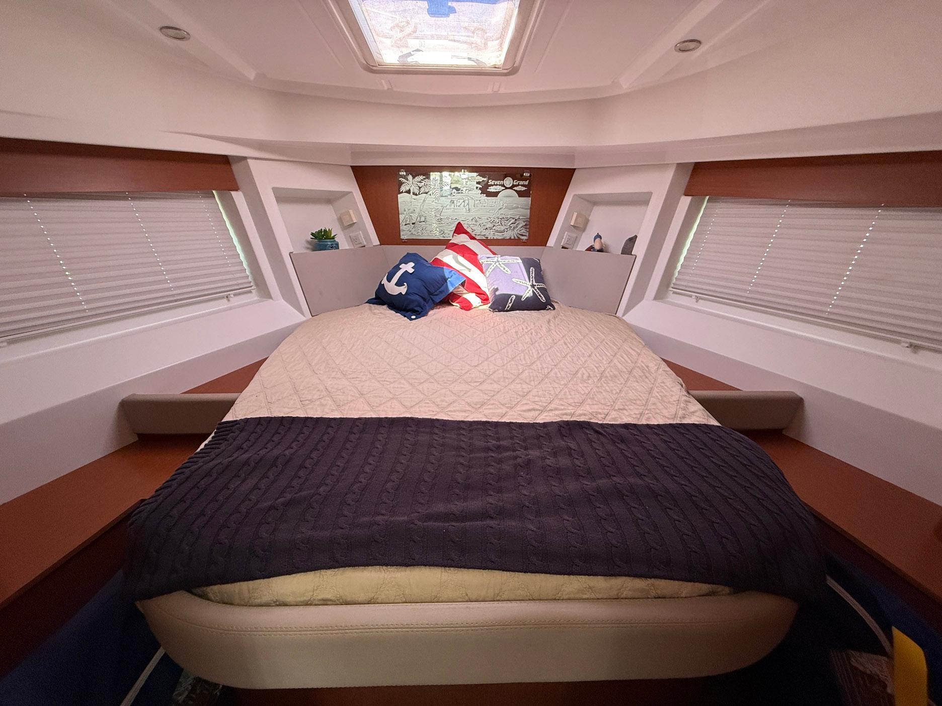 Forward of the galley and the lower helm on both sides just in front of the owner’s cabin are the head and the shower. The head has a solid sliding privacy door with a commode, sink, cupboards, mirror and port lights. On the opposite side is another solid door that will lead into a large comfortable stand-up fiberglass stall shower with a Teak seat. The owner’s cabin is forward with an inline bed. There is large storage under the bed and access to the forward cabin’s AC unit. The cabin has its own climate control. There are two closets. Both sides in the hull are port lights with pull-down blinds. The owner’s cabin also has a solid bifold door.