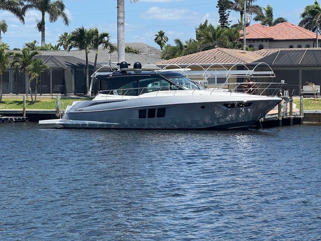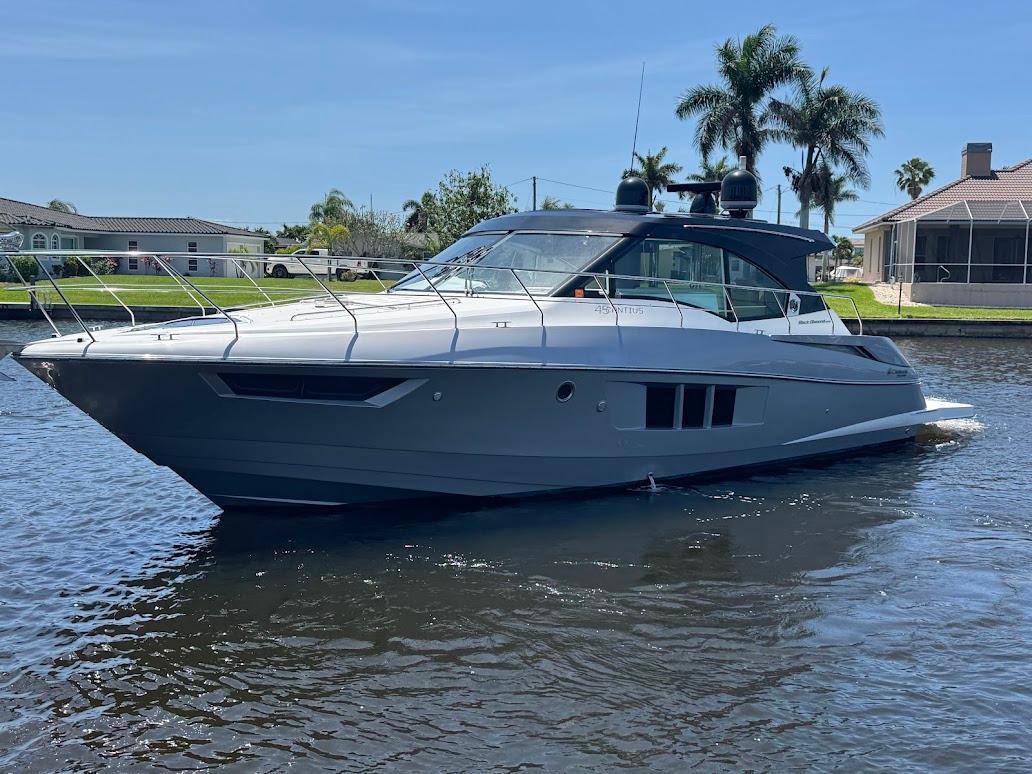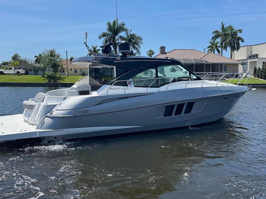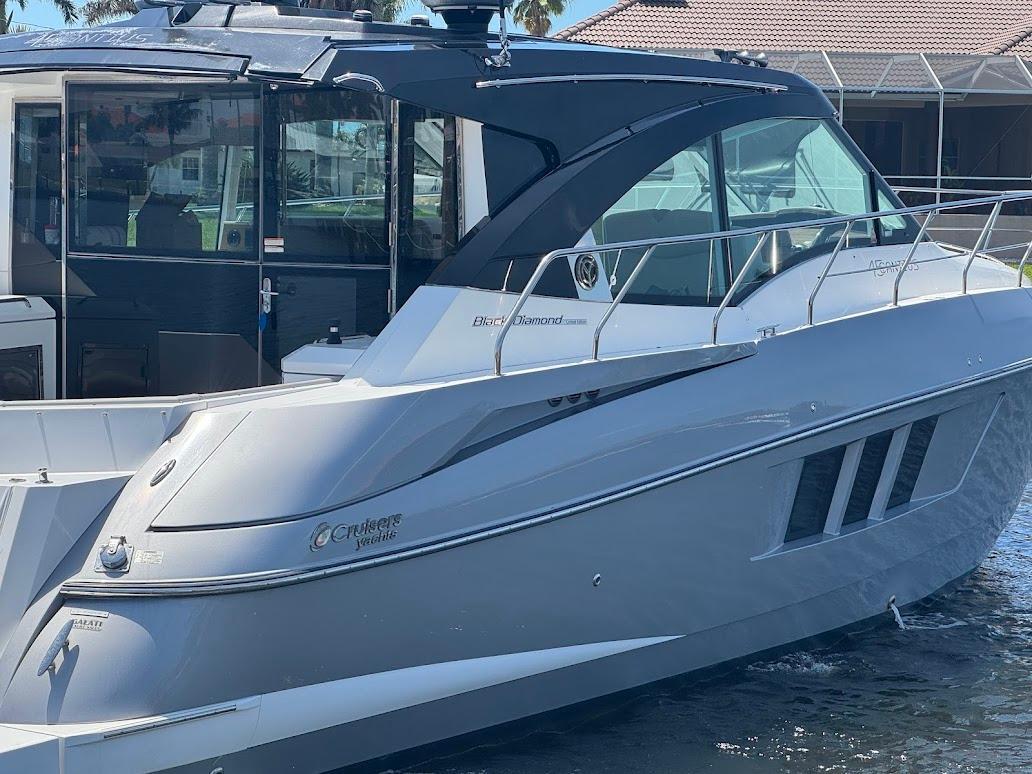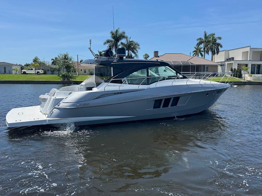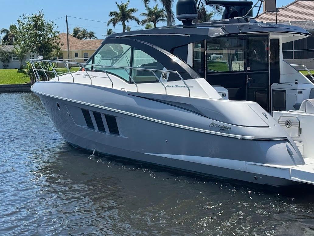 Introducing a 2014 45 Cruisers Cantius Black Diamond Limited Edition with about 750hrs on the recently serviced Volvo IPS D6 435hp pod drives with Joystick Docking and approximately 265hrs on Generator. Options include Hydraulic Swim Platform, Huge Power Sunroof, Dual 12" Garmin Displays with integrated GPS, Radar, and Autopilot. Cockpit features upgraded options including a grill, icemaker and refrigerator. Aft seating converts to a sunpad. Down below the aft stateroom situated with a queen berth and an additional full sized sleeping space that converts to dual recliners when not in use which is a perfect flex space for families if needed (as seen in the pictures). Forward is a full-sized berth with split hanging lockers and plenty of storage...and an en-suite dry head. With the smooth integration of lavish indoor spaces and the great outdoors, the remarkable 45 Cantius offers a seamless flow that feels refreshingly unlike any other on-water lifestyle. With spacious entertaining areas, a full glass enclosure and unprecedented sightlines, the 45 expands your experience beyond the horizon.Galley and HeadsGalley is conveniently located aft of the Salon with direct access to the cockpitSynthetic wood flooring in the galley for easy clean-up and water resistanceSolid Surface galley countersStainless steel microwave/convection ovenSide-by side under-counter Refrigerator and freezerStainless steel galley sink with combination faucet and pull-out sprayer(2) burner electric stove11 gallon hot water tank(2) heads, each with Dometic electric flushing toiletsBathroom vanity sinks with storage compartmentsRaised dinette for excellent visibilityAccommodationsCruisers Yachts makes the best use of space in their boats and the layout of this 45 is amazing, with storage space “everywhere”. Plenty of natural light flows through the large windows onboard, including a huge power sunroof and fully glass-enclosed Salon / Helm area that opens up to the cockpit. The Salon/Helm/Galley space blends seamlessly with the Cockpit to make this the Perfect Boat for Entertaining. Forward Queen Master Berth in private cabin with en-suite head/showerOverhead hatch with screen/shadeCedar lined closetExcellent storage optionsSpecialized lighting and overhead valancesAt the bottom of the steps is the common area, with day head access to the 2nd head and shower.central vacuum systemWasher/Dryer with dedicated laundry storageBright, open and spacious (with light from the Helm/Dinette area)The Mid-Cabin space in this boat is Simply Awesome! With an award winning design, there are Large hull side windows that lend to a very open feel.Lockable door for privacy when desiredPort side lounge/sofa (a perfect place for reading or watching TVStereo system, dedicated to this spaceFlat Screen TV (Sat/local) mounted on swing-arm mount for easy viewing throughout the space(2) Port side Recliners (that also turn into a 2 person sleeper)Aft double berth, capable of sleeping 2 adultsThe Master Stateroom is forward in the boat, and features a lockable door for privacy when desired. Tastefully decorated with specialized lighting and an over head valance. Excellent storage including a mix of hanging lockers, drawers and cabinets.Queen-sized, pedestal mounted bedcedar lined closetFlat Screen TV (Sat/Local)Dedicated stereo system for this stateroomHull side windows with wood blindsOverhead hatch with screen/shadeReading lampsEnsuite Head and showerDecorator-style bowl sink with combination faucetVanity with mirrored medicine cabinetStand-up shower with bi-fold glass door, niche' for shower items includedDometic electric flushing toiletMechanical ItemsReverse Cycle Heat/Air Conditioner (40,000 btu's)On-Board battery charging systemBattery IsolatorBattery Parallel switchBilge Pumps with automatic float switches and Hi Water Alarms(3) Carbon Monoxide detectorsCockpit engine room hatch (easy engine room access)Automatic Fire Suppression system13kw Diesel Powered Generator in sound shield (202 hrs) with remote start/stop50 amp shore power connectionCablemaster for retrieval of 50 amp shore power cordPrimary Fuel Filters with easy service accessAnchor windlass with helm and foot pedal controlsSplendide' washer/dryerCentral vacuum systemOil change system for engines and generatorExteriorBack-to-back cockpit seating, converts into a Sun Pad (with sunbrella covers)Hydraulic swim/dinghy platformPull-out swim ladderPort side transom gateSure Shade electric cockpit sun shadePort side cockpit grill and RefrigeratorStbd side Ice Maker and meal Prep SpaceCockpit stereo speakers(2) removable cockpit bar stools with direct access to Galley Counter/BarFull Glass/Stainless framed cockpit bulkhead, stbd side "dutch door"Overhead lightingFender/Dockline storage compartmentCockpit hot/cold showerWide sidewalk spaceForedeck Sun lounges with adjustable backrests and removable cushions (with Sunbrella covers)Removable Windshield screenWelded Stainless Steel bow railingAnchor Windlass with foot pedal controls at the bow(2) large windshield wipers with washerSteering SystemJoystick Control