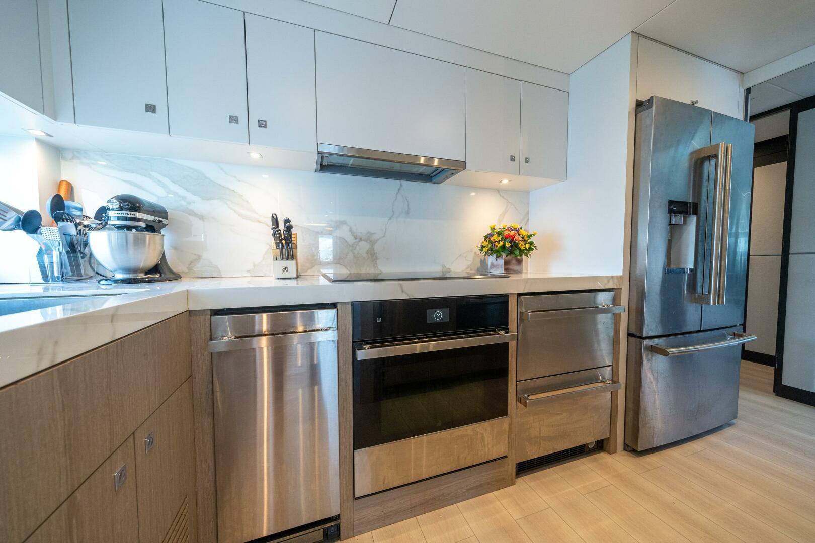 The galley is designed so it can either open to the salon for casual entertaining or closed for more formal service. There is a large double door refrigerator as well as extra refrigeration drawers, a full pantry, and dishwasher. (Note - an additional full freezer is located on the bridge deck.)