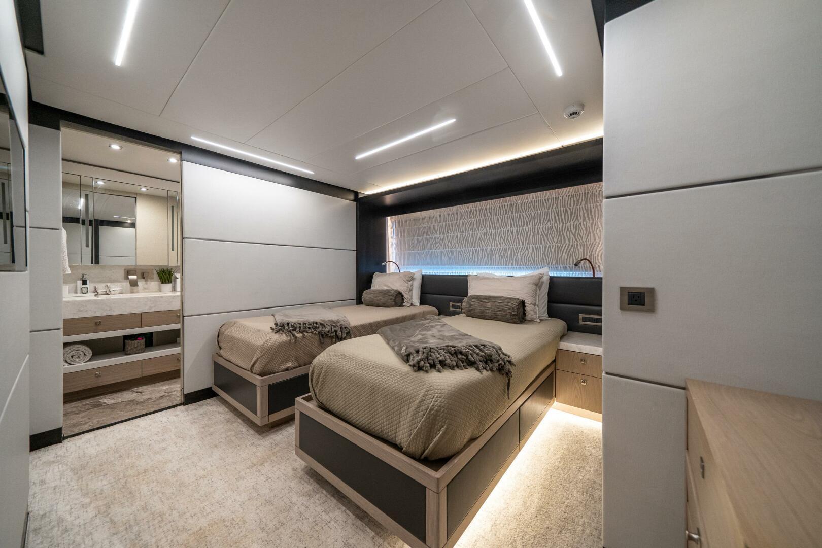The lower deck hosts two VIP staterooms. Each room offers a queen-sized bed, tastefully designed interiors, and ensuite bathrooms. These staterooms ensure that guests experience the same level of comfort and luxury as the owner. Additionally, the lower deck includes another very large guest twin-stateroom with en-suite head and shower. Finally, a unique feature to Day One’s lower deck layout is the inclusion of a full gym workout room and large walk-in pantry with storage and washer/dryer setup.