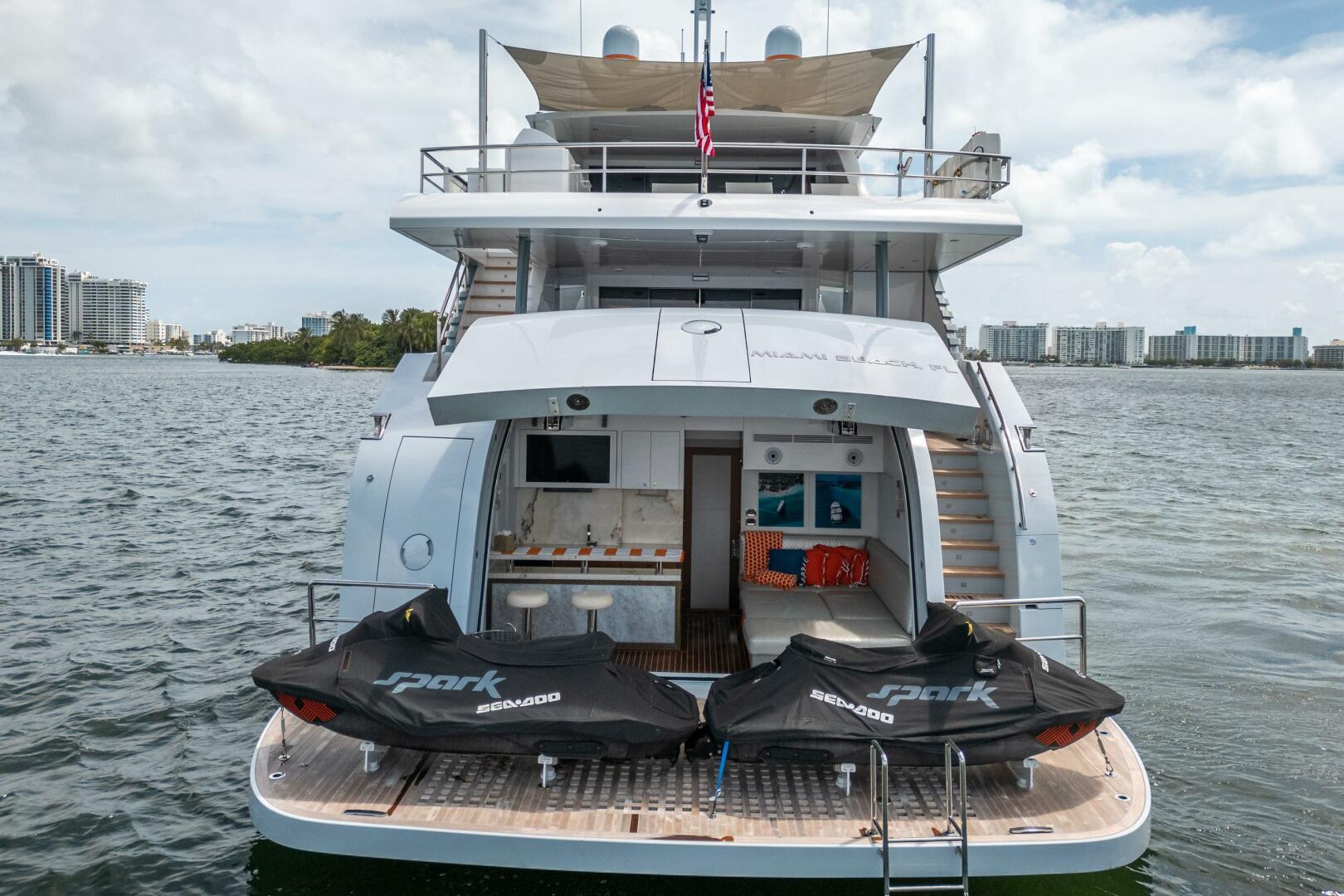 As you board the yacht from the aft, you'll land on the spacious swim platform. This area has dual purposes; it’s perfect for launching water toys and accessing the water, and it also serves as an initial boarding step.