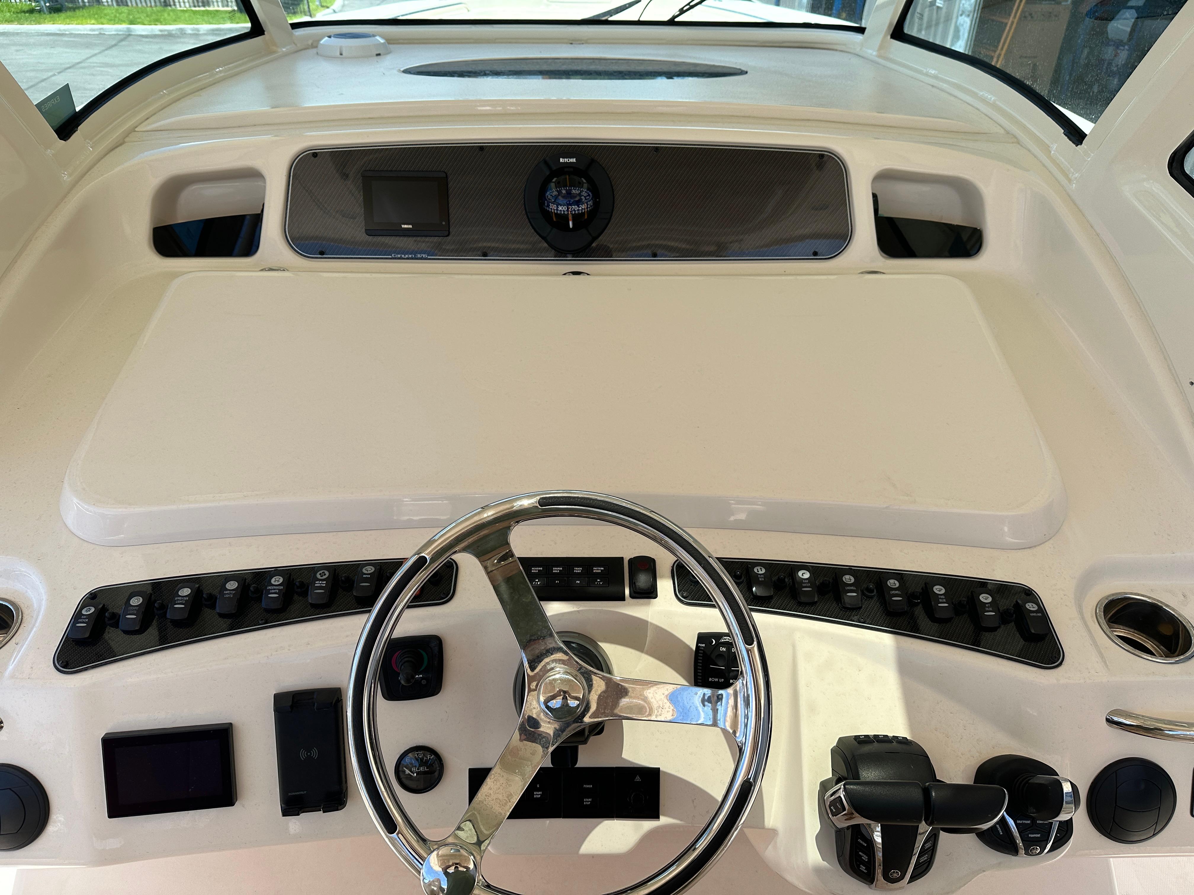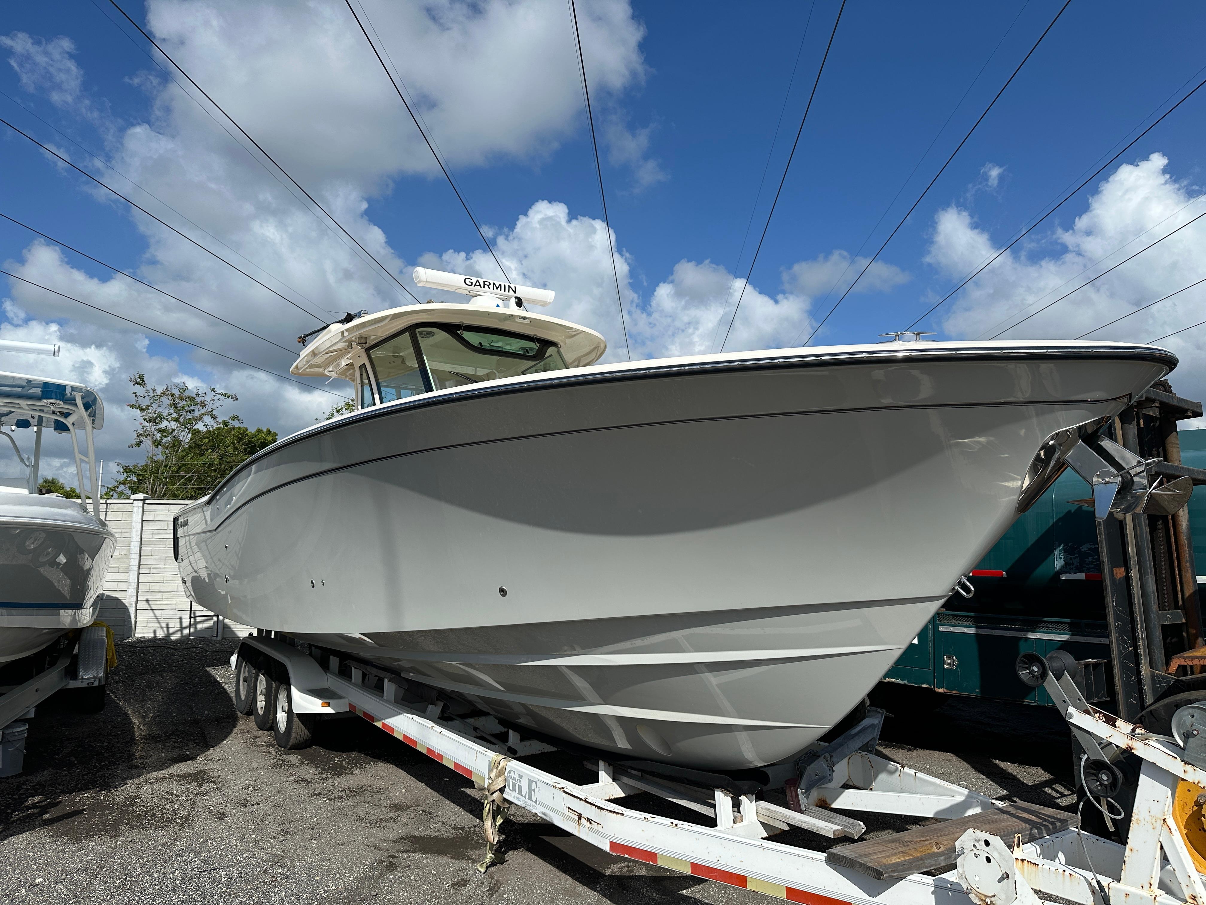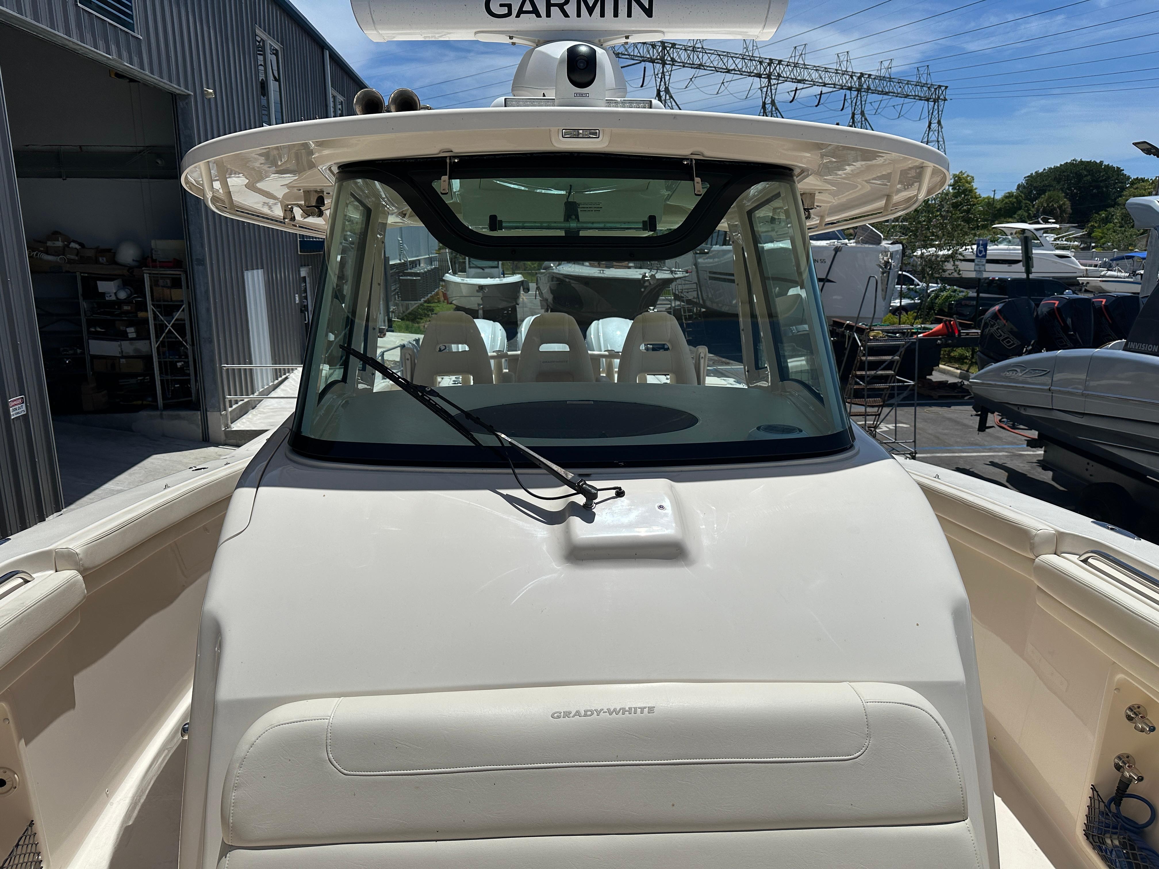 This 2023 Grady White 376 shows almost new. No bottom paint, vessel was indoor rack stored.Agile, fast, and beautifully styled, the Canyon 376 combines the advantages of a big center console fisherman with the cabin comforts of a small express. The 376 comes loaded with quality features that help justify its premium price including a wraparound windshield with power vents that open for ventilation, a bow thruster, and an integrated T-top with a radio box, storage and LED lights. The electronics console can be fully concealed at the push of a button, impressive from just a security aspect alone. Aft of the helm seats is a deluxe leaning bar housing a 41-gallon livewell, tackle center and an insulatedcooler. Below deck (through a starboard door) is tastefully finished cabin with a VacuFlush head, shower, TV, mini-galley, and a lounge whose backrest lifts electrically to reveal a berth for two adults. Inthe cockpit, the rear bench seat folds away for added fishing space, and there are toe rails in the cockpit sole for added stability when fighting a fish. Forward of the cabin is a bow lounge area with amotorized high/low table.