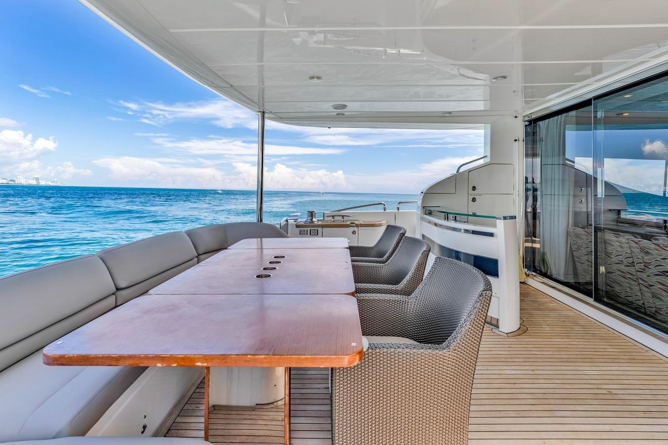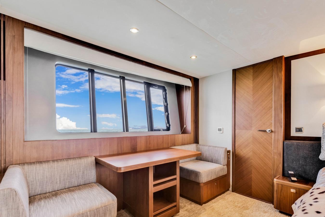 - Sliding glass aft doors leading to/from aft deck with the standard layout, including a good-sized Salon with good seating and storage