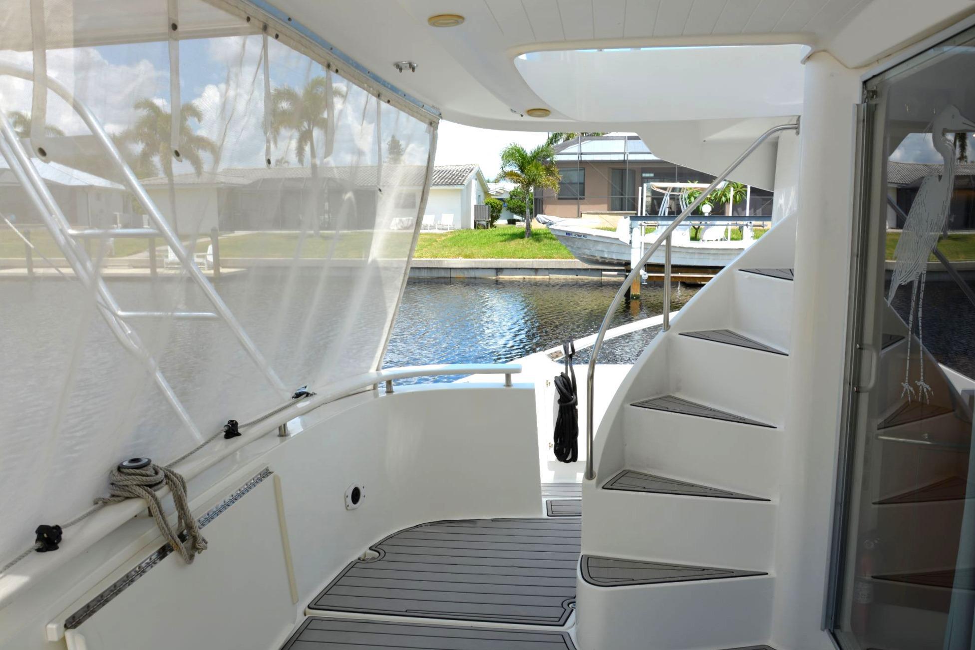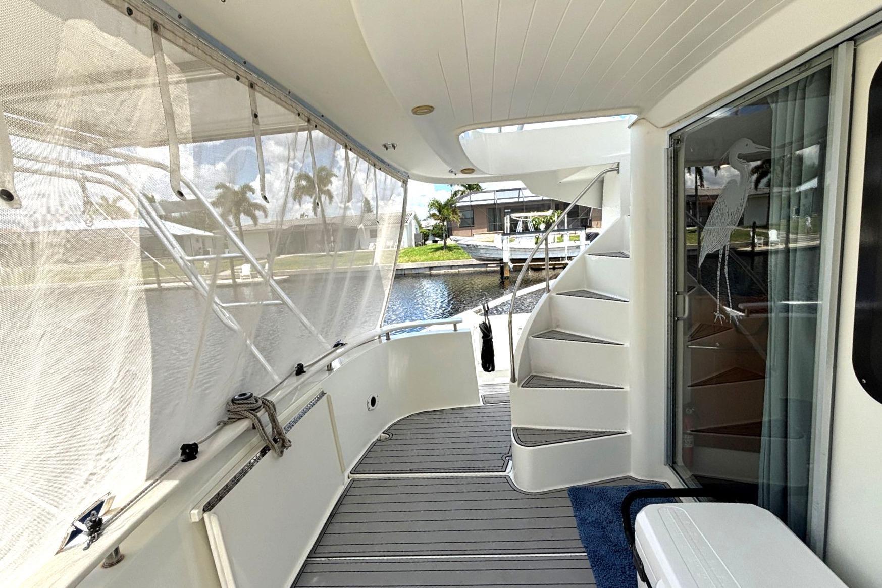 Flybridge has full fixed aluminum frame with Stamoid Material over upper helm and salon (recently removed cleaned and restrung)