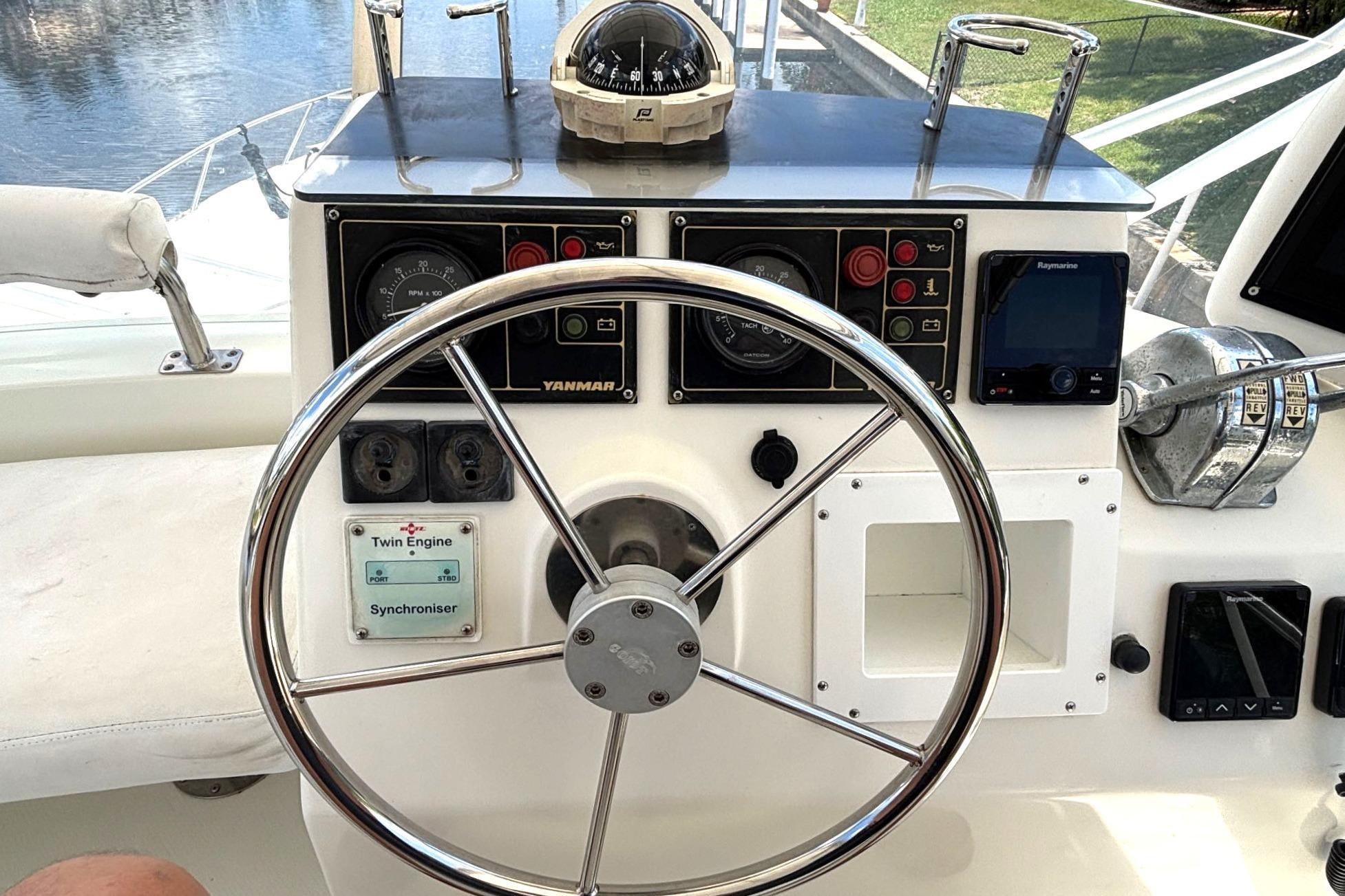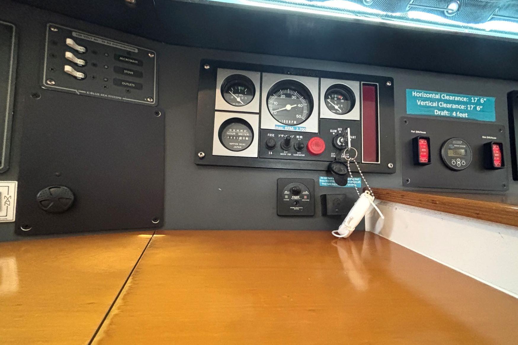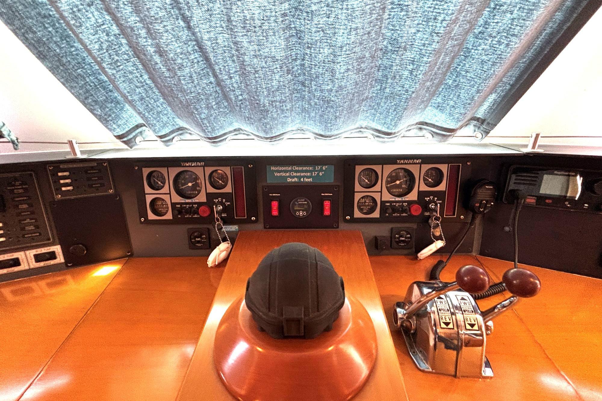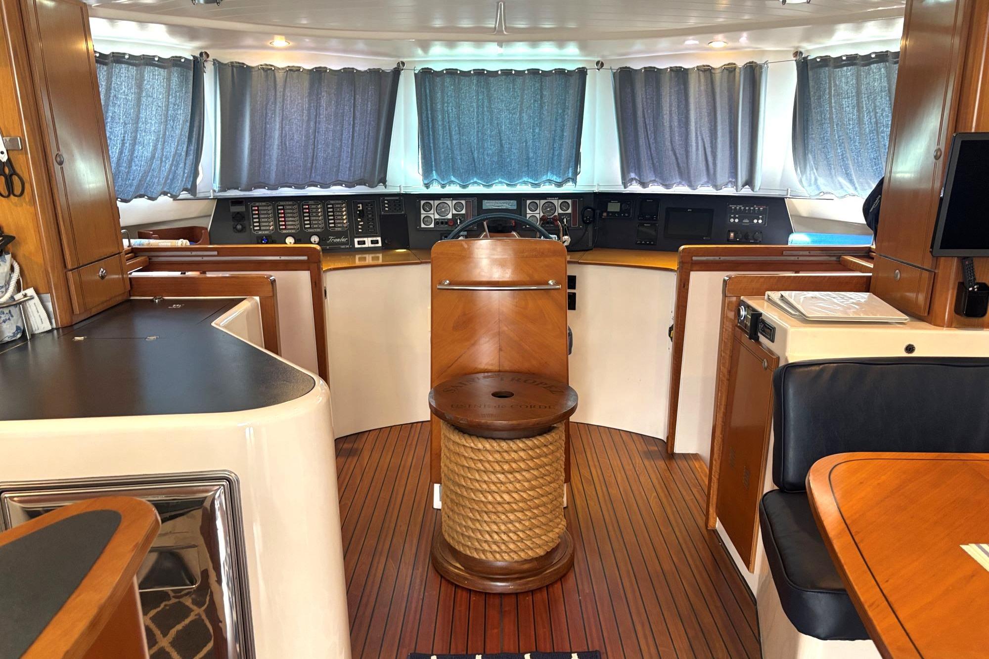 Inside HelmWith long distance cruising in mind, the inside helm station is much more functional than most. The sightlines from the captains chair are unrestricted while the large windows to port and starboard make docking, even from inside, simple. Features include opening forward windows when a little extra breeze is welcome, centerline windshield wipers when it’s dreary, and reverse cycle climate controls for the warm tropics or brisk fall mornings. Monitoring and operating the boat is all done at your fingertips with dual engine panels and throttle controls, tridata instrumentation, autopilot, windlass controls.