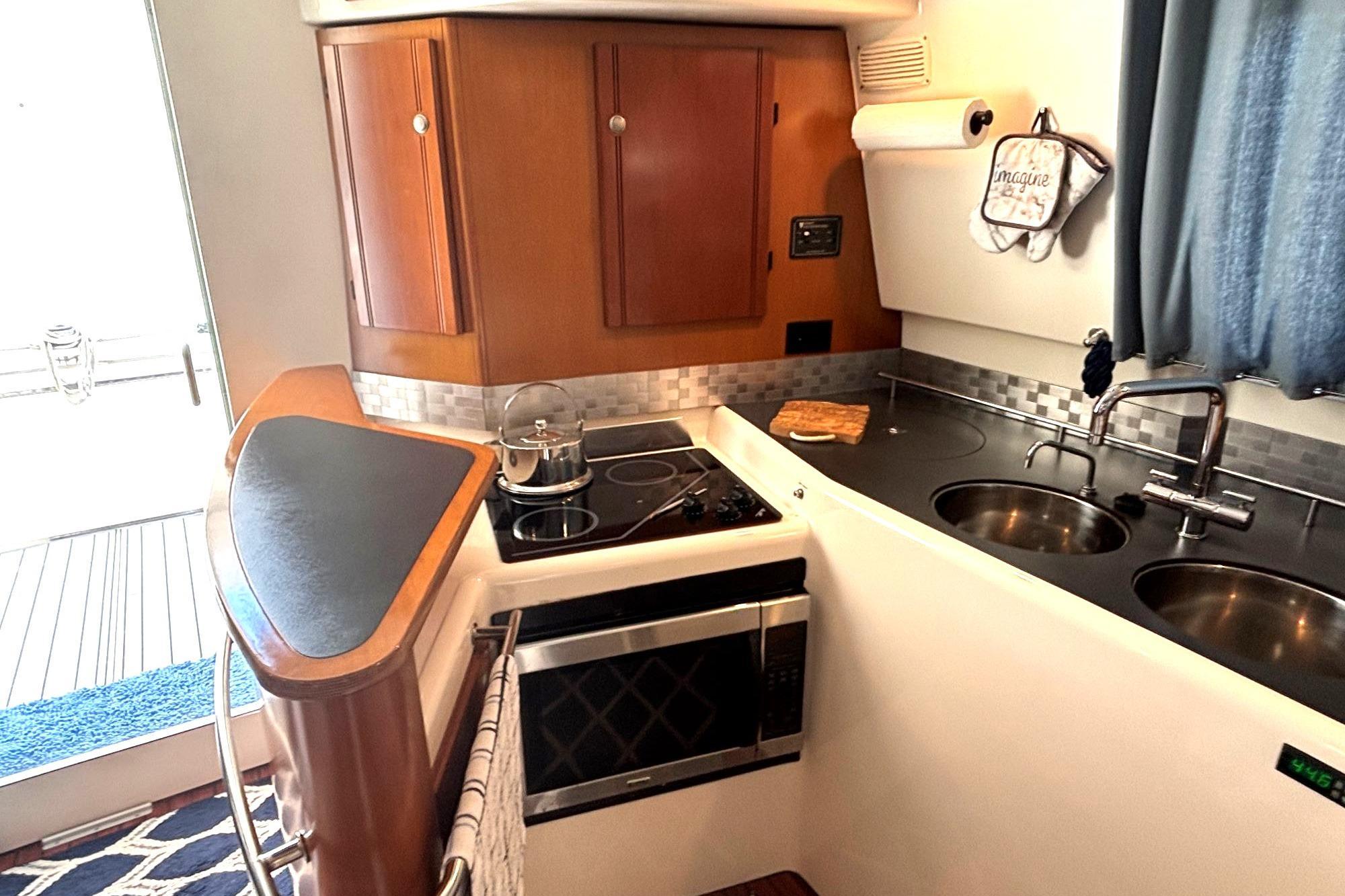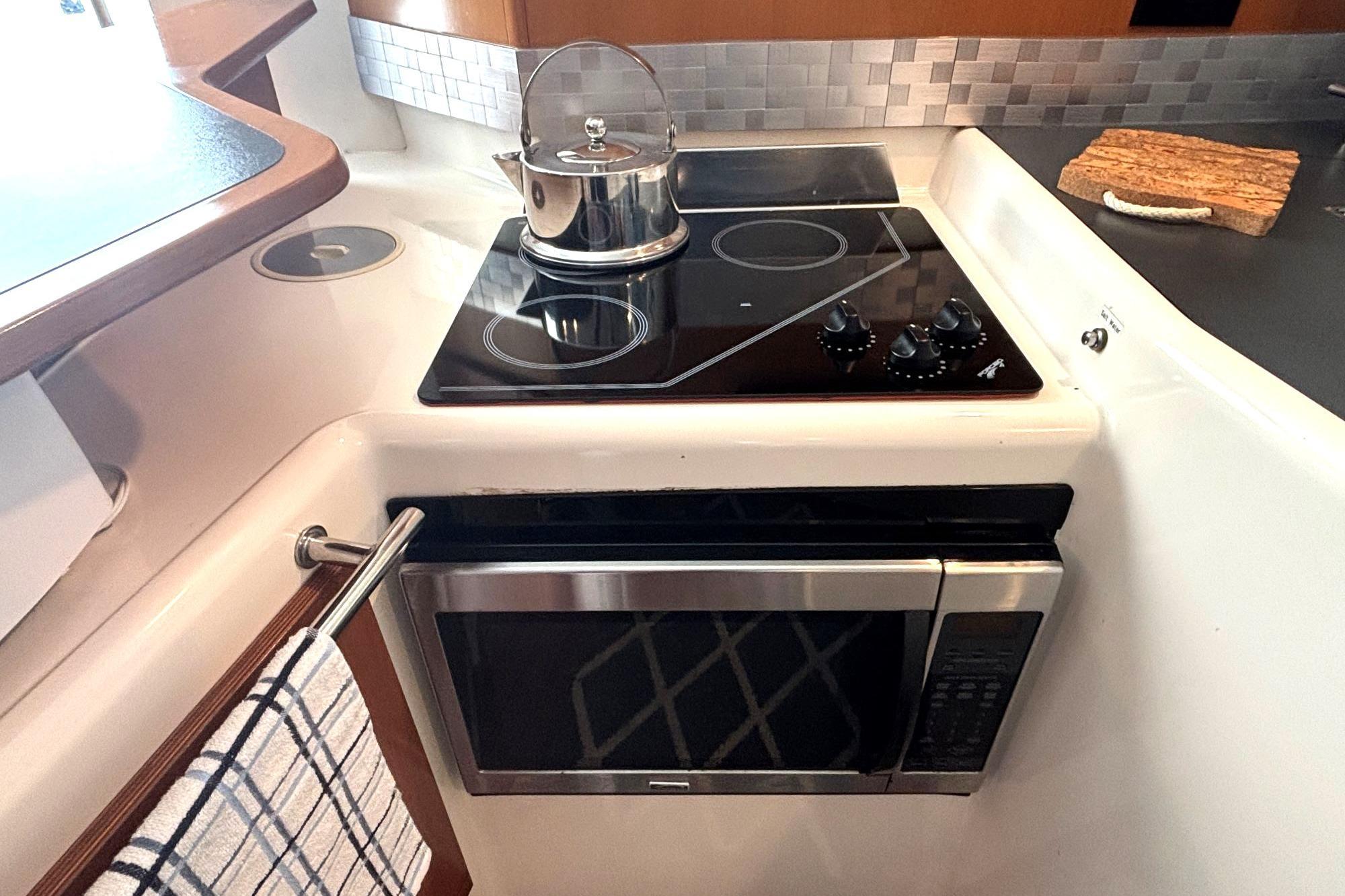 Comfortably seating 6 adults, the wraparound lounge with table is the center of it all. Adjacent the galley for interactive dining, open to the aft deck for entertaining, and within easy chatting distance to the helm station, the main salon is where you’ll spend many hours of relaxation and enjoyment. Flanked by large panoramic windows, the natural light is abundant and pleasant, yet shades can be drawn to cut down the afternoon sun or add privacy when desired. The lounge is raised just enough to ensure an eye-level view when seated and is long enough to stretch out, perfect for a nap or a good book. The 12VDC Hella fan, opening forward windows, and large sliding glass door to the aft deck bring a cool breeze through the interior, but when that’s not enough, enjoy the chill of the 16,000 BTU reverse cycle air conditioning,