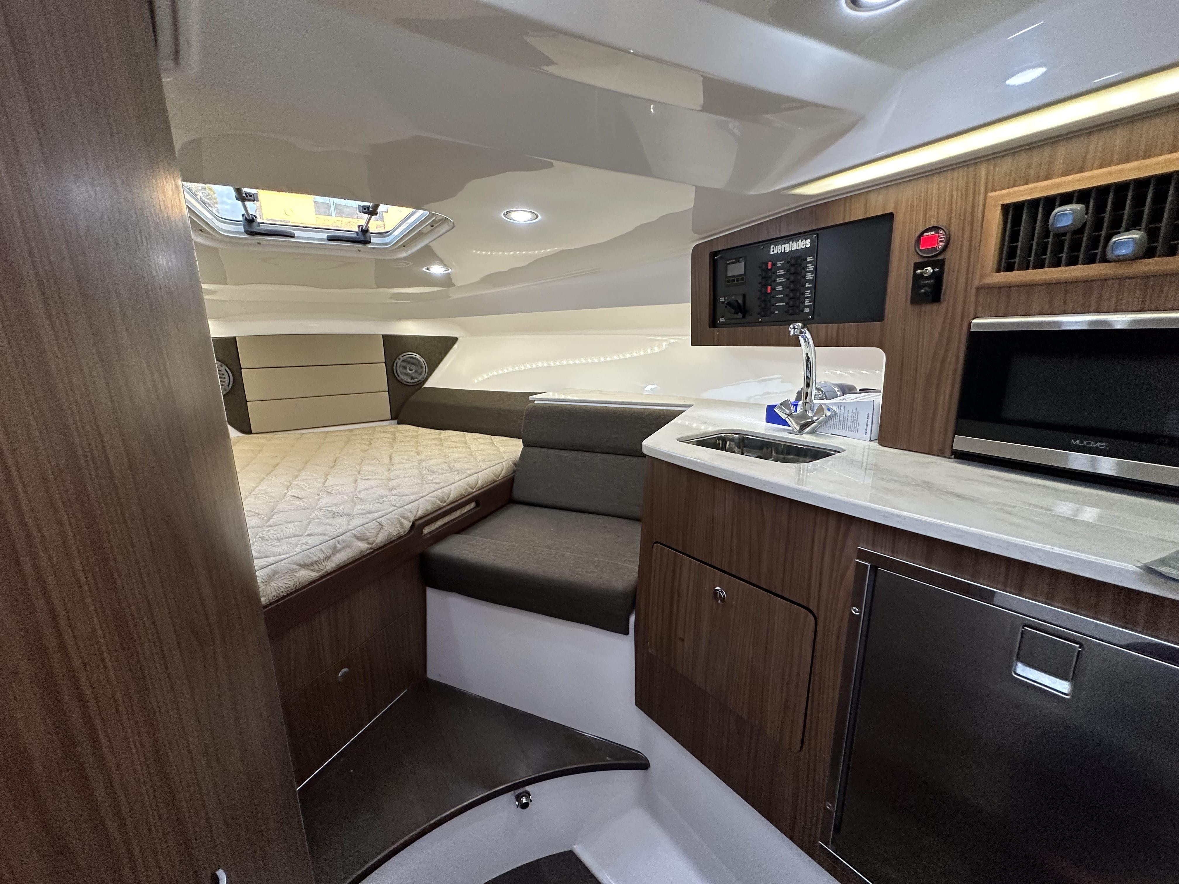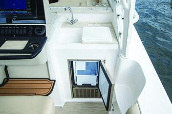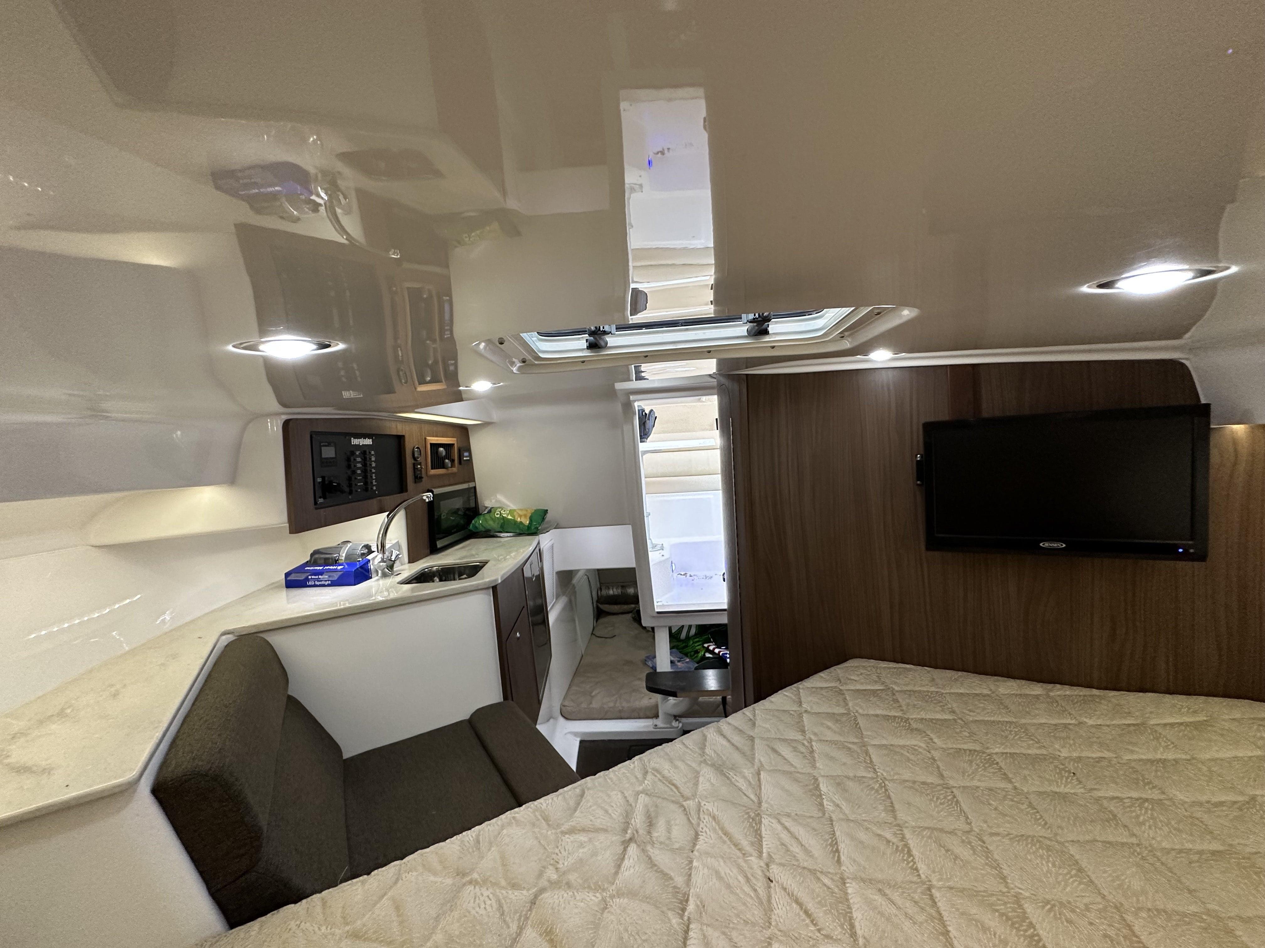 In the creation of the 36-foot overnighter, we honed in on extravagance and relaxation, while maintaining our signature fit and finish. Your guests will be more than comfortable in the spacious 100-square-foot lounging area, featuring an L-shaped lounge that serves as dining area or sun-bed. The 360LXC comes standard with a 32-inch retractable flatscreen in the lounge area, an electric stovetop and outdoor cockpit cooking area, abundant food and cooler storage, and a fully equipped wet-bar and mixing station. Its massive aft bench seat comfortably seats six while the redesigned helm featuring ergonomic captain and companion seating has plenty of room for three. The boat easily sleeps five to six passengers. Both the cabin and the cockpit-lounge area are independently temperature controlled to keep you comfortable in any weather conditions.