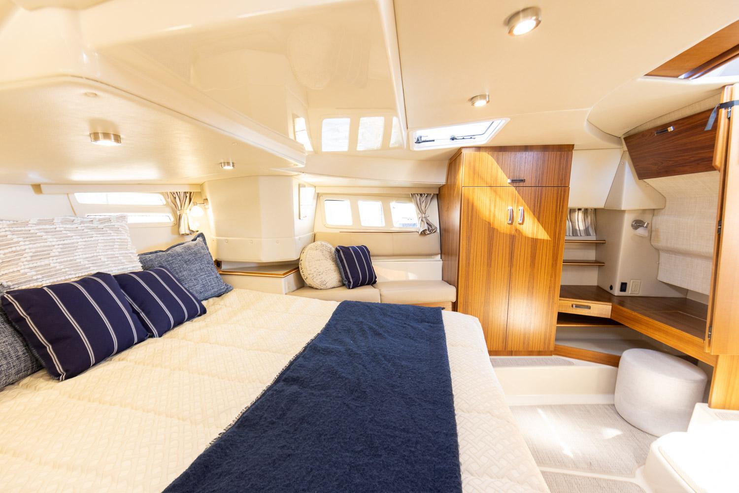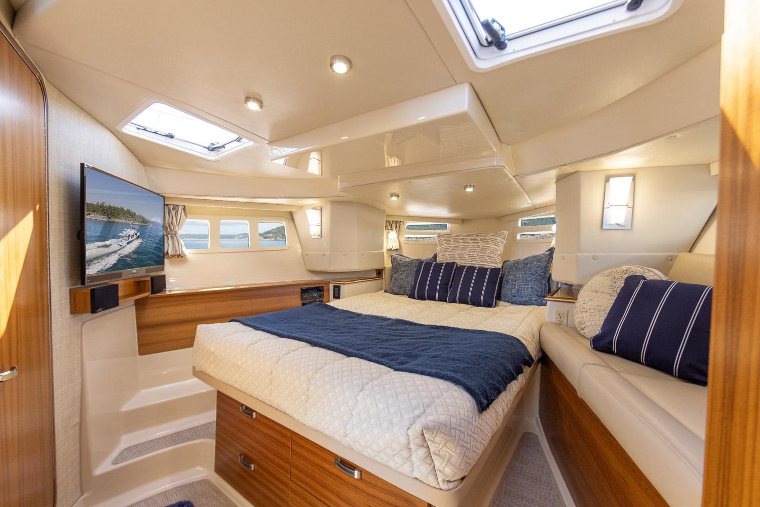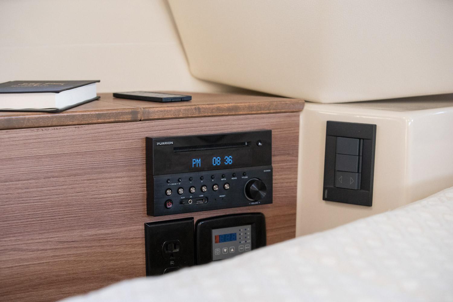 Air conditioning, 3 unitsAtrium skylightsCabin drink holders, 3Clothes washer and dryer, full-sized Curtains and blinds for privacy Dinette (seats 6) converts to bed Fully enclosed heads. Fusion stereo system (multi-zone) Hatches, pilothouse roof, solar reflective, 4 Hatches, stateroom, 2 Heater, AC reverse cycle Indirect cabin lighting Island bedLED lightingElectric marine toilets w/ holding tank, pump out Midship stateroomOpening portlightPrivate forward stateroom Shower with enclosure Storage under mattress TV in salonTV in stateroomUtility room with storage, refrigerator, freezer
