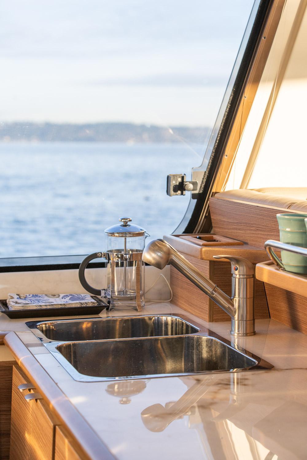 Butcher blockGalley cabinets, 2Galley drawers, 6MicrowaveOffset galley for clear walkway Oven, propane Pantry/storage, in-floor Refrigerator/freezer, 2Sink with hot and cold water, double-basin, with pull-out rinse faucet Stove top, propaneWine/water cooler