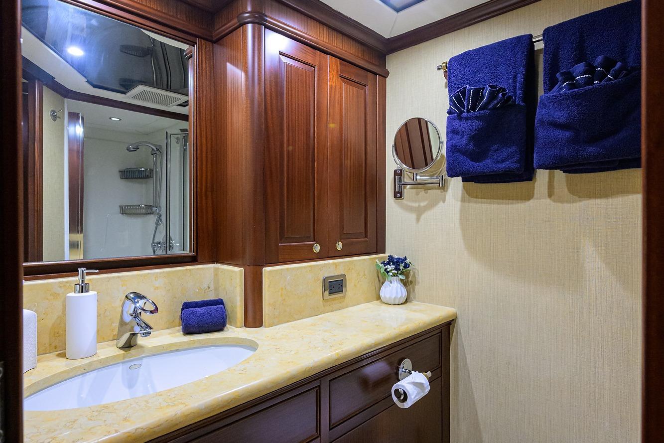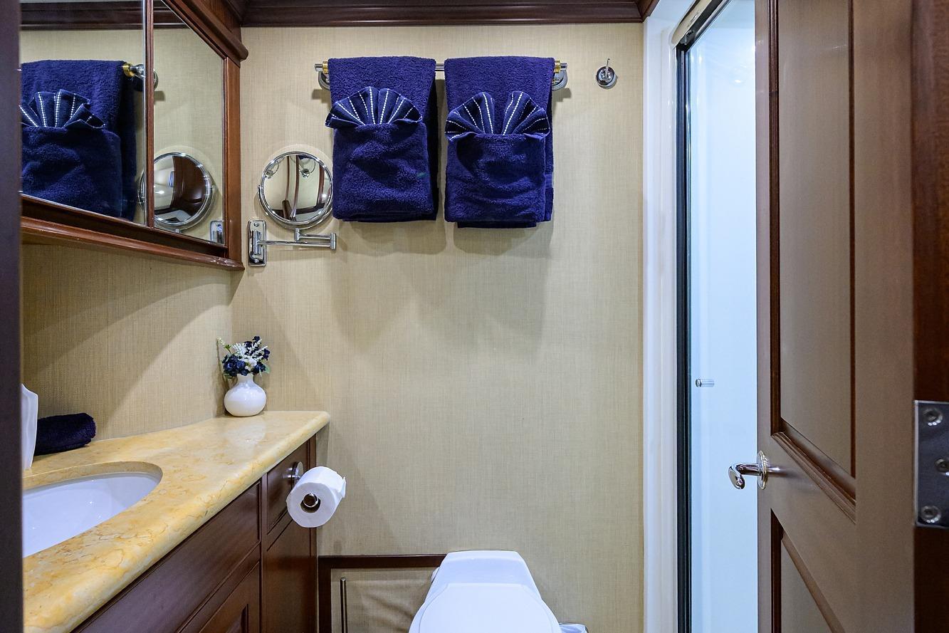 The Master is accessed from the forward starboard corner down a large staircase that only serves the master stateroom for privacy, typically on yachts much larger. The Master offers a full beam master which has the volume of yachts 110-120 feet. On centerline is a California King Berth with ample storage below and night stands on port and starboard with large walk in closets just outboard of the night stands. On Port and Starbord you have vast clothes drawers with large stainless steel port lights that offers natural light into the entire stateroom.