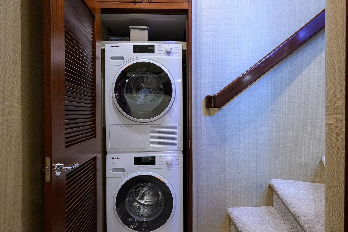 The Master Stateroom has it's own private staircase which is wide, curved and comfortable with a landing at the bottom outside the master's stateroom. At the bottom is access to the owners private clothes washer and dryer with laundry storage above.