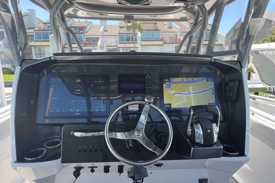 This 39 SuperFish by Nortech powered by three Mercury Racing 400 with few hours is the ultimate cruising / fishing machine and only 1 of 3 equipped with a custom tower complete with upper controls, Garmin GPS and VFH! Reach your favorite fishing destination cruising at 50 mph, or spend a day at the beach on this sexy machine. INCLUDES: 2 LIVE WELLS, FISH BOXES AND ROD HOLDERS.