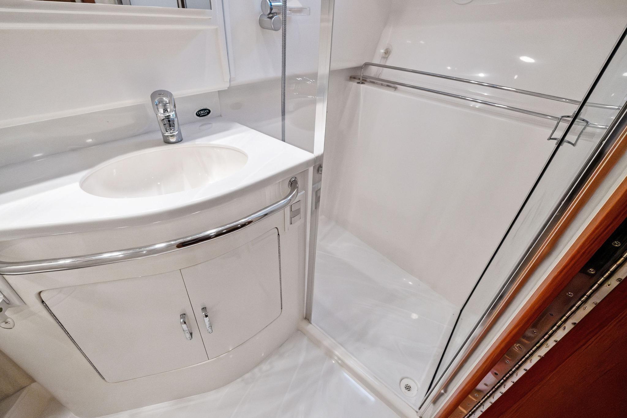 - Head: Vacu-Flush marine toilet, separate stall shower, Corian vanity top, mirrored storage