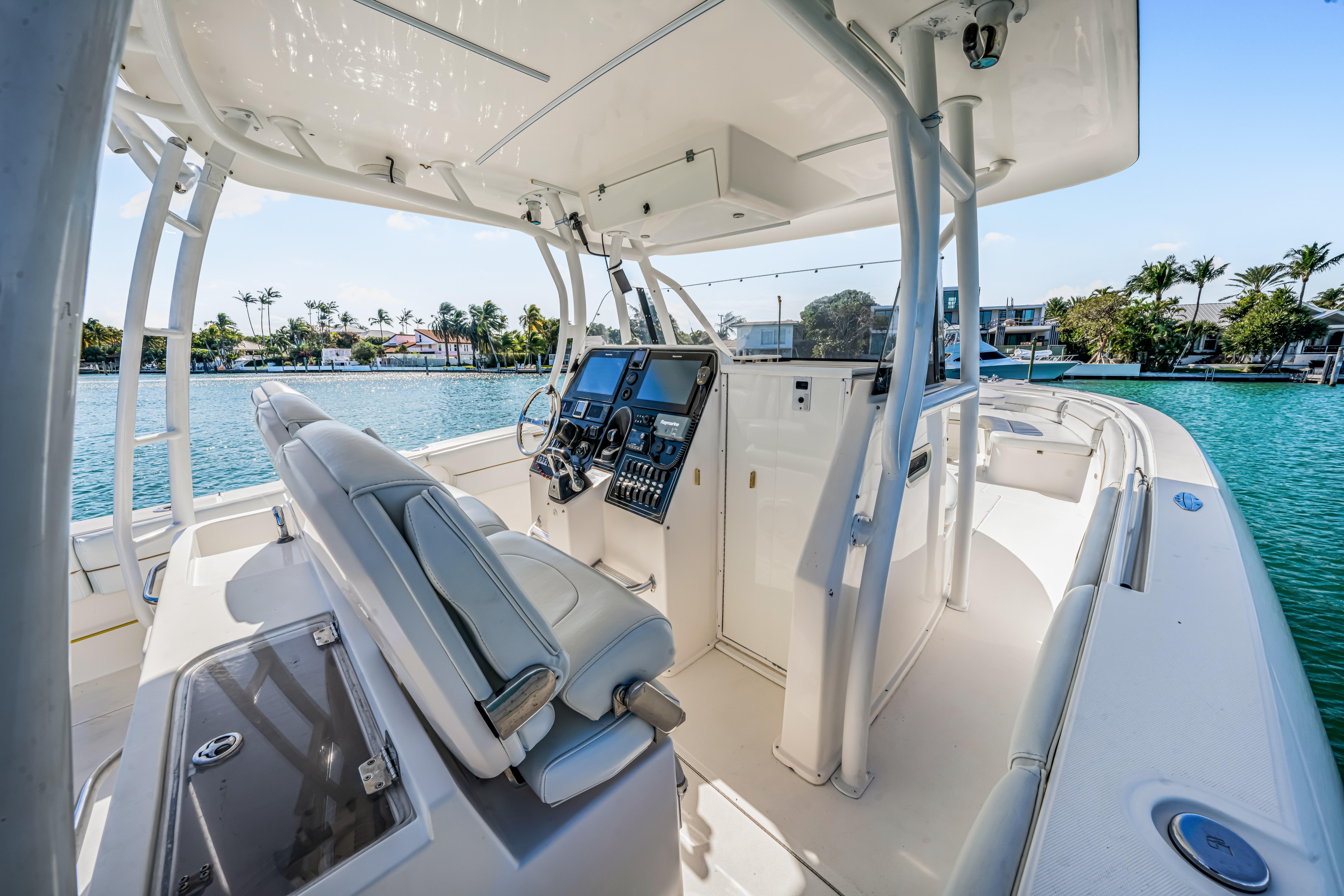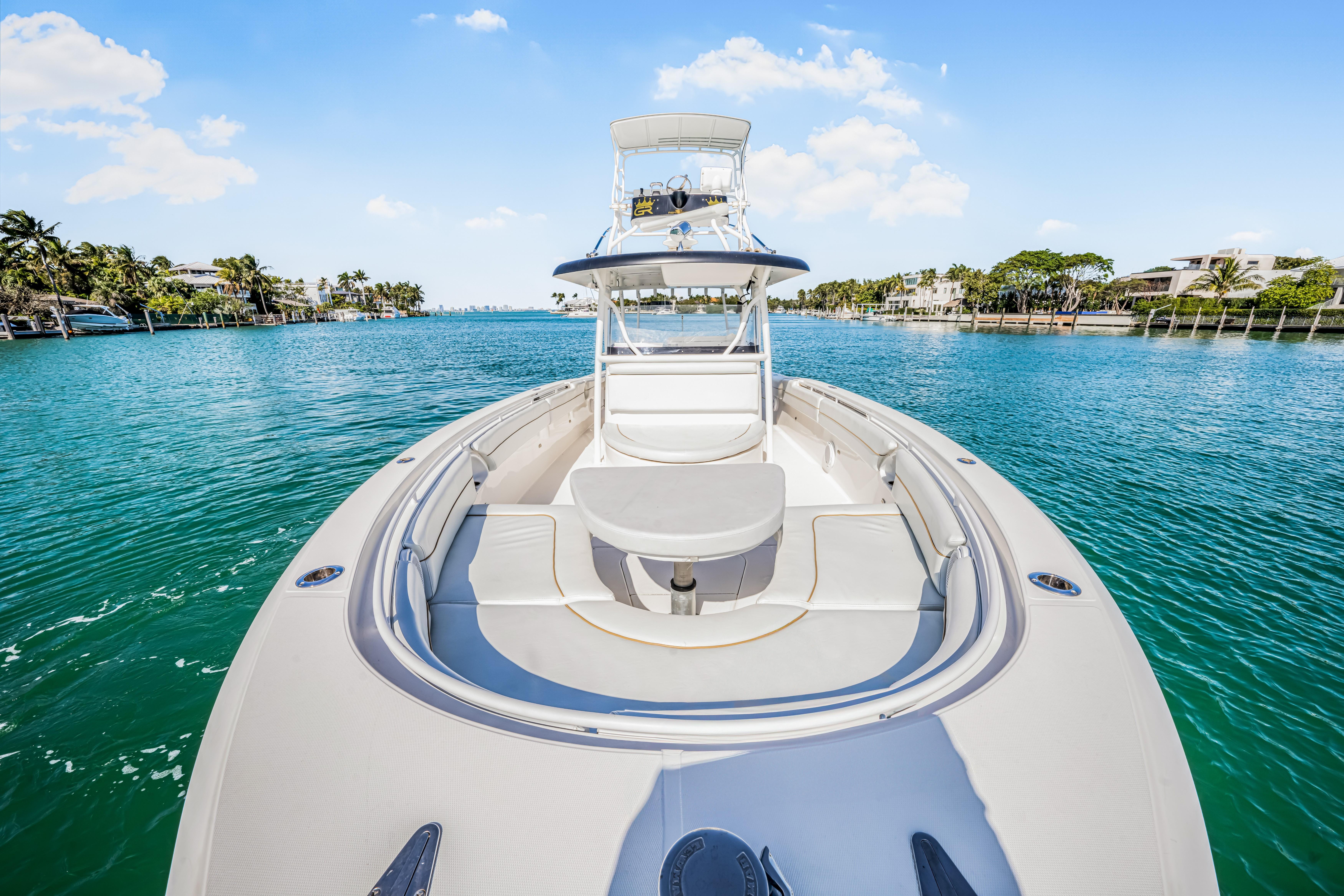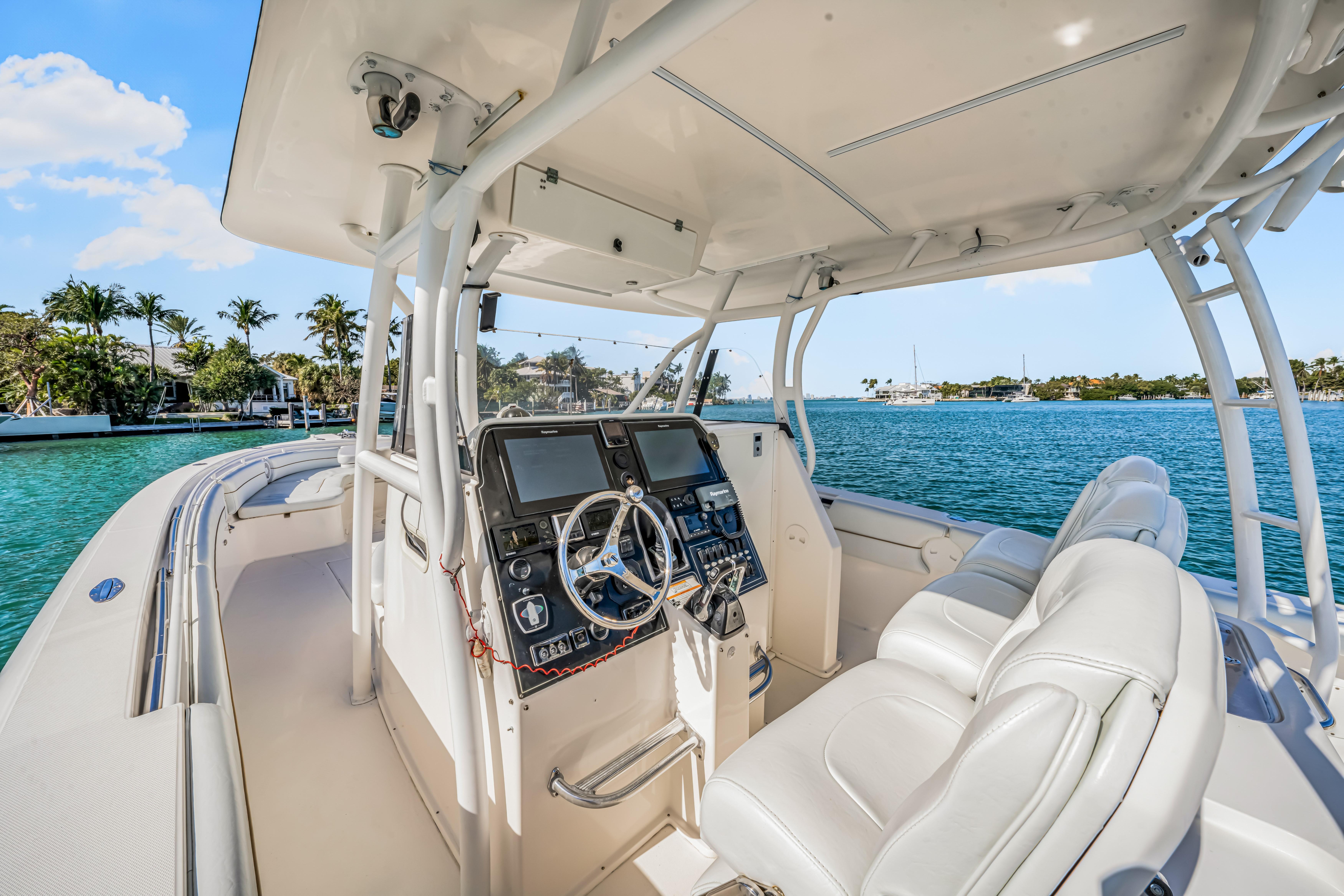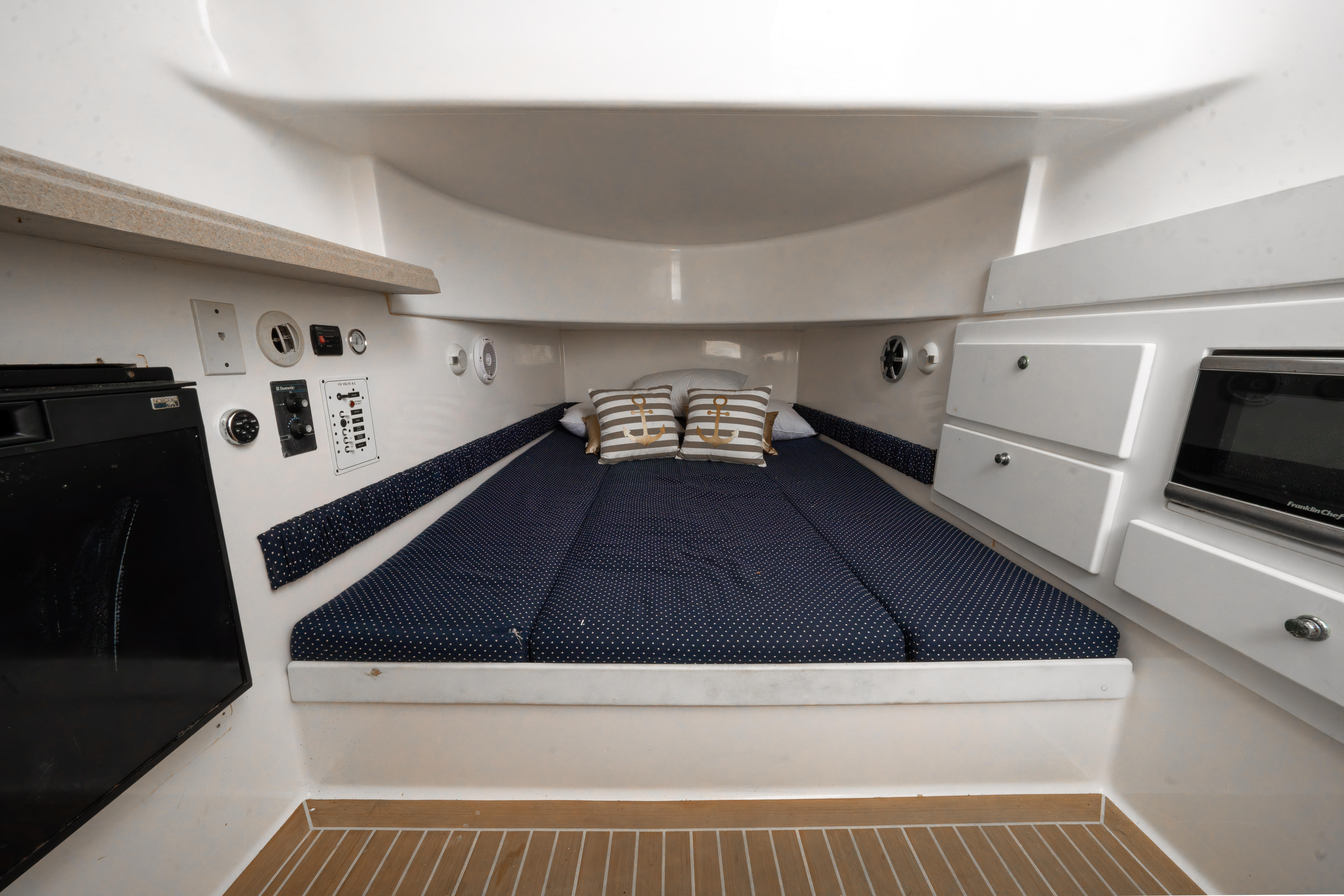 TOP FEATURESRaymarine GS165 16 inches Hybridtouch Raymarine Radio Raymarine Radar Optimus 360 Joystick Bow Thruster Livewell 2 Microwave Proscan TV Norcold Fridge A/C Windlass Electric Toilet JL audio 8 Speakers 2 SubsTuna Tower 390 Tarpon is pure adrenalin for serious sports fishermen. Your choice of twin or triple outboard engine packages will get you there quickly while the legendary Stamas ride will make it comfortable. The large fuel capacity provides plenty of range, even with the biggest outboards. The Tarpon is loaded with fishing features including a combination leaning post and bait station with freshwater sink and recirculating livewell, three insulated overboard draining fishwells and numerous tackle drawers. Built around a center console style layout, the interior fish-fighting space is extremely generous, cleverly laid out and offers unobstructed 360-degree mobility. Particularly noteworthy is a multi-position bow configuration that converts from a lounging pad to a dining area with a pedestal-supported table, to a full deck casting platform. An additional sun pad is forward of the helm station. Whether it’s that extra shuteye for the ride to the fishing grounds or the space your family will claim as their own during day trips, there is no shortage of relaxing areas. This is a true overnight boat as well. Below the deck, is a full-size queen bed, built-in microwave, refrigerator and convenience head.