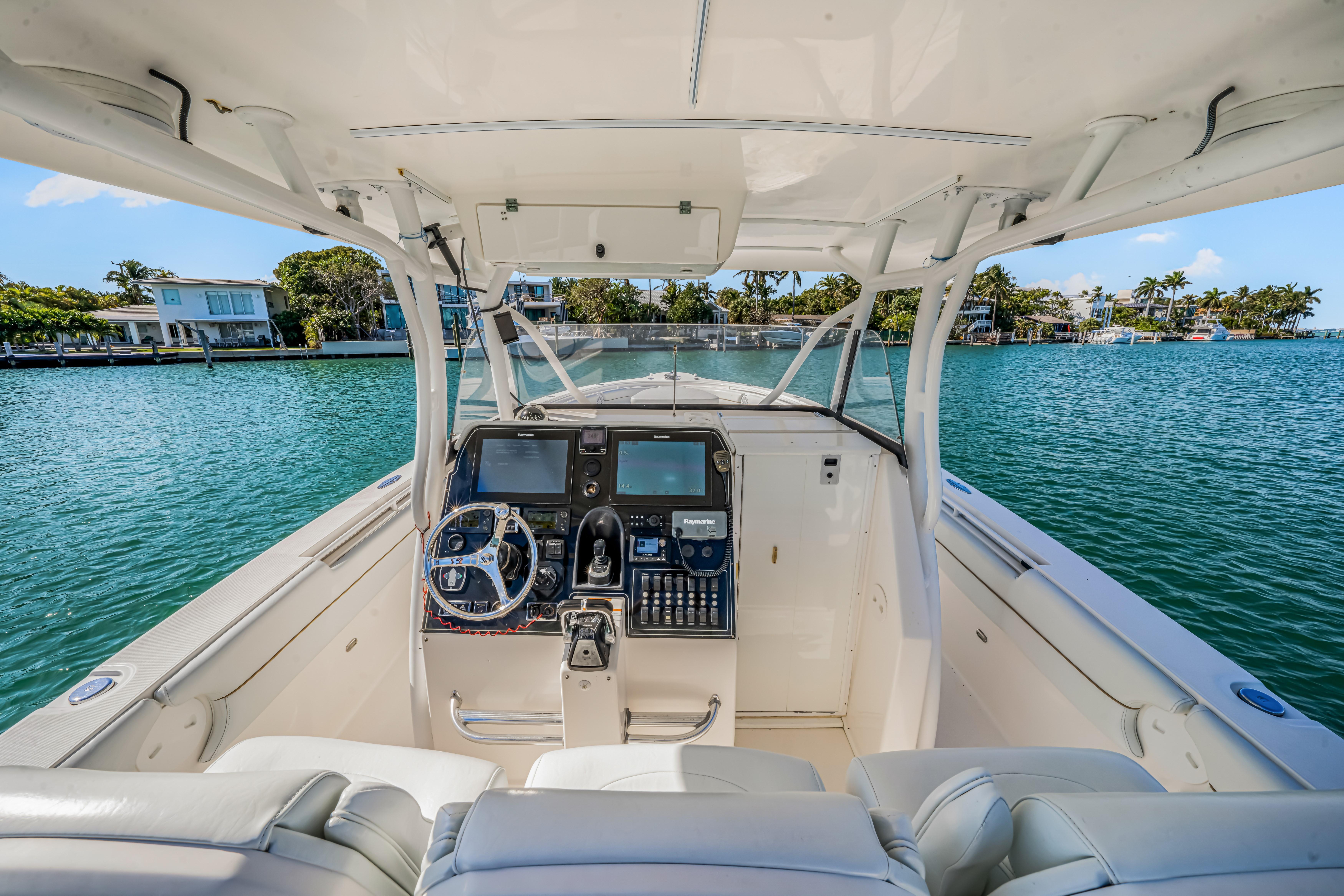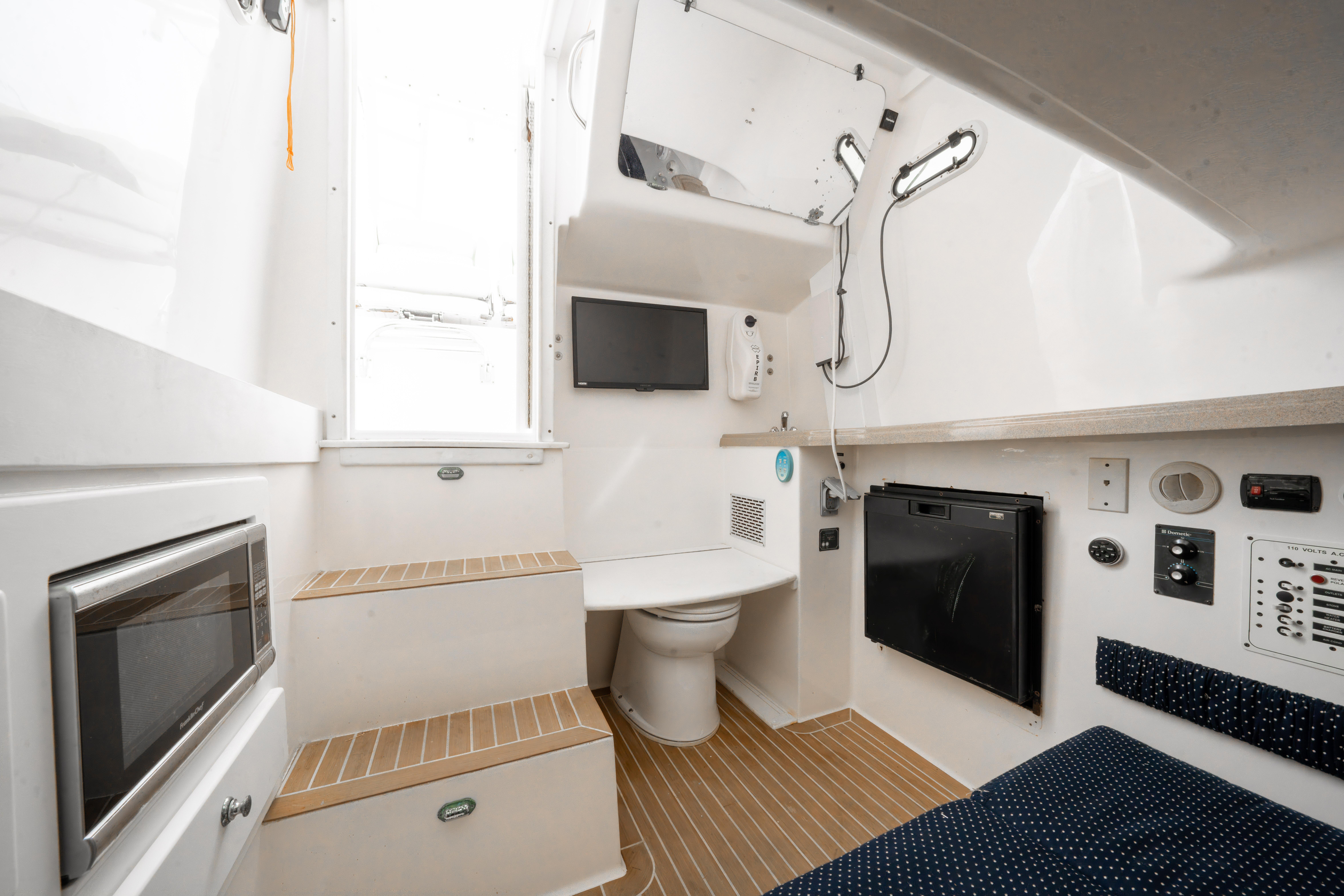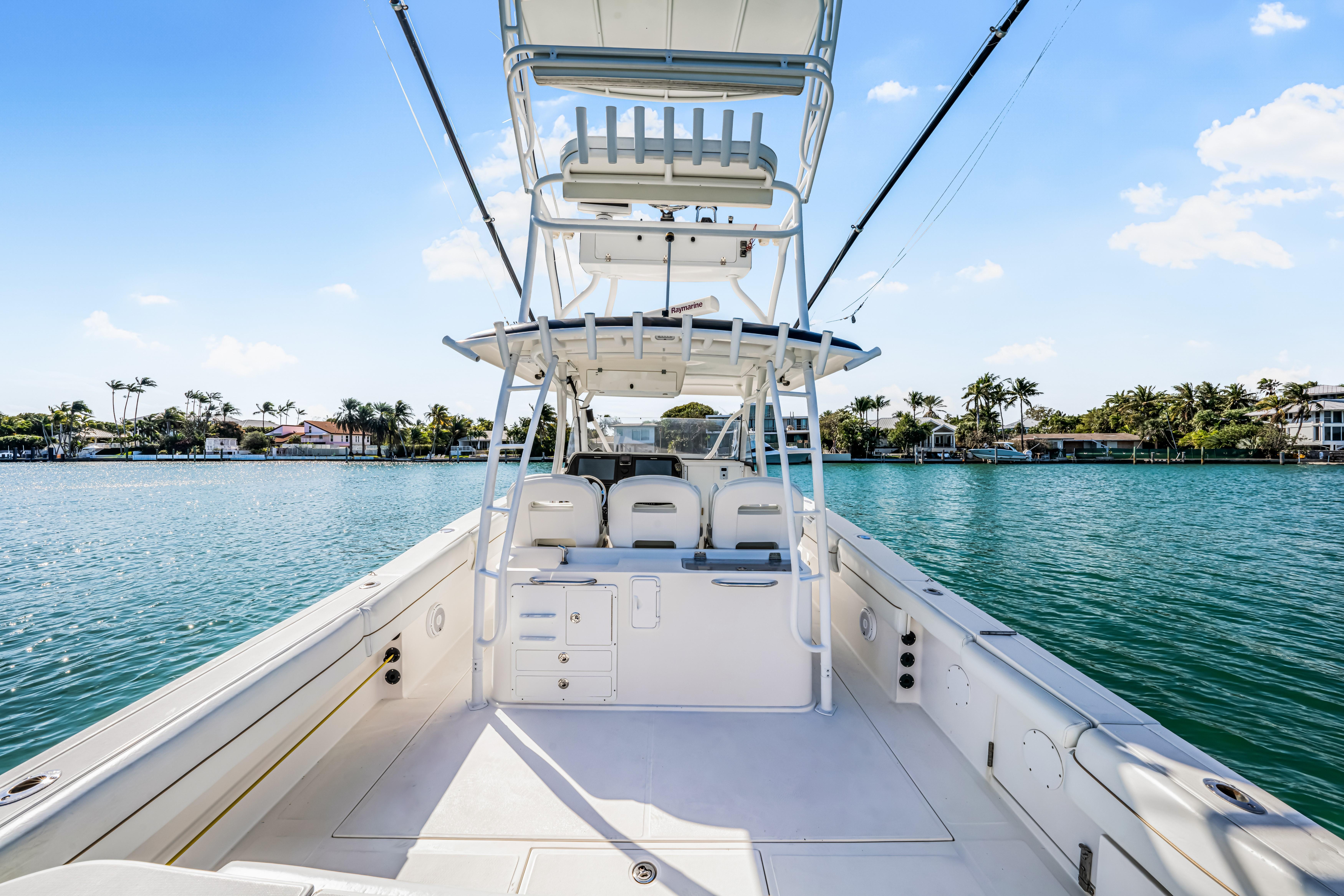 TOP FEATURESRaymarine GS165 16 inches Hybridtouch Raymarine Radio Raymarine Radar Optimus 360 Joystick Bow Thruster Livewell 2 Microwave Proscan TV Norcold Fridge A/C Windlass Electric Toilet JL audio 8 Speakers 2 SubsTuna Tower 390 Tarpon is pure adrenalin for serious sports fishermen. Your choice of twin or triple outboard engine packages will get you there quickly while the legendary Stamas ride will make it comfortable. The large fuel capacity provides plenty of range, even with the biggest outboards. The Tarpon is loaded with fishing features including a combination leaning post and bait station with freshwater sink and recirculating livewell, three insulated overboard draining fishwells and numerous tackle drawers. Built around a center console style layout, the interior fish-fighting space is extremely generous, cleverly laid out and offers unobstructed 360-degree mobility. Particularly noteworthy is a multi-position bow configuration that converts from a lounging pad to a dining area with a pedestal-supported table, to a full deck casting platform. An additional sun pad is forward of the helm station. Whether it’s that extra shuteye for the ride to the fishing grounds or the space your family will claim as their own during day trips, there is no shortage of relaxing areas. This is a true overnight boat as well. Below the deck, is a full-size queen bed, built-in microwave, refrigerator and convenience head.