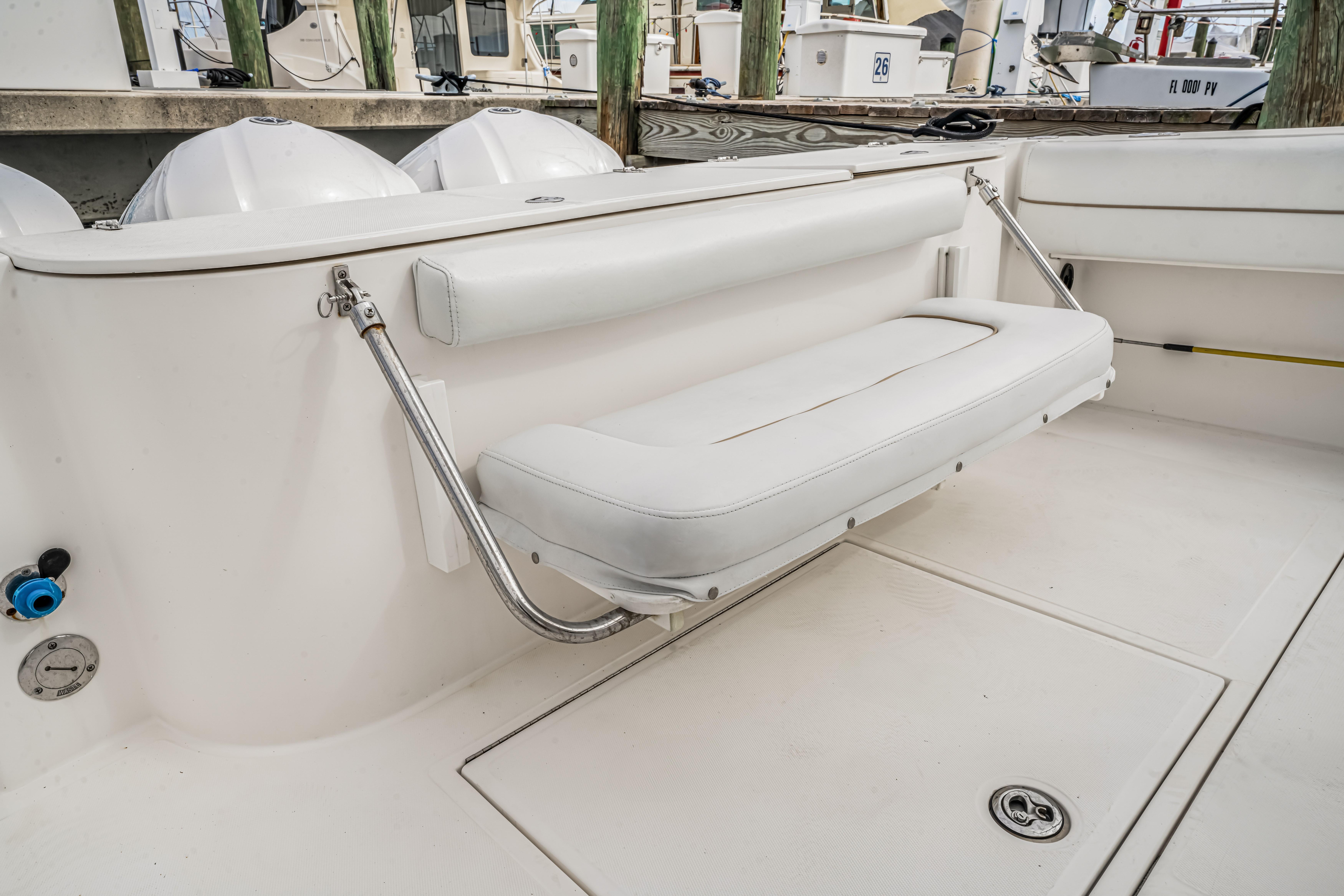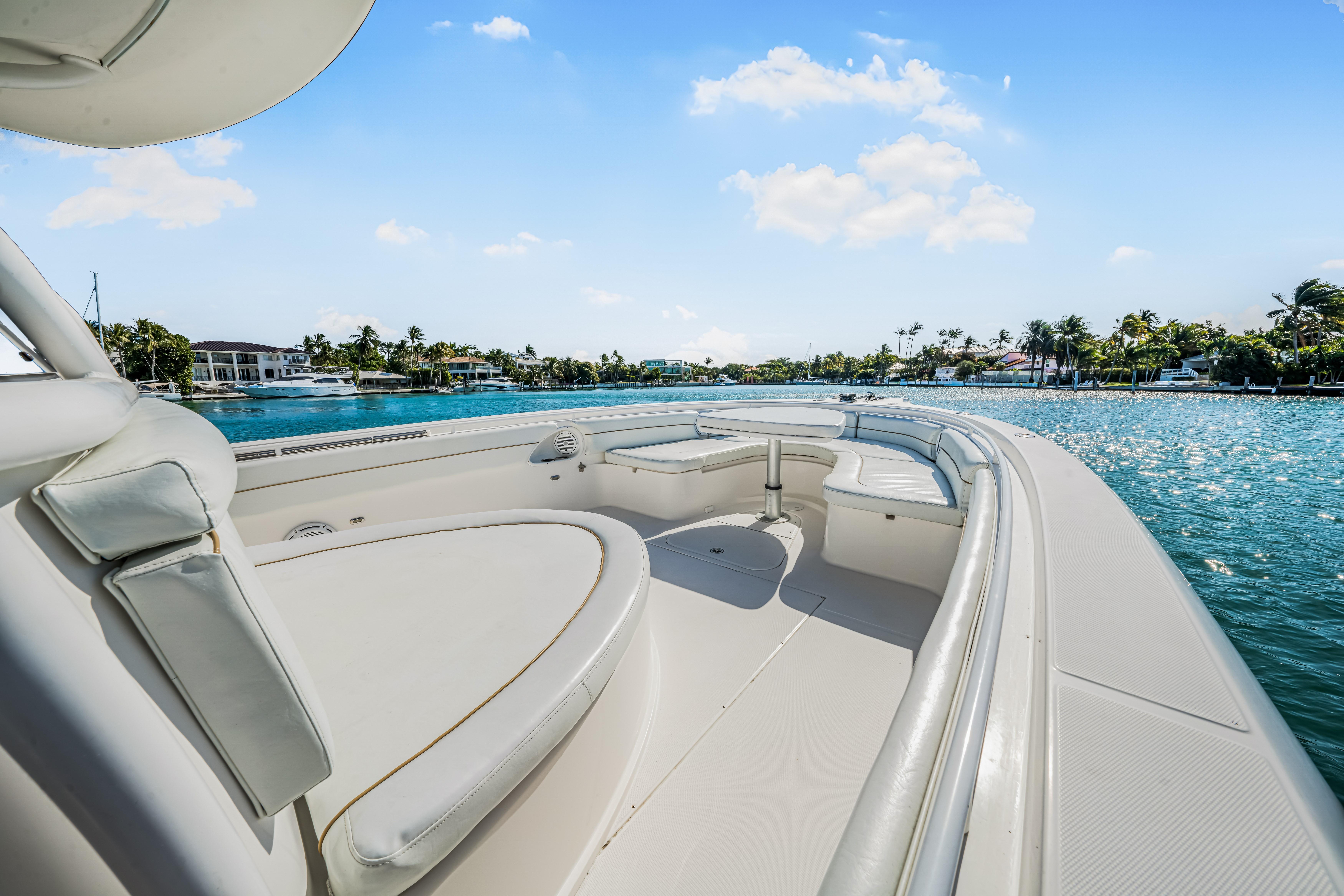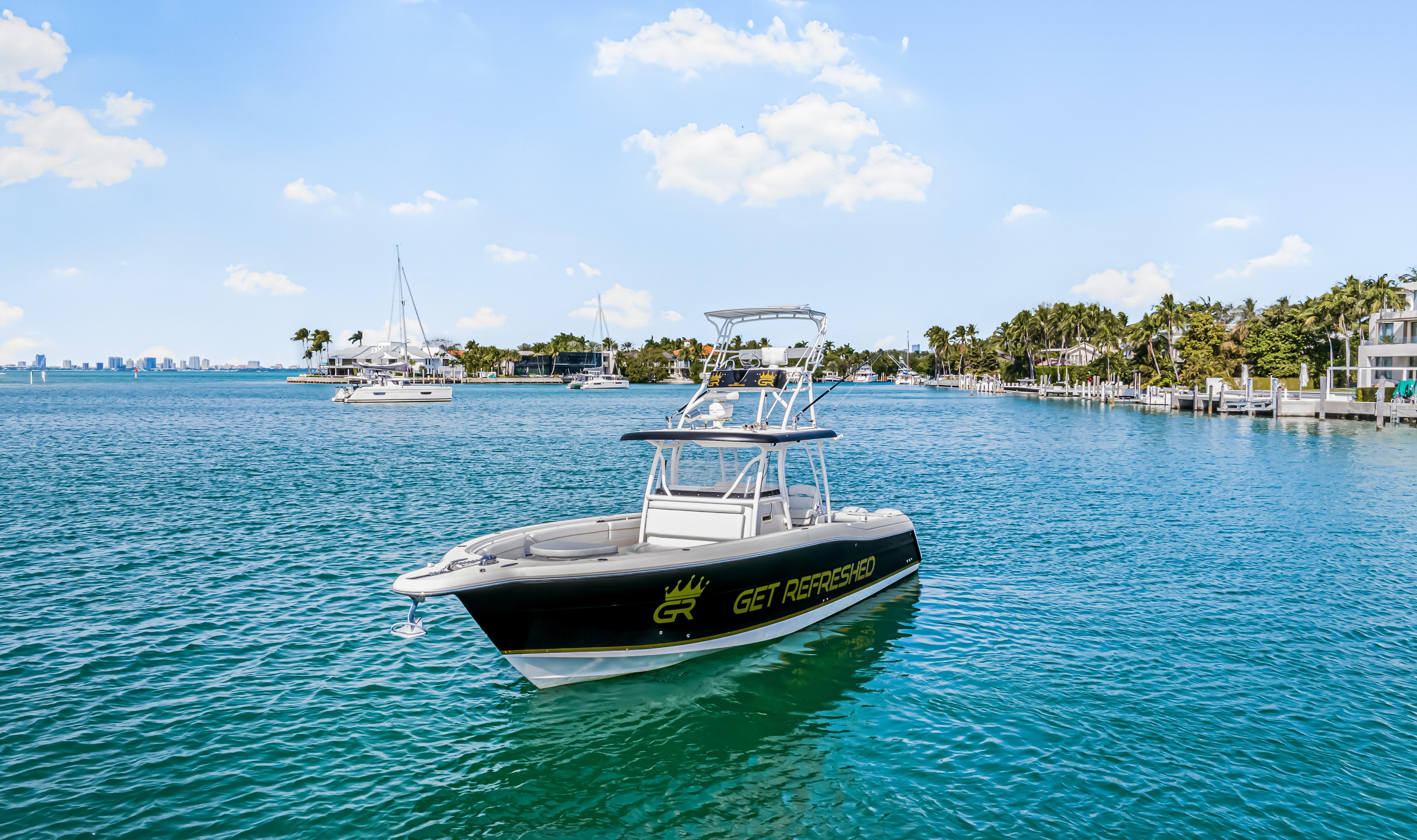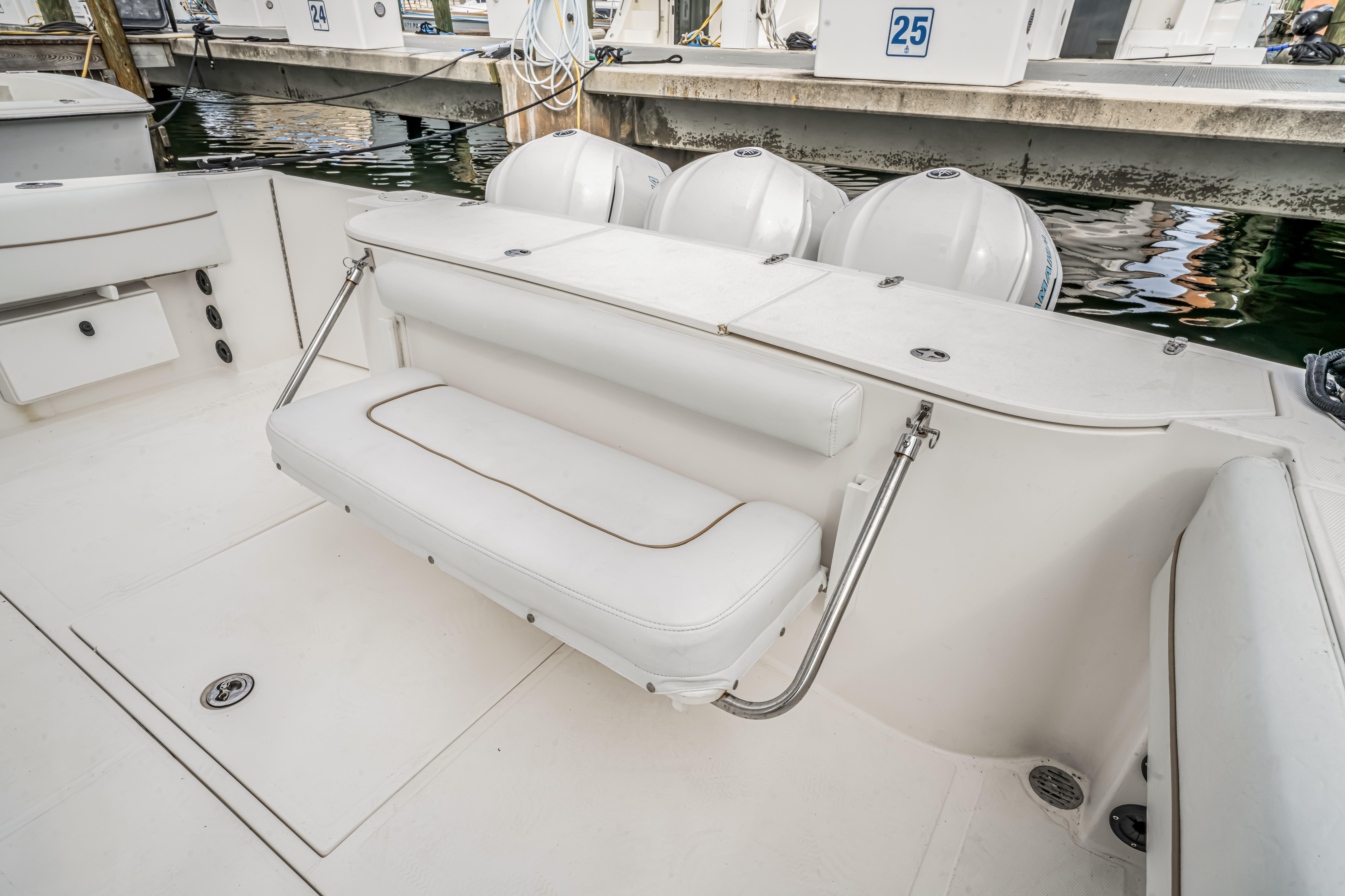 TOP FEATURESRaymarine GS165 16 inches Hybridtouch Raymarine Radio Raymarine Radar Optimus 360 Joystick Bow Thruster Livewell 2 Microwave Proscan TV Norcold Fridge A/C Windlass Electric Toilet JL audio 8 Speakers 2 SubsTuna Tower 390 Tarpon is pure adrenalin for serious sports fishermen. Your choice of twin or triple outboard engine packages will get you there quickly while the legendary Stamas ride will make it comfortable. The large fuel capacity provides plenty of range, even with the biggest outboards. The Tarpon is loaded with fishing features including a combination leaning post and bait station with freshwater sink and recirculating livewell, three insulated overboard draining fishwells and numerous tackle drawers. Built around a center console style layout, the interior fish-fighting space is extremely generous, cleverly laid out and offers unobstructed 360-degree mobility. Particularly noteworthy is a multi-position bow configuration that converts from a lounging pad to a dining area with a pedestal-supported table, to a full deck casting platform. An additional sun pad is forward of the helm station. Whether it’s that extra shuteye for the ride to the fishing grounds or the space your family will claim as their own during day trips, there is no shortage of relaxing areas. This is a true overnight boat as well. Below the deck, is a full-size queen bed, built-in microwave, refrigerator and convenience head.