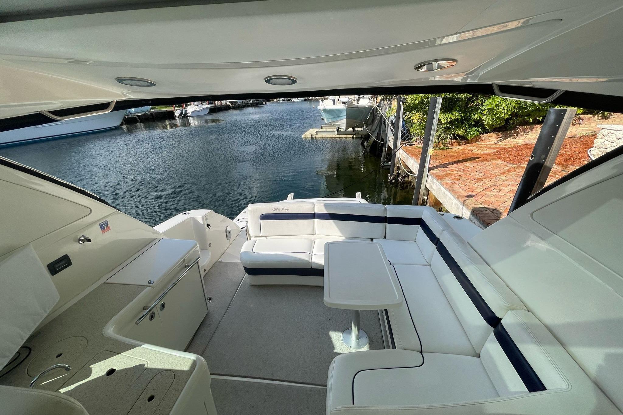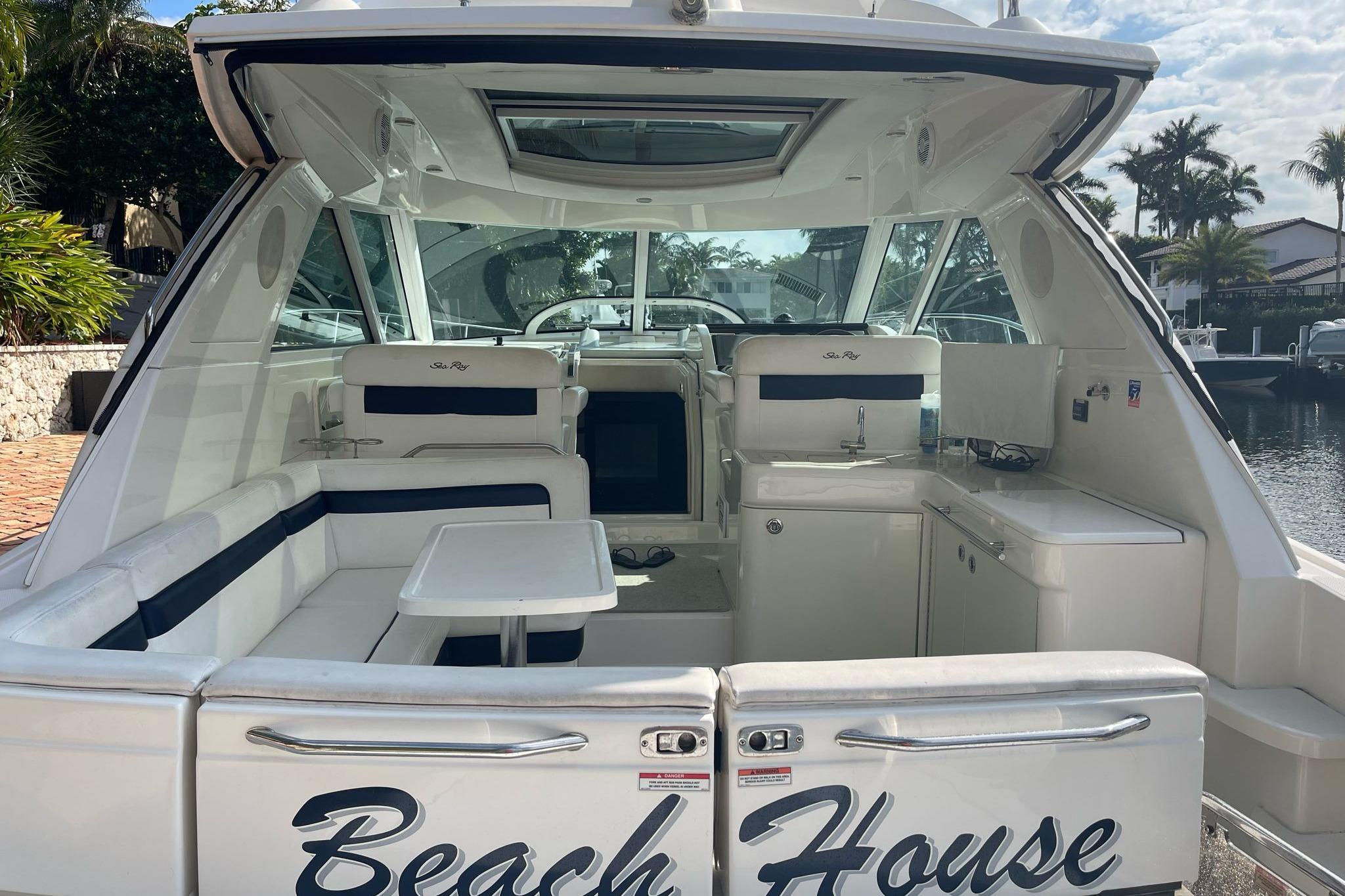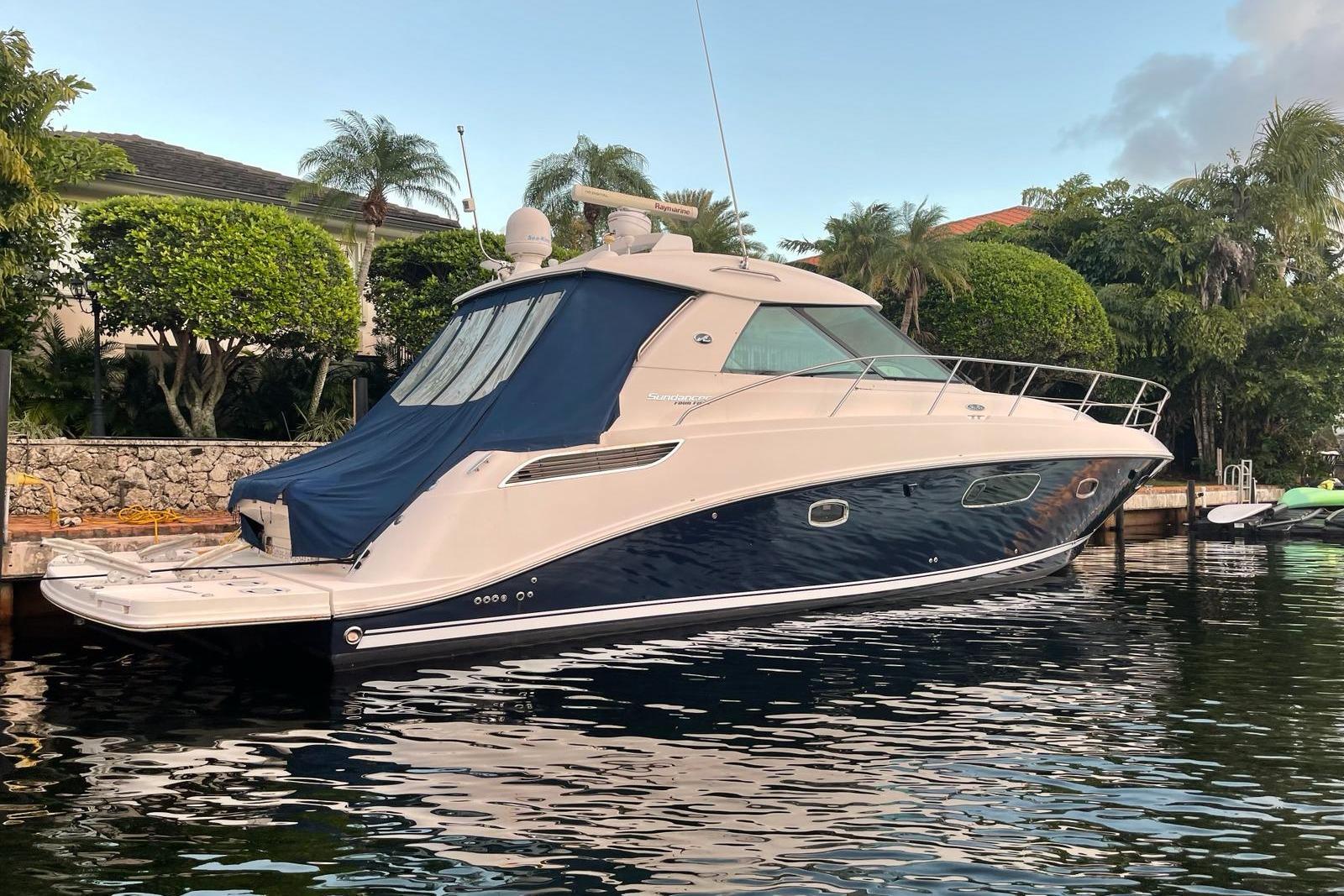 2010 SEA RAY SUNDANCER BEACH HOUSE The 2010 Sea Ray Sundancer 45' Beach House is an exceptional motor yacht, highly reliable and have been competently well kept. It counts with many features such as a remote controlled hydraulic swim platform. Its engines are QSB Cummins 380 engines, with 660h hours each, 380hp and Joystick Zeus Pod drive, providing a fantastic performance for a fantastic cruising experience. The colors are very well suited by its desing, outside a dark blue hull and white paint on the top certainly makes Beach House look timeless. Aboard the cabin, you are greeted with white leader seats with overall modern looks, stepping inside, a delightful marble countertop and refined wood was the chosen finishings by the designer. As of late April 2025, the boat also counts with New Bottom Paint, New PropSpeed and New Zincs. FEATURES> 1. 2 GPS Raymarine E120. 2. TNT Retractable Hydraulic Swim Platform. 3. Radar Raymarine. 4. VHF Raymarine. 5. SatTV: Sea King. 6. Depthsounder: Raymarine. 7. Flir night vision. 8. Compass: Richie Magnet. 9. Autopilot: Precision Pilot. 10. Searchlight: ACR Remote Operated 11. Plotter program: Nobeltec. APPLIANCES> 1. Isotherm Refrigerator. 2. Air conditioning. 3. Water heater. 4. Panasonic Microwave. 5. Stovetop. EXTRA> 1. New blue Hull paint in 2022. 2. New boat cover in 2023. 3. Yearly maintenance for Engines, Pods and Generator by Dealer