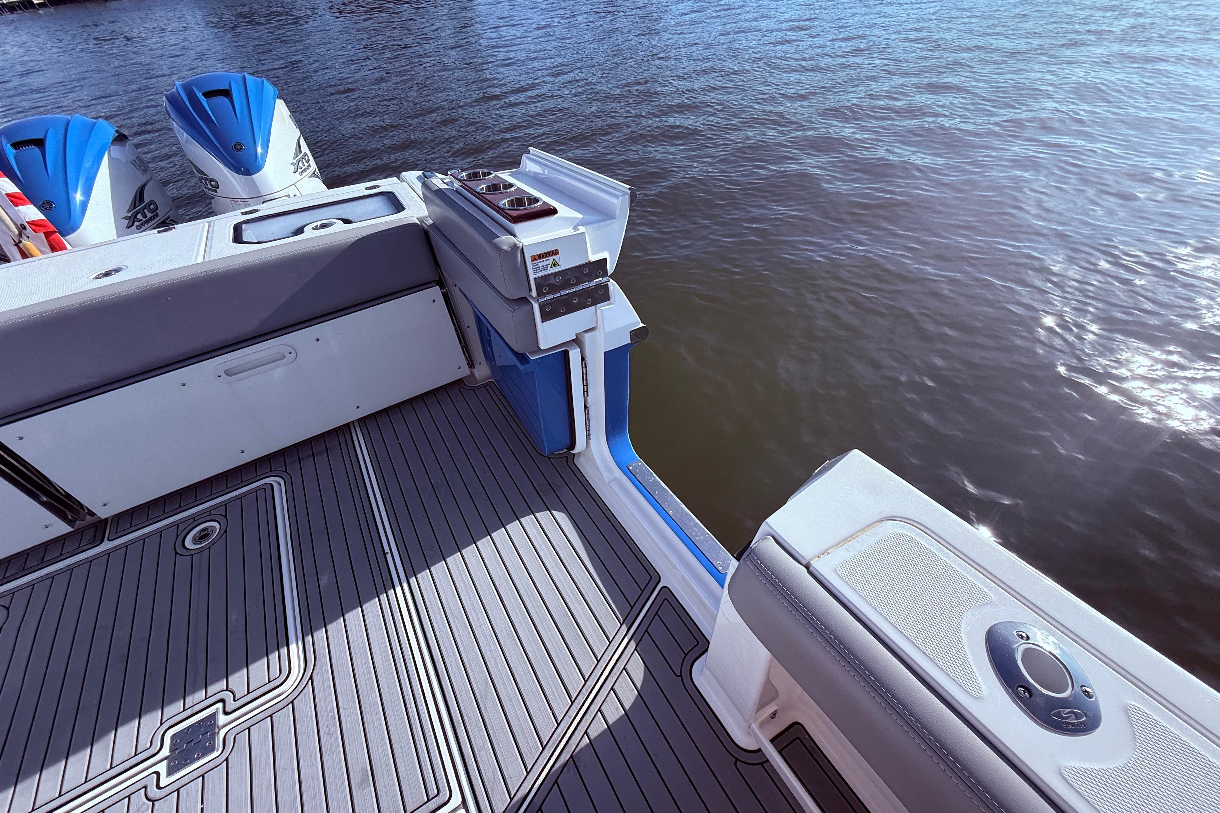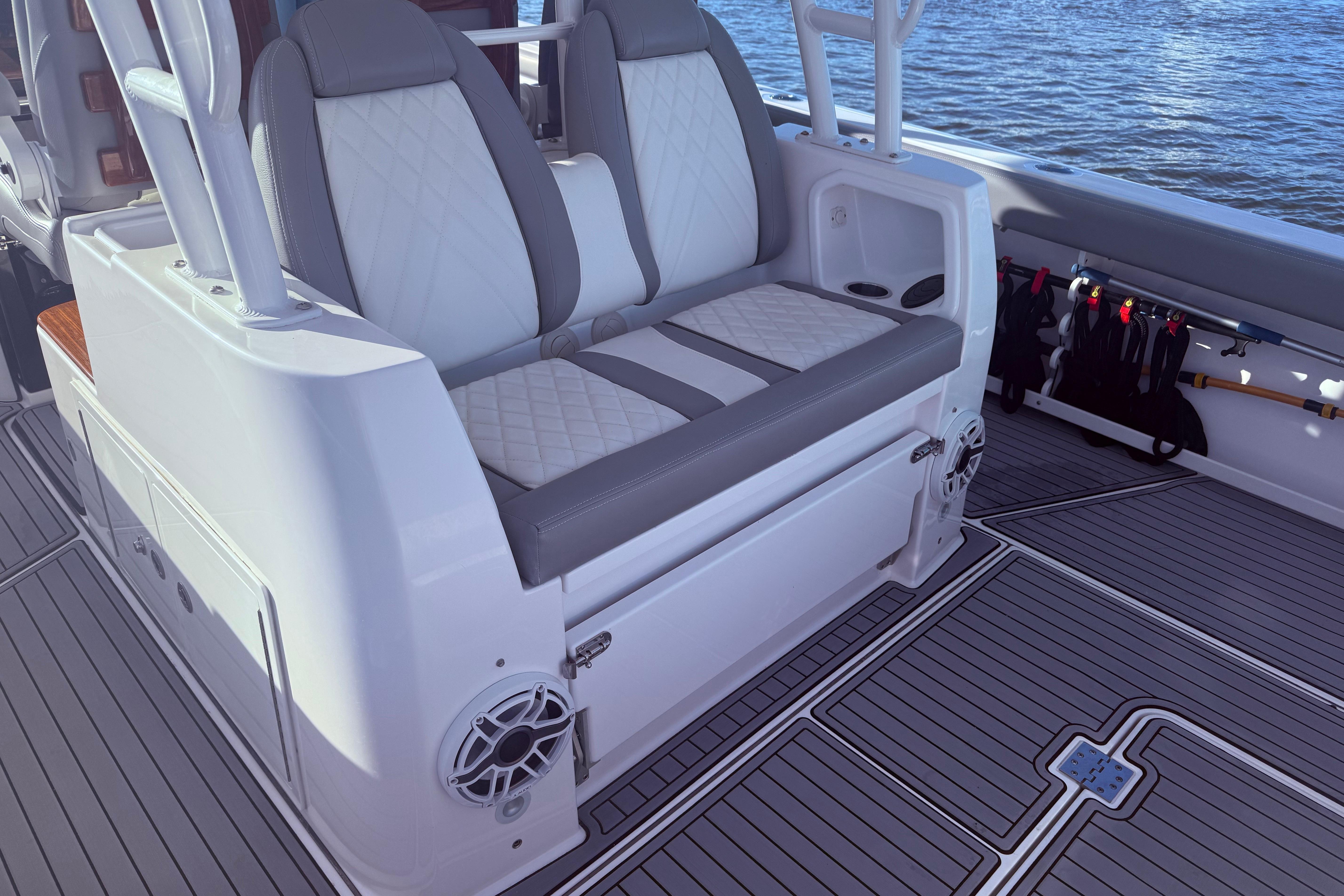 Elevated aft facing seating with folding footrest, cup holders (2), USB chargers (replaced with rigging station option)