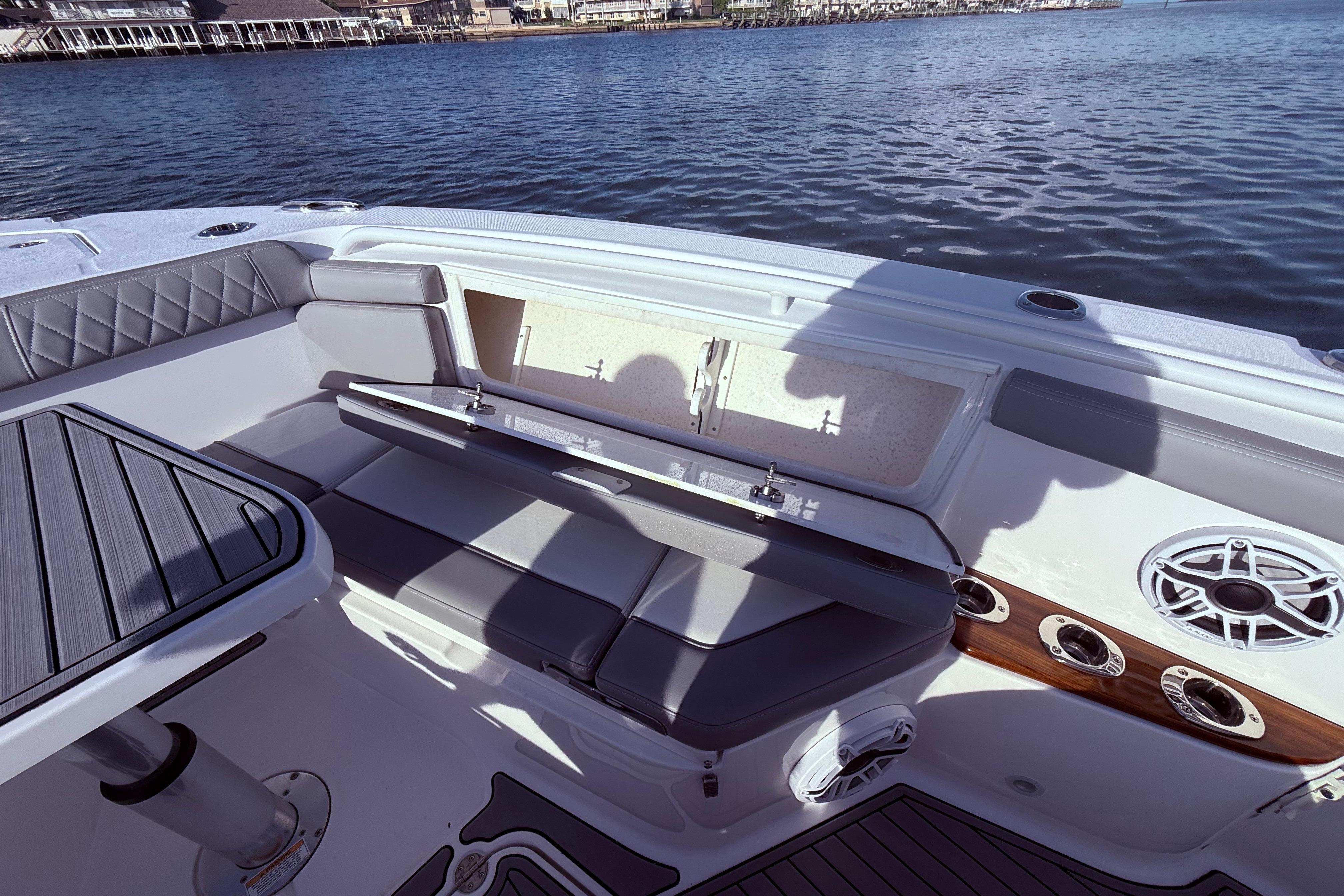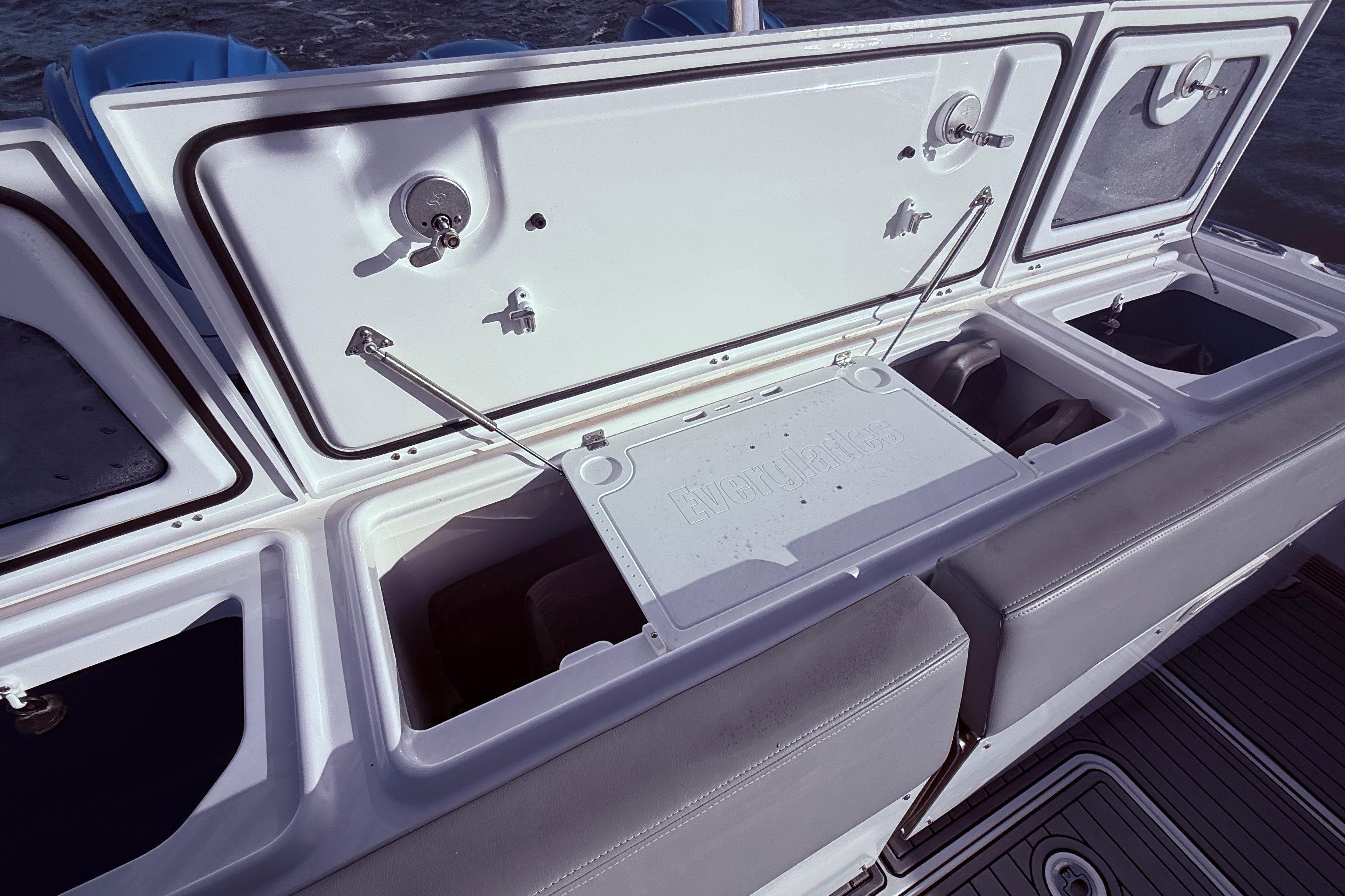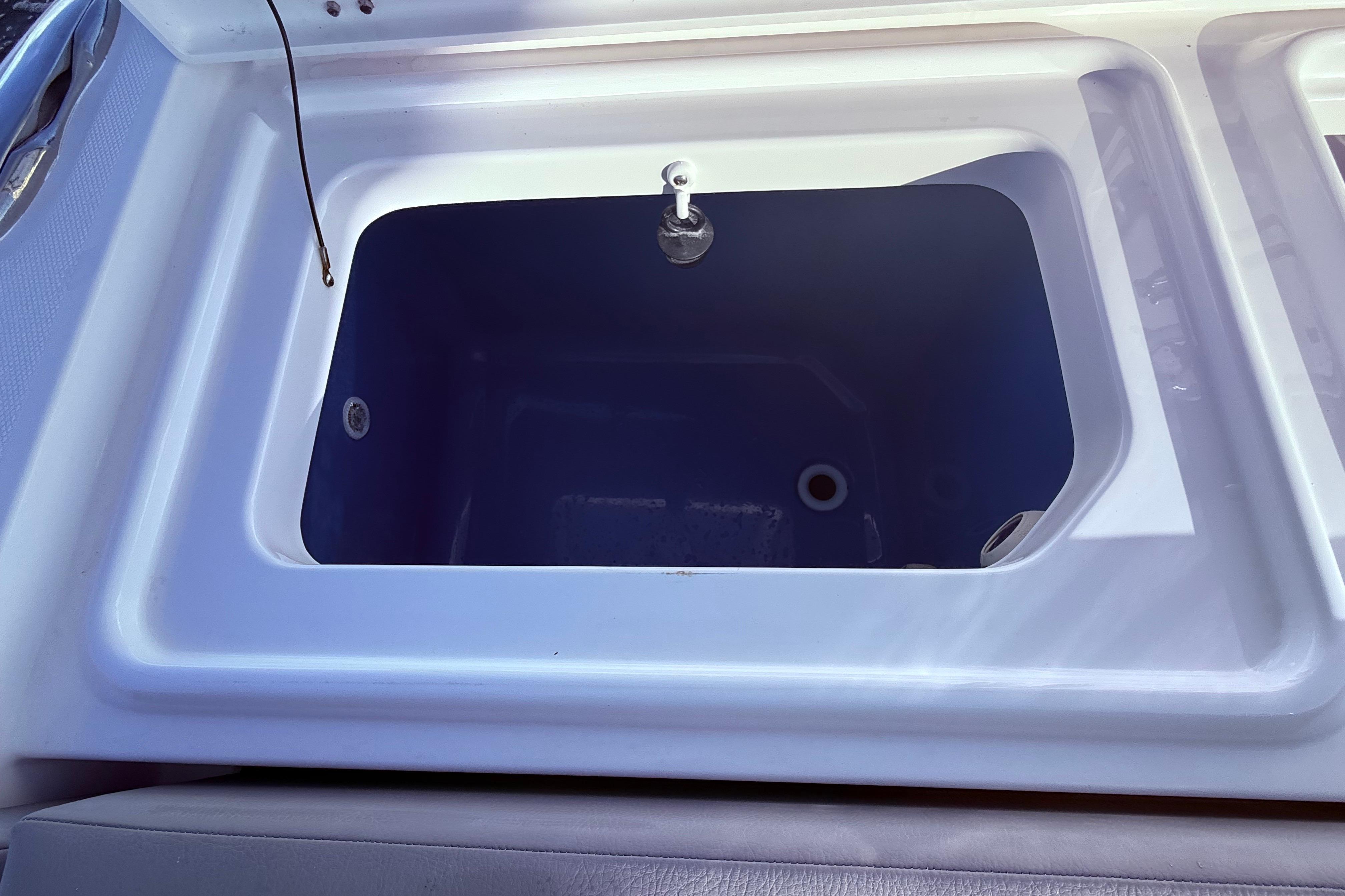 Insulated bow seating storage tubs port and starboard with opening lids, lighting and drainage
