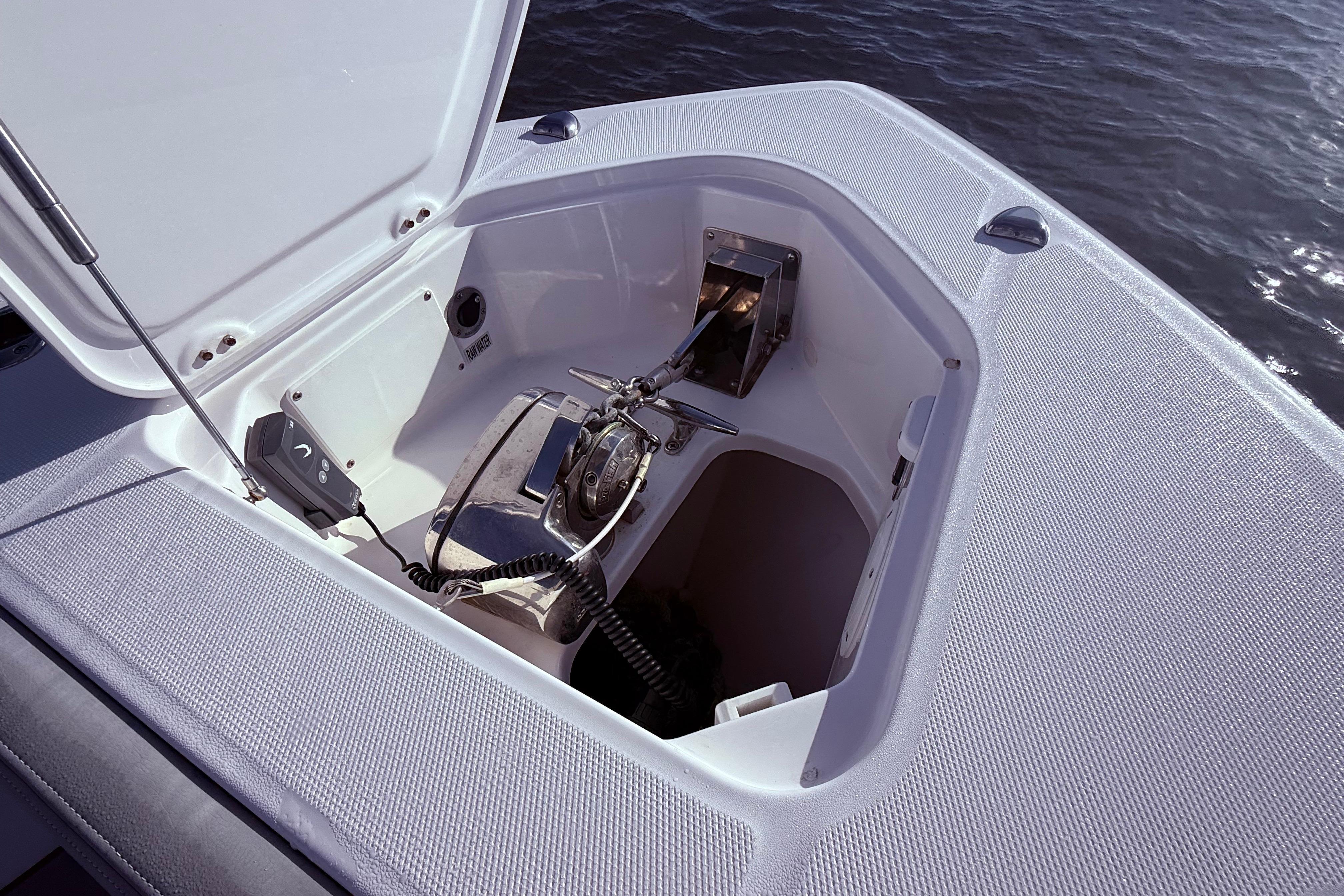 Electric windlass with remote, tool storage, integrated through the stem anchor chute & stainless steel cleat