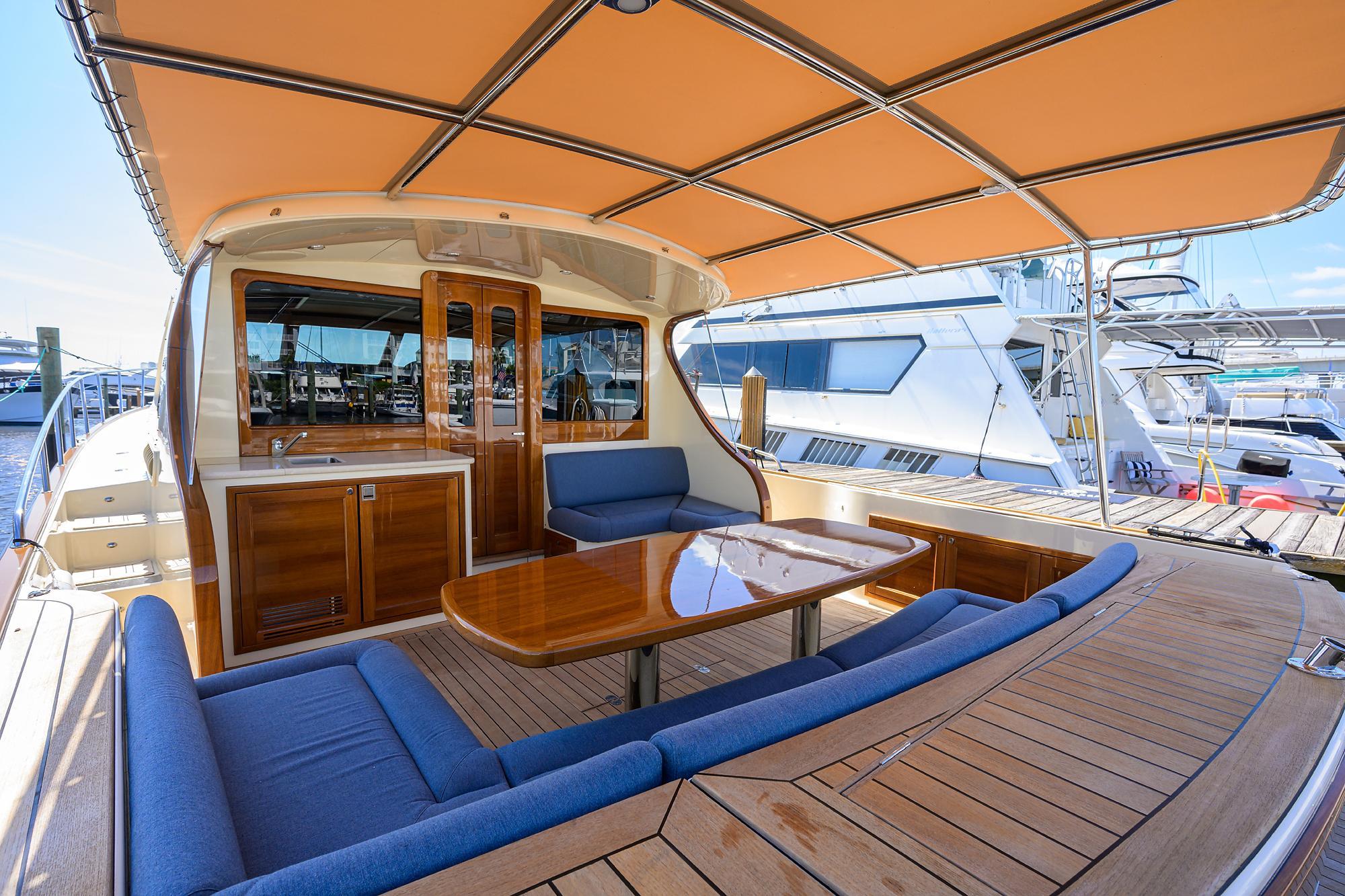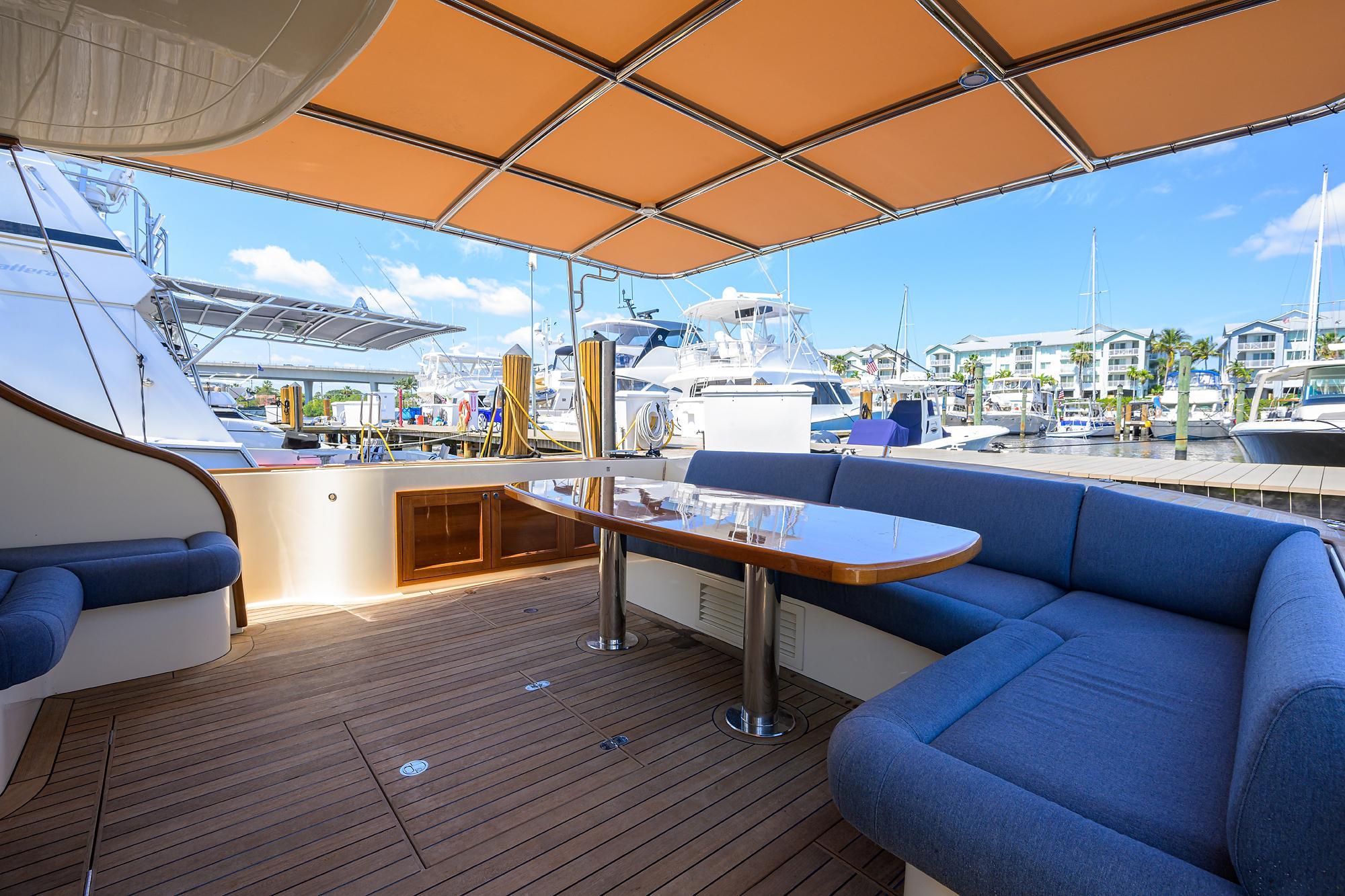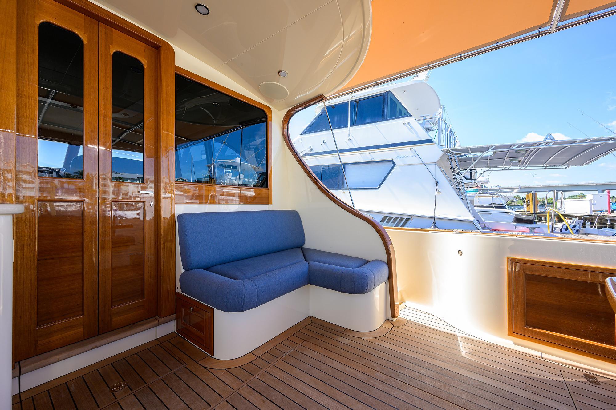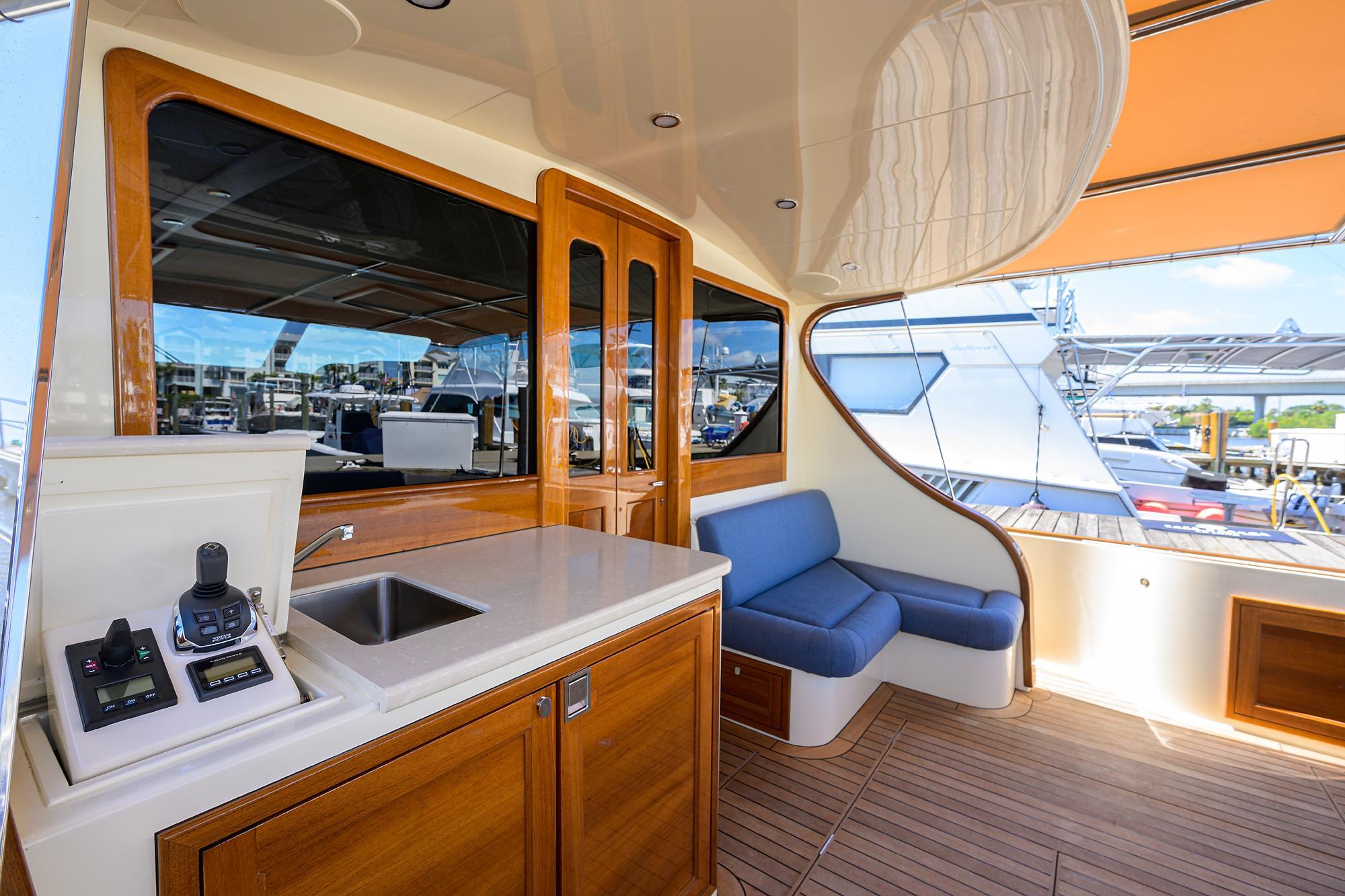 The cockpit is crafted for effortless outdoor entertaining and connection with the water. Relax on the forward-facing L-settee with high-gloss teak table, prepare ‘mess-free’ meals on the swim platform with dual Kenyon grills, or open the cockpit garage and launch the tender for a quick blast around the harbor. She also features a cockpit docking station for added ease with stern-in docking situations. Recent upgrades include new boarding gates, custom canvas covers, sunpad and a recessed ‘bow rider’ lounge.
