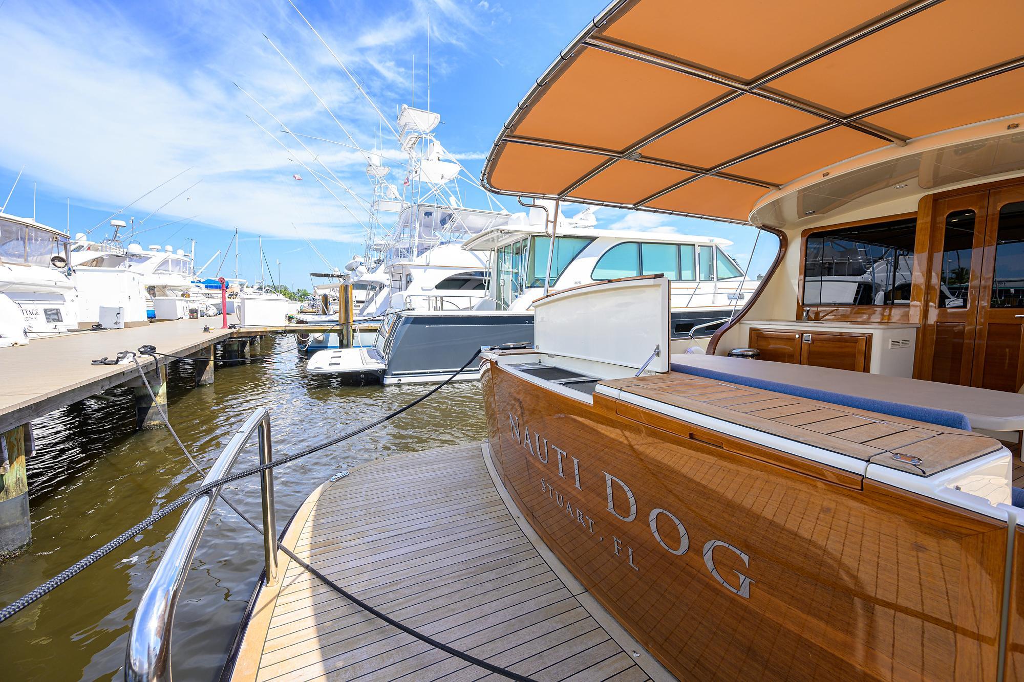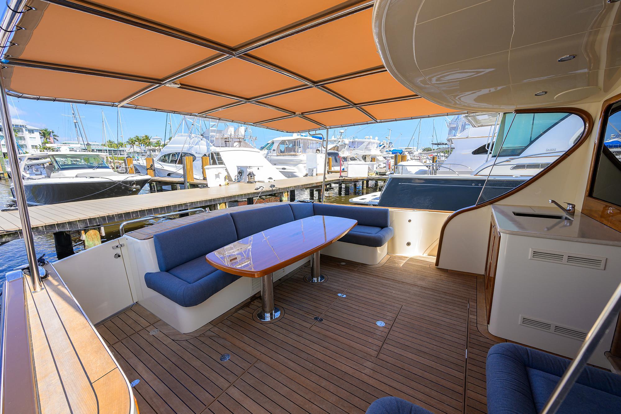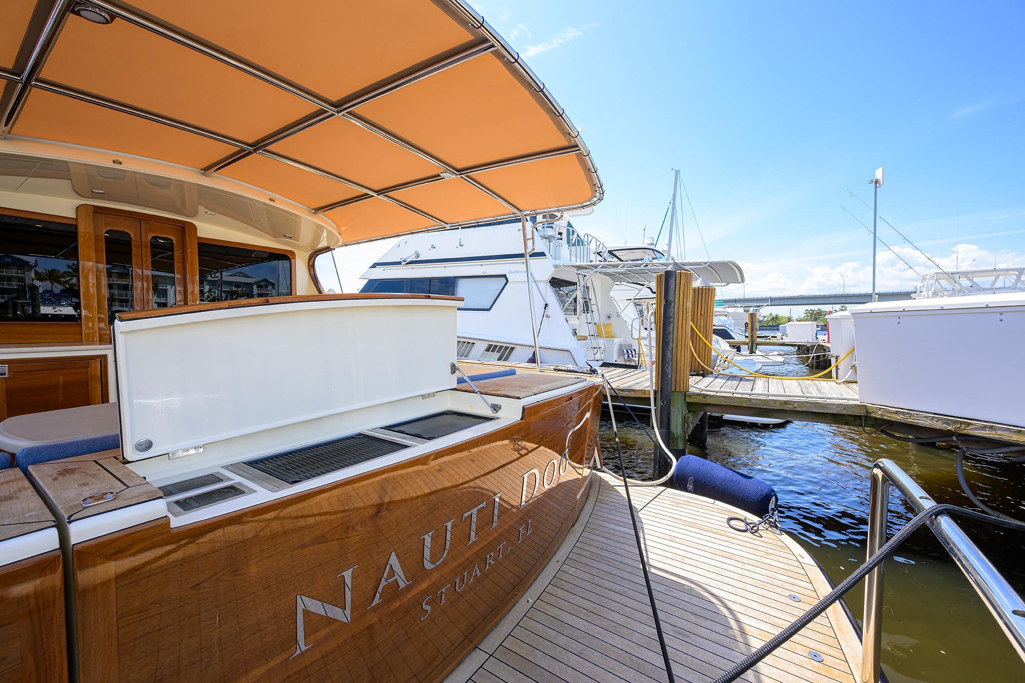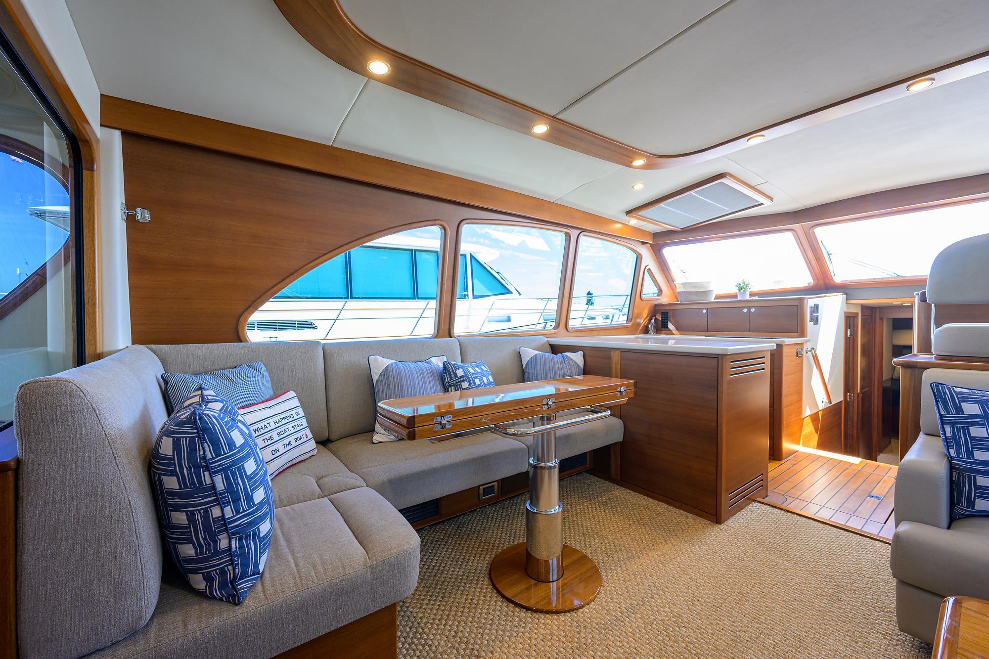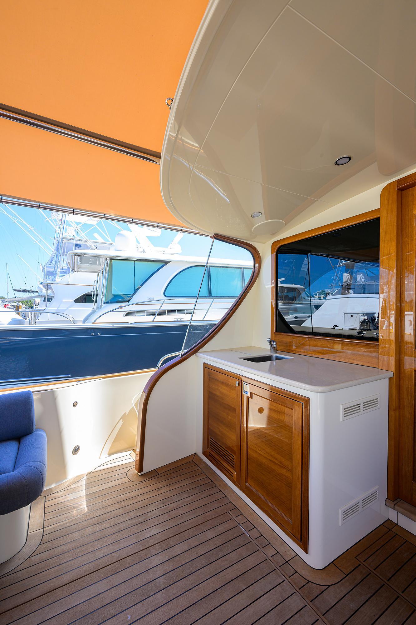 The cockpit is crafted for effortless outdoor entertaining and connection with the water. Relax on the forward-facing L-settee with high-gloss teak table, prepare ‘mess-free’ meals on the swim platform with dual Kenyon grills, or open the cockpit garage and launch the tender for a quick blast around the harbor. She also features a cockpit docking station for added ease with stern-in docking situations. Recent upgrades include new boarding gates, custom canvas covers, sunpad and a recessed ‘bow rider’ lounge.