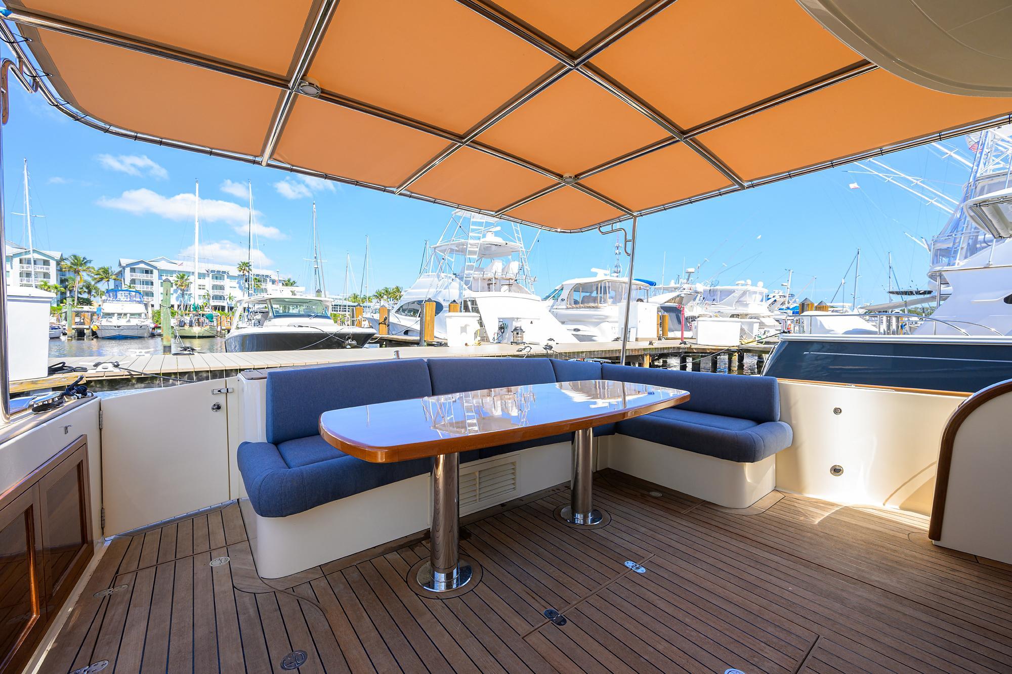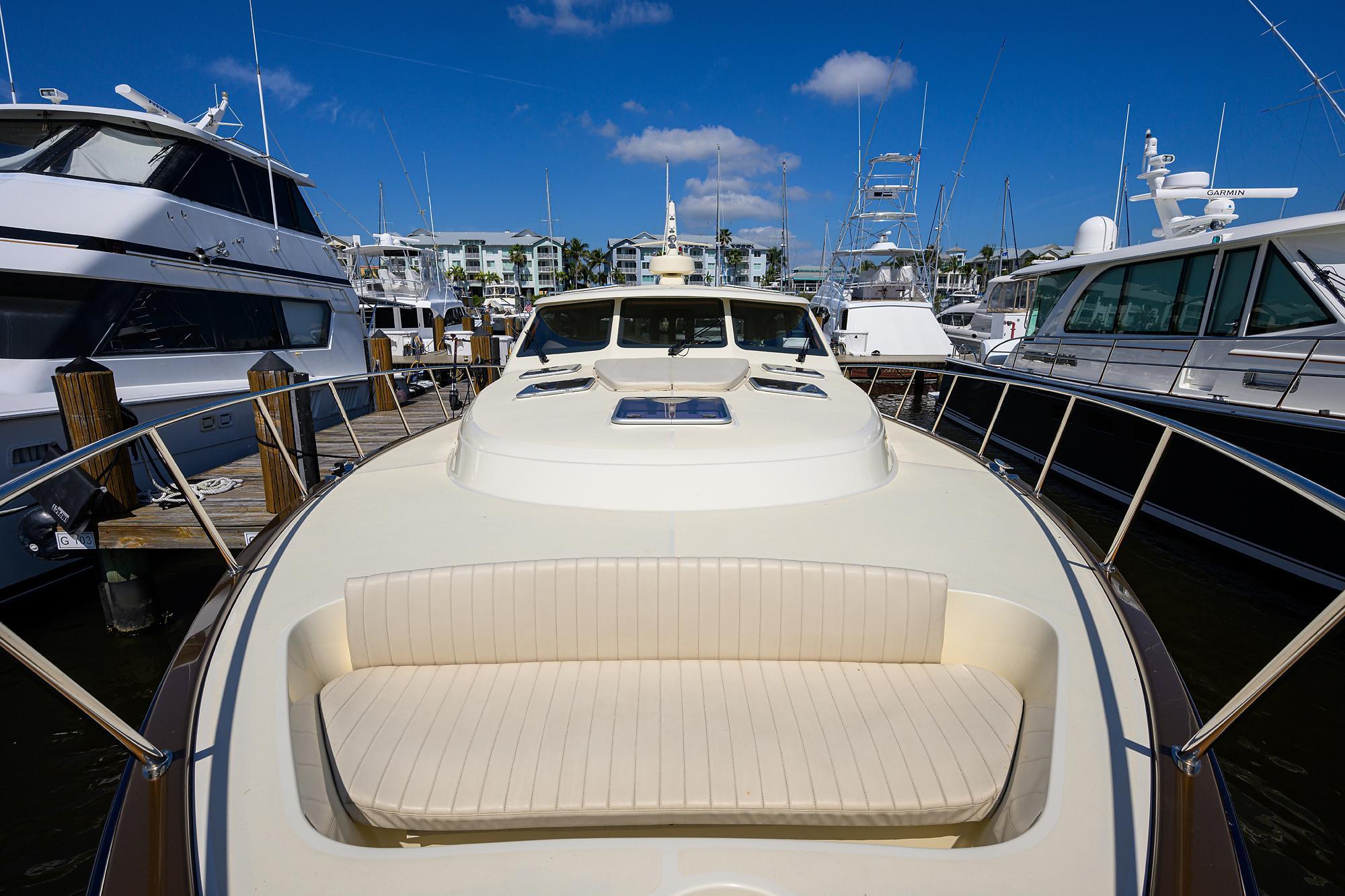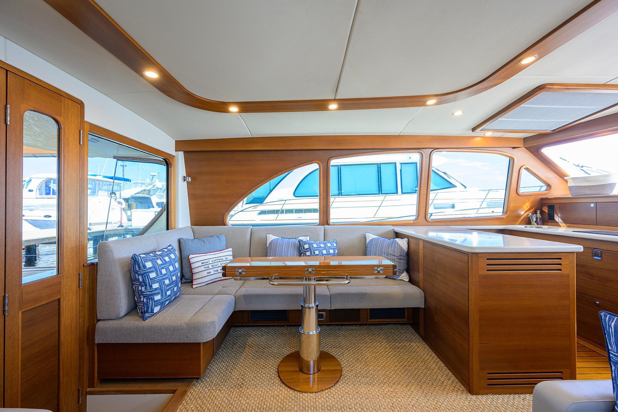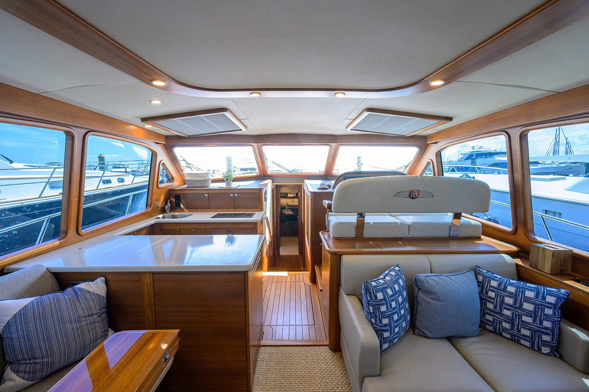 The cockpit is crafted for effortless outdoor entertaining and connection with the water. Relax on the forward-facing L-settee with high-gloss teak table, prepare ‘mess-free’ meals on the swim platform with dual Kenyon grills, or open the cockpit garage and launch the tender for a quick blast around the harbor. She also features a cockpit docking station for added ease with stern-in docking situations. Recent upgrades include new boarding gates, custom canvas covers, sunpad and a recessed ‘bow rider’ lounge.