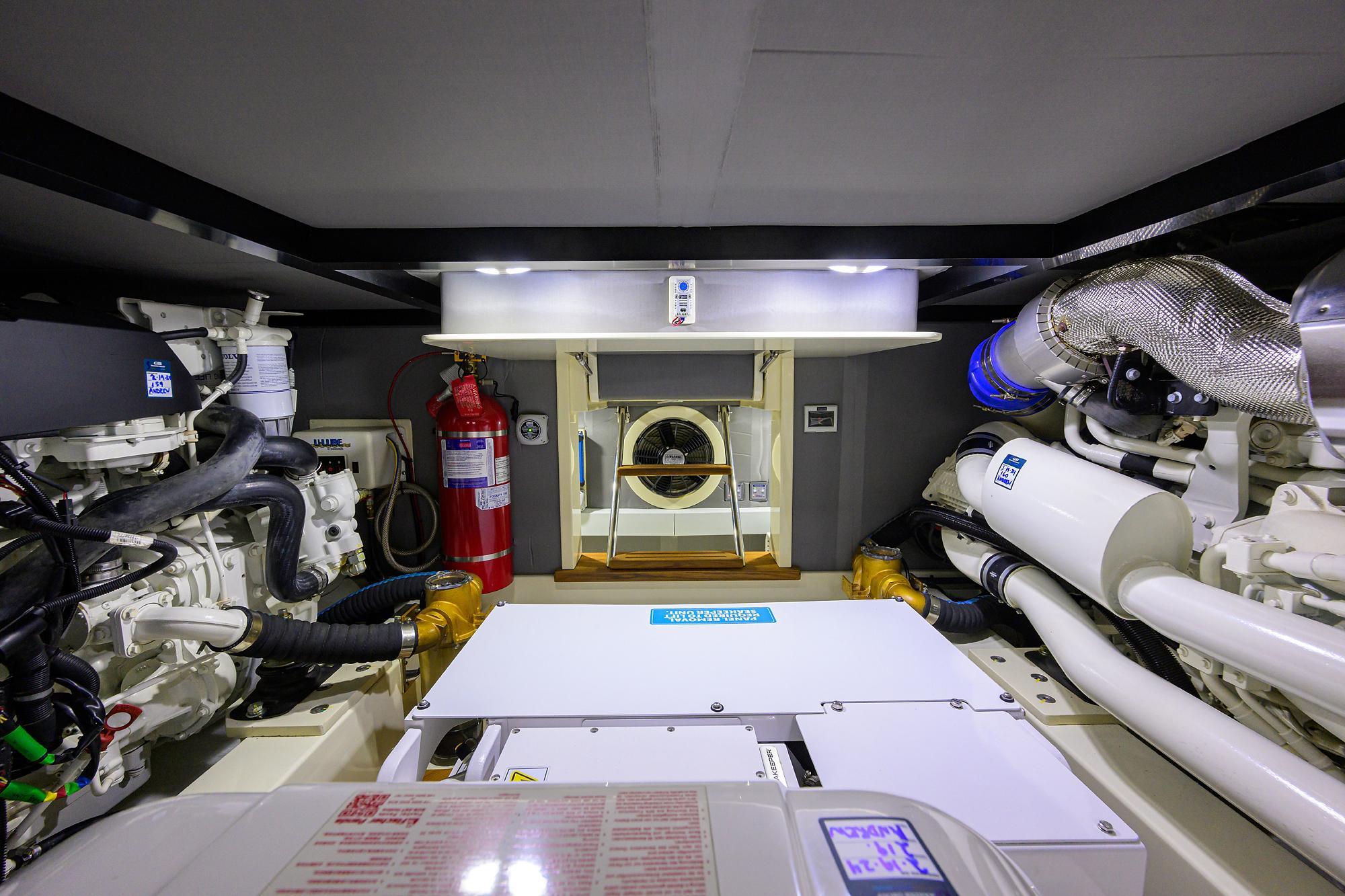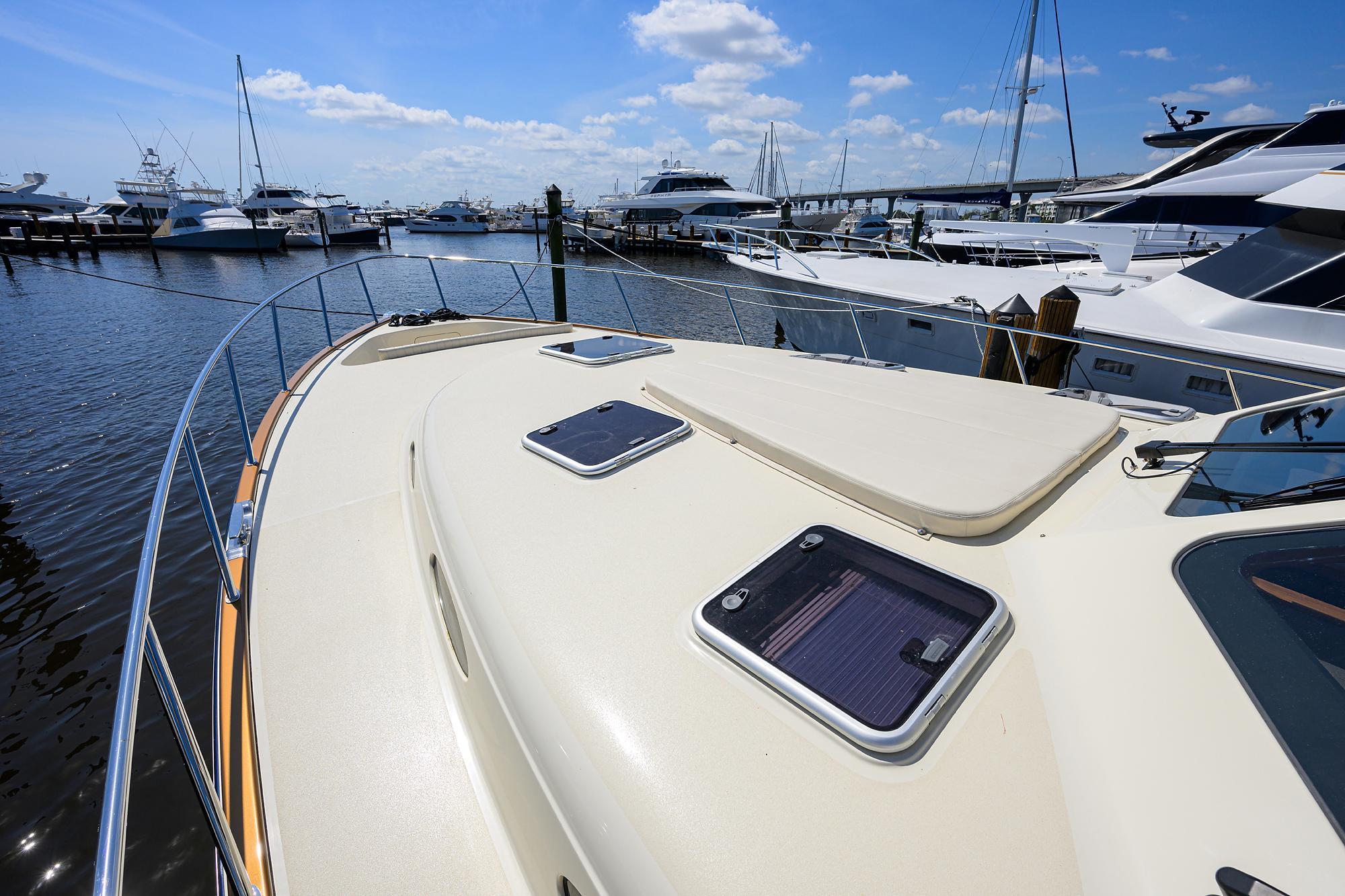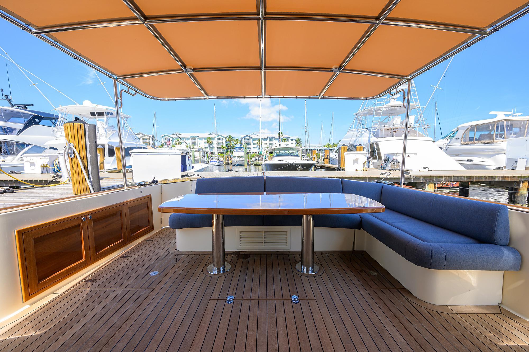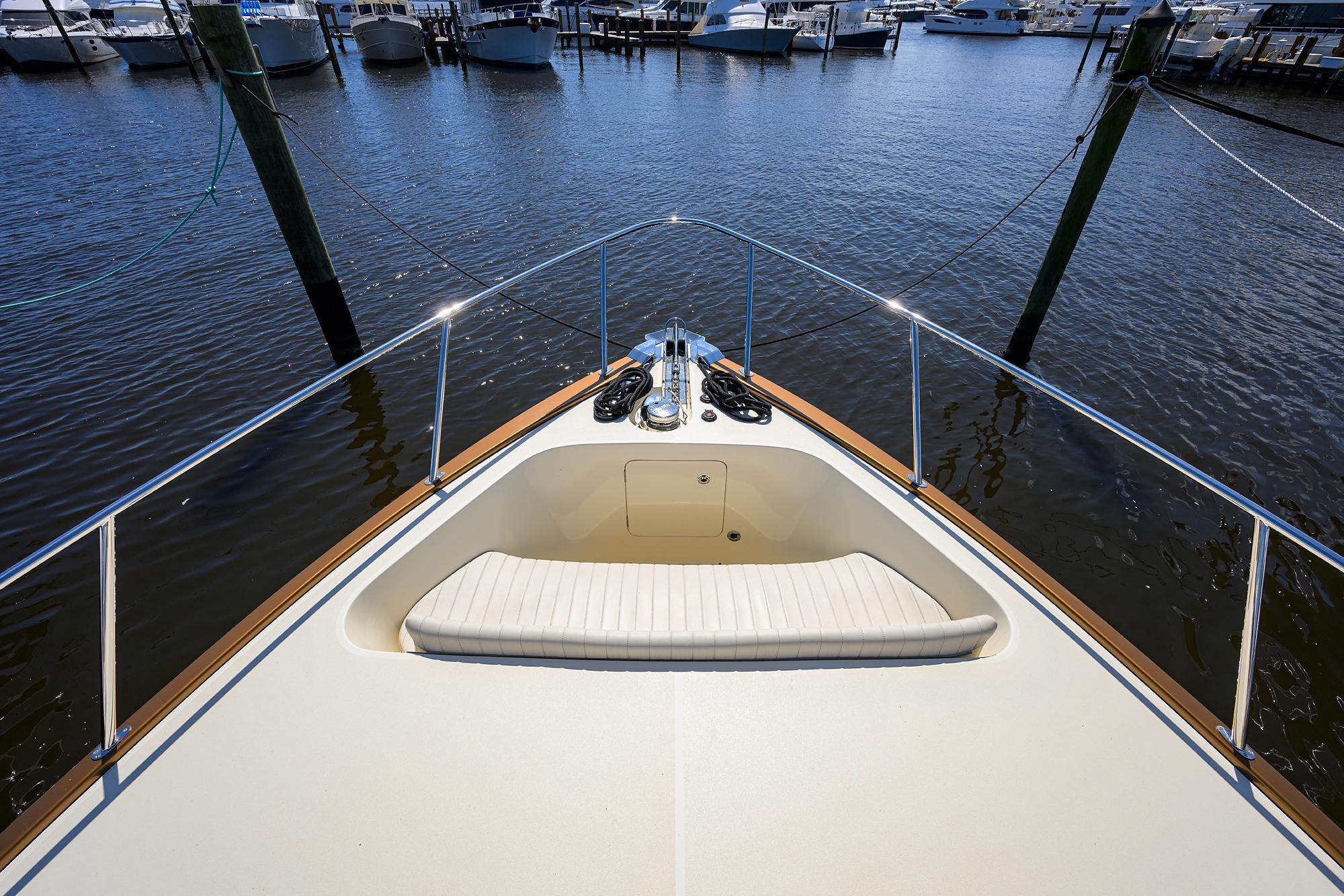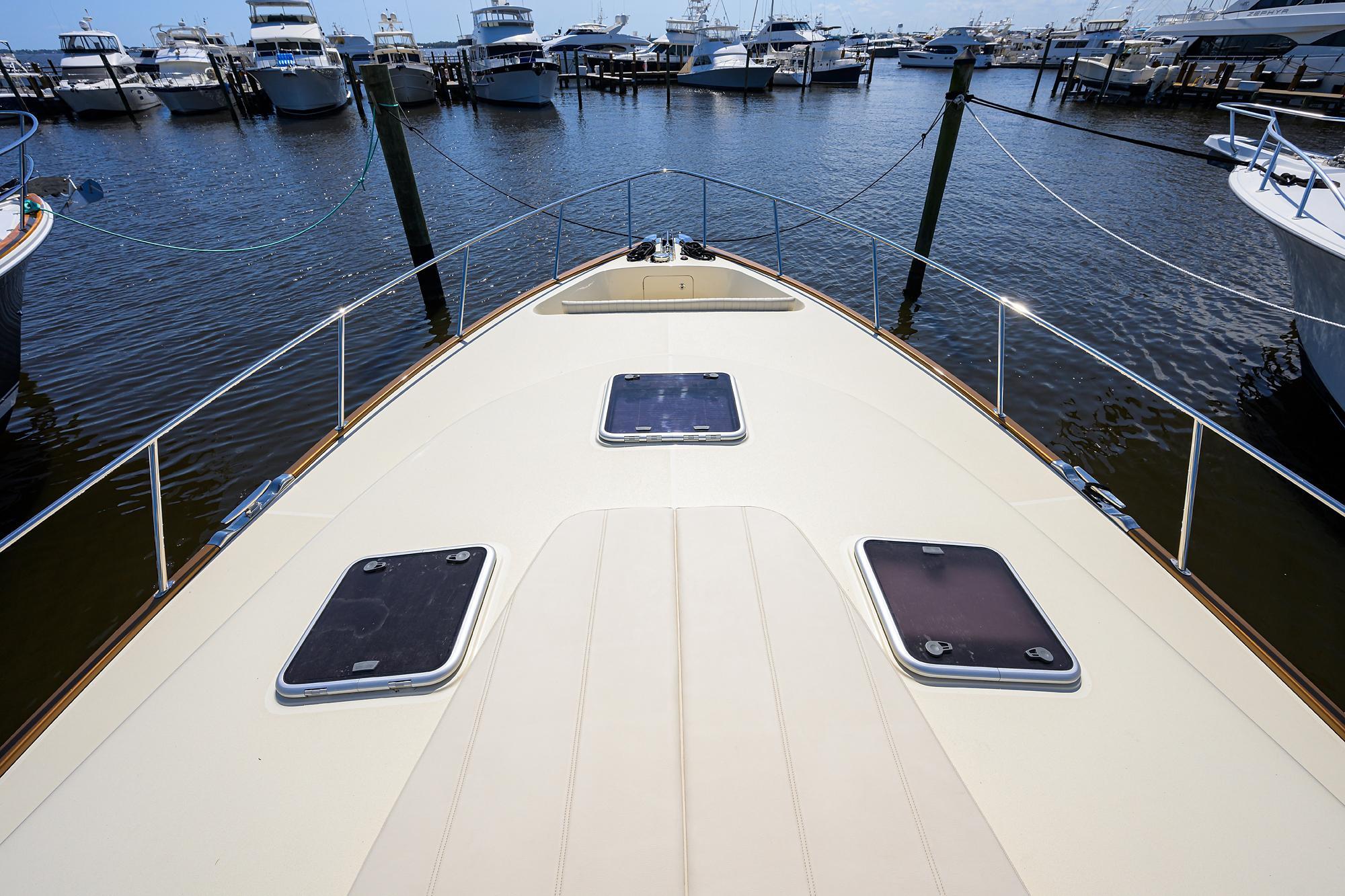 The cockpit is crafted for effortless outdoor entertaining and connection with the water. Relax on the forward-facing L-settee with high-gloss teak table, prepare ‘mess-free’ meals on the swim platform with dual Kenyon grills, or open the cockpit garage and launch the tender for a quick blast around the harbor. She also features a cockpit docking station for added ease with stern-in docking situations. Recent upgrades include new boarding gates, custom canvas covers, sunpad and a recessed ‘bow rider’ lounge.