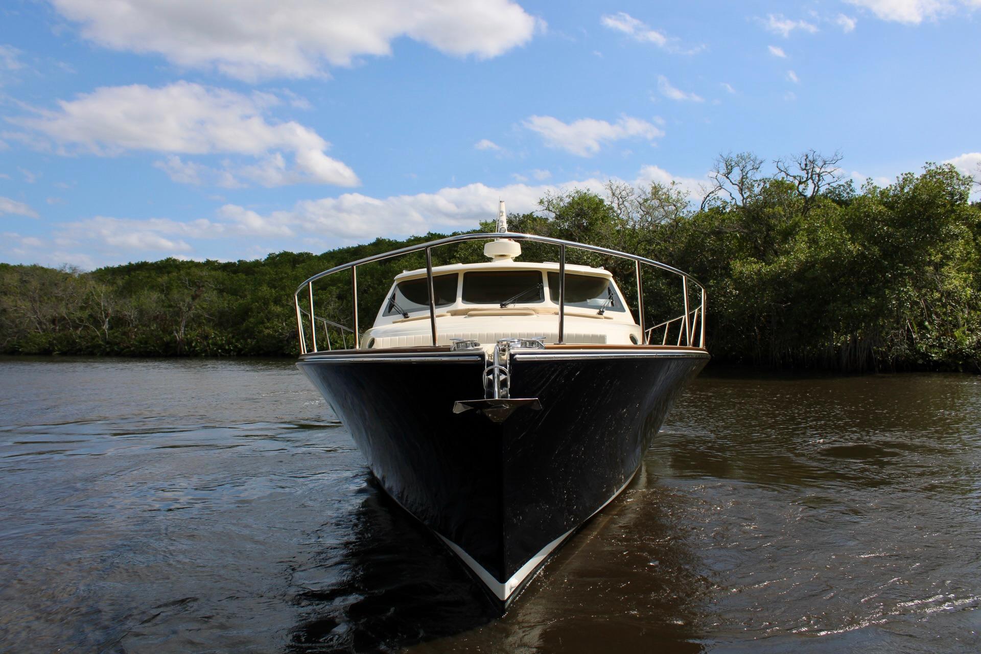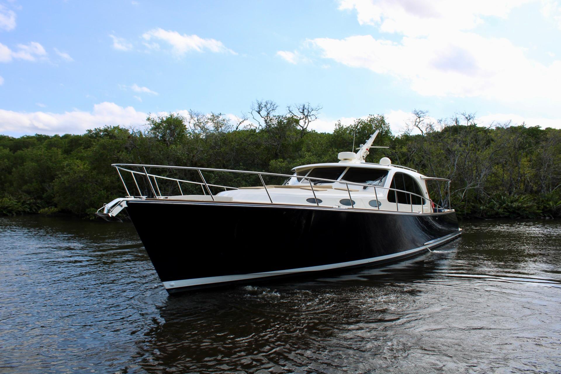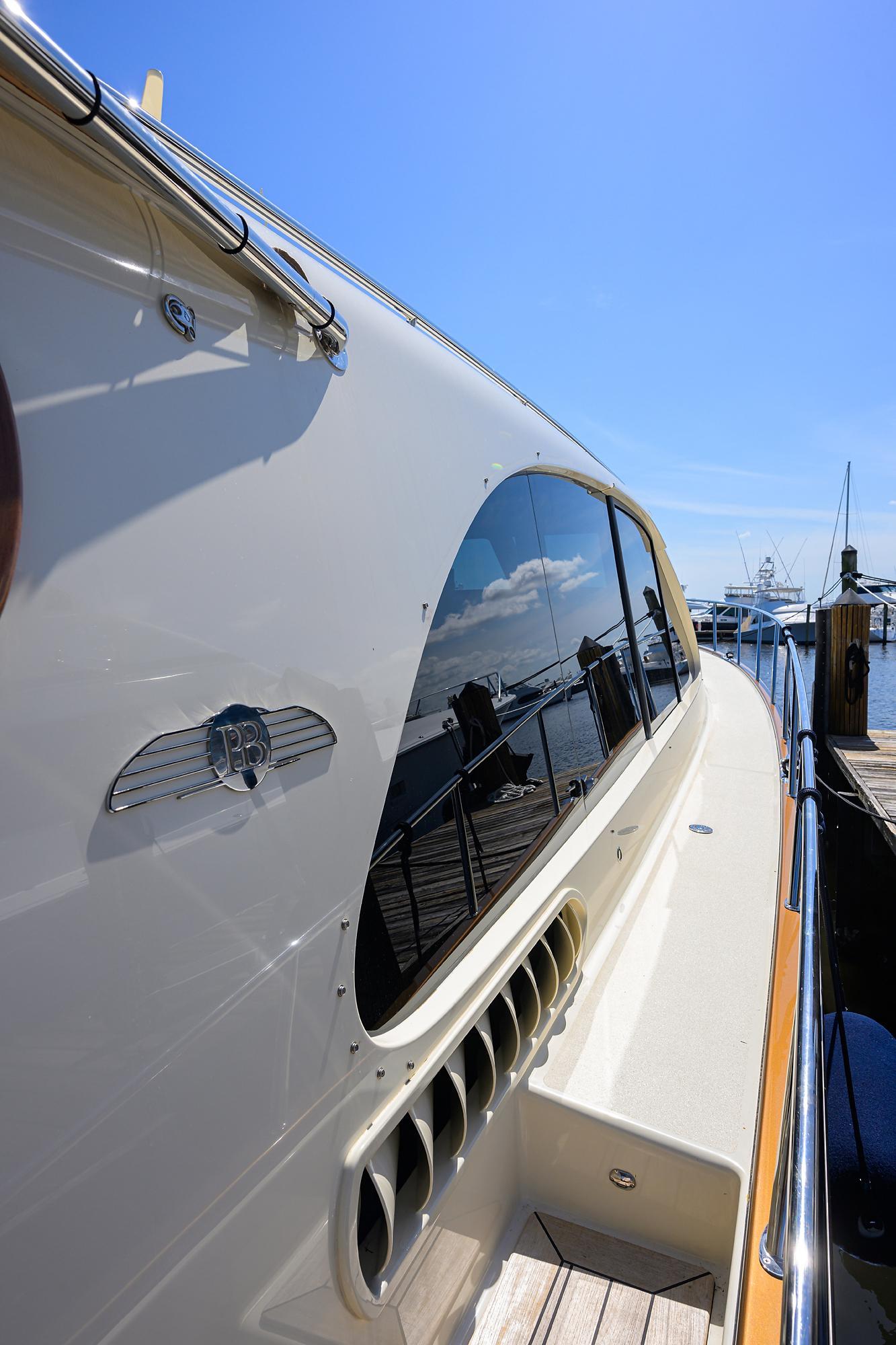 The PB55 showcases Palm Beach’s uncompromising build quality and performance-driven design. Constructed with vacuum-infused E-Glass and carbon fiber reinforcements, her lightweight strength delivers both efficiency and reliability. Distinctive Rolls Royce Peacock Blue hull paint and gleaming teak details complete her timeless profile.
