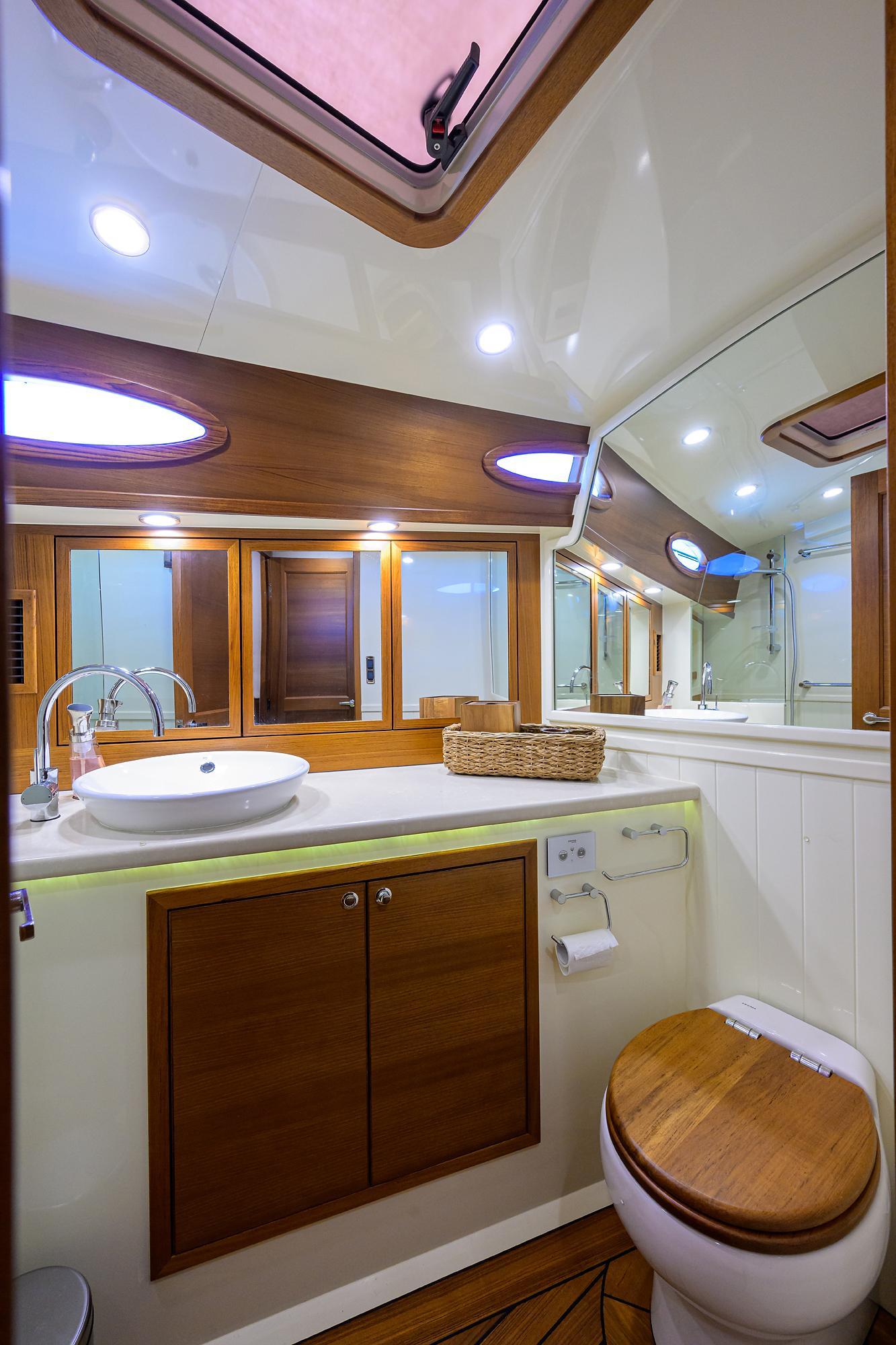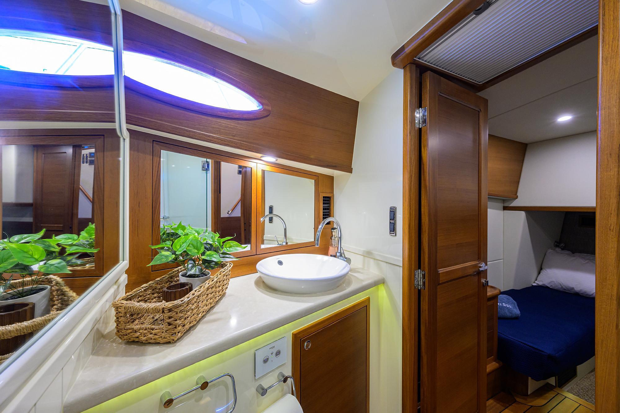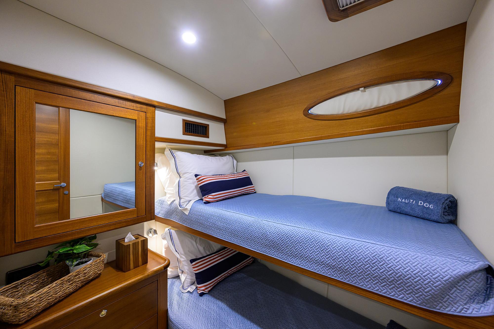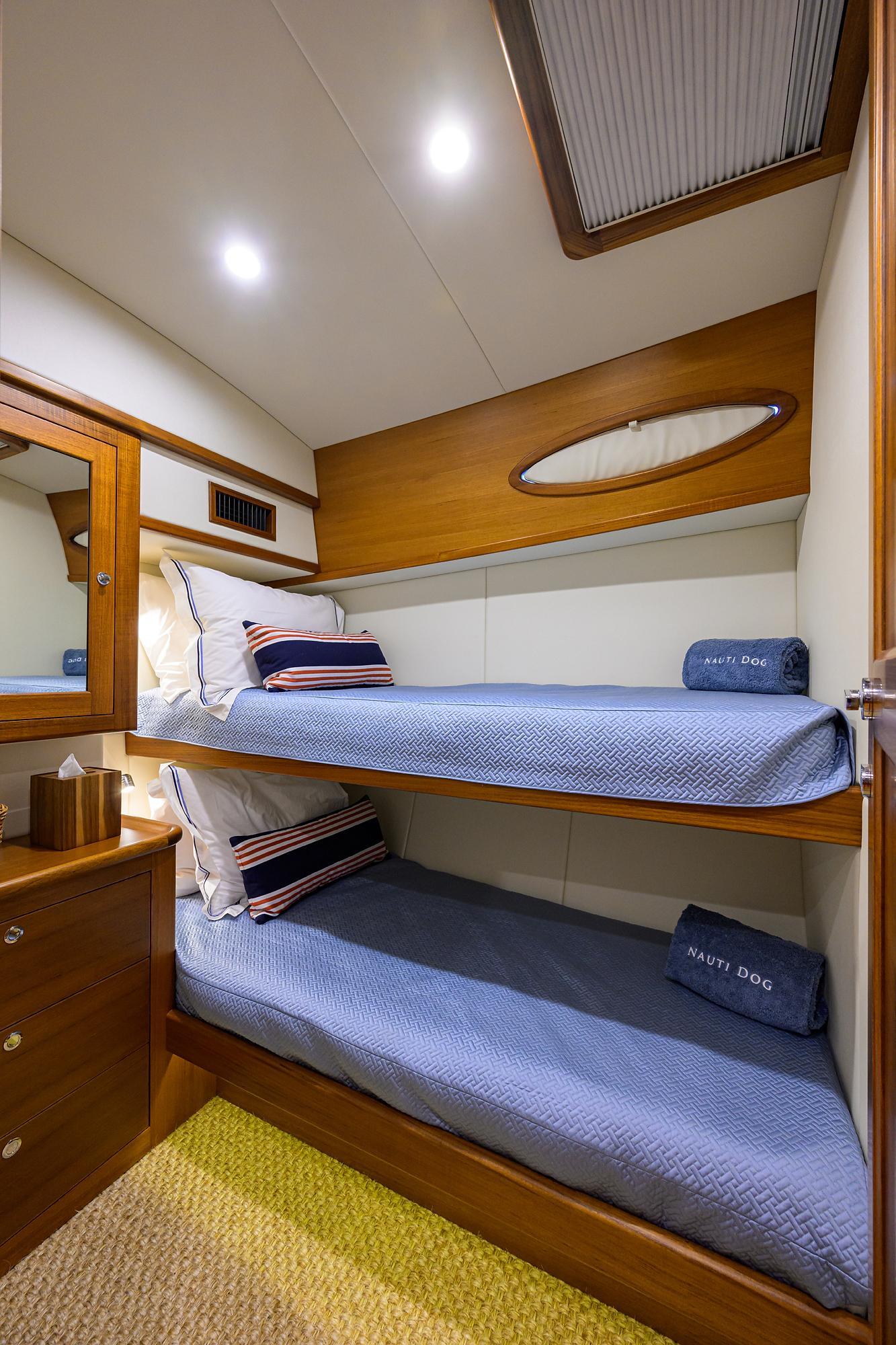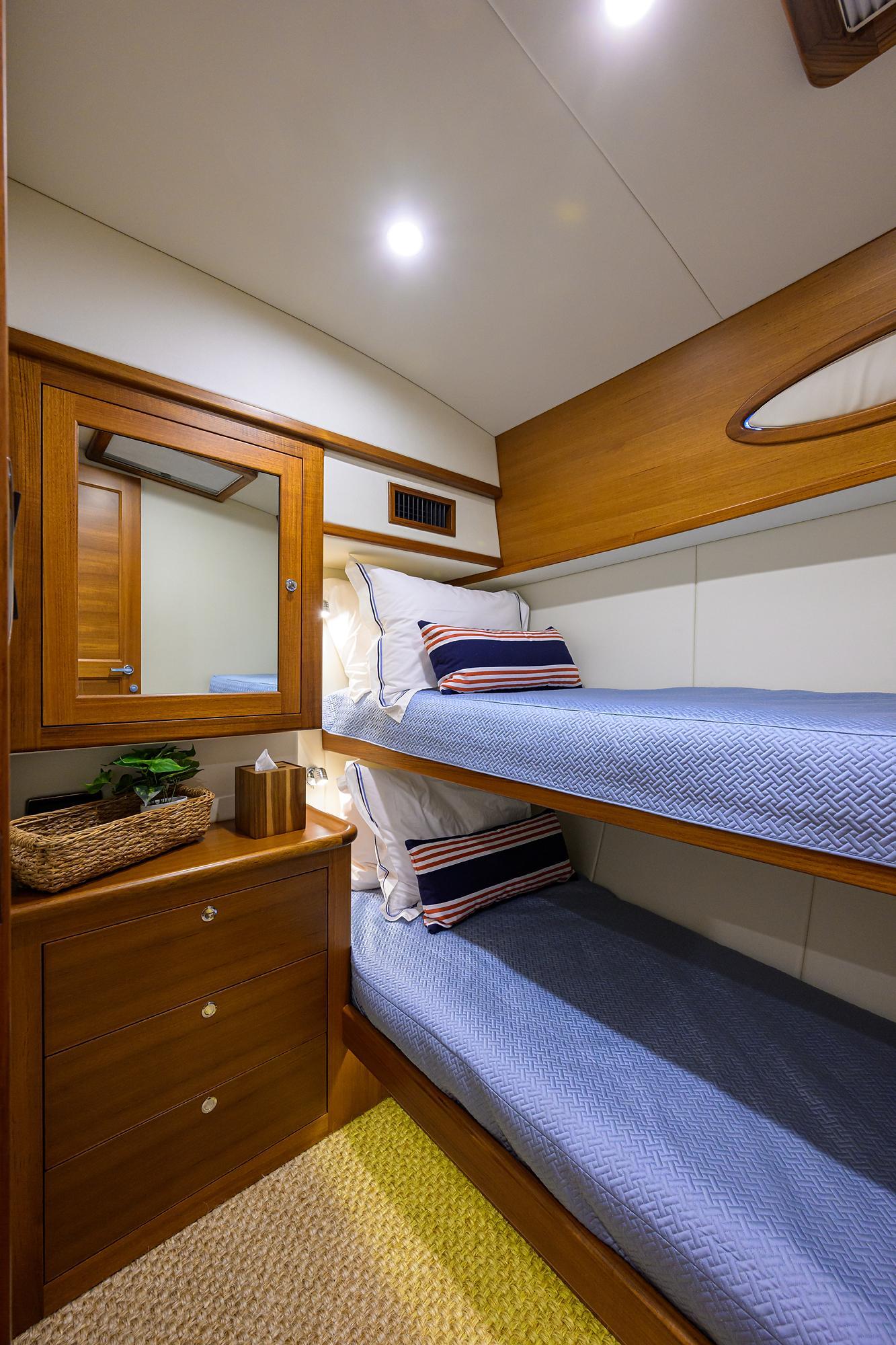 This PB55 offers three beautifully appointed staterooms, making her ideal for family cruising or hosting guests. The master stateroom is a private retreat with a queen island berth, ample storage, and a luxurious en suite head. A set of twin bunks that convert into a queen berth in the VIP and twin bunks in the guest cabin provide comfortable accommodations for six.