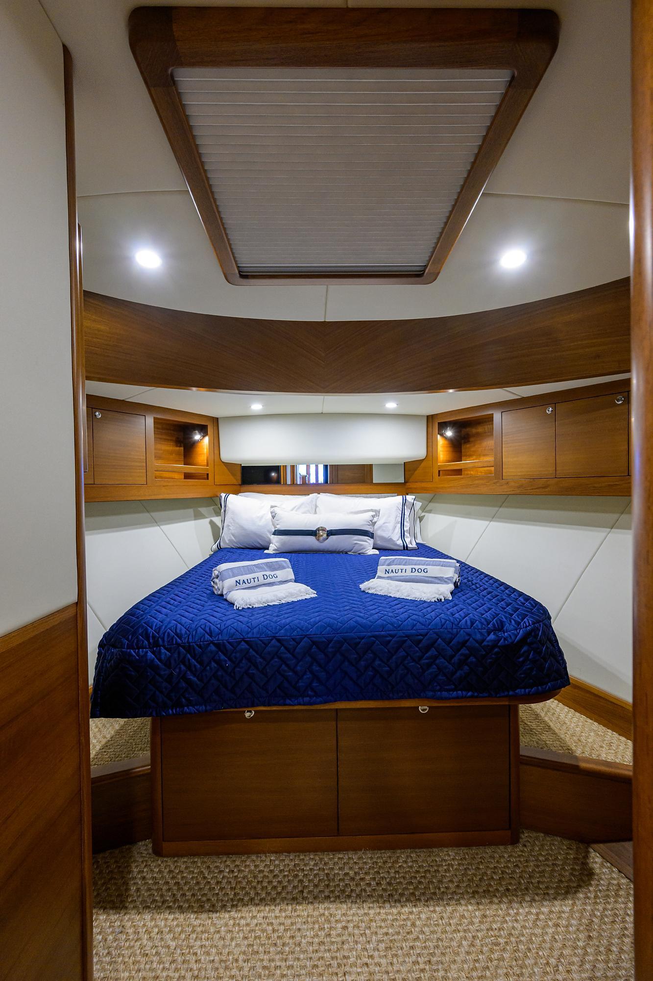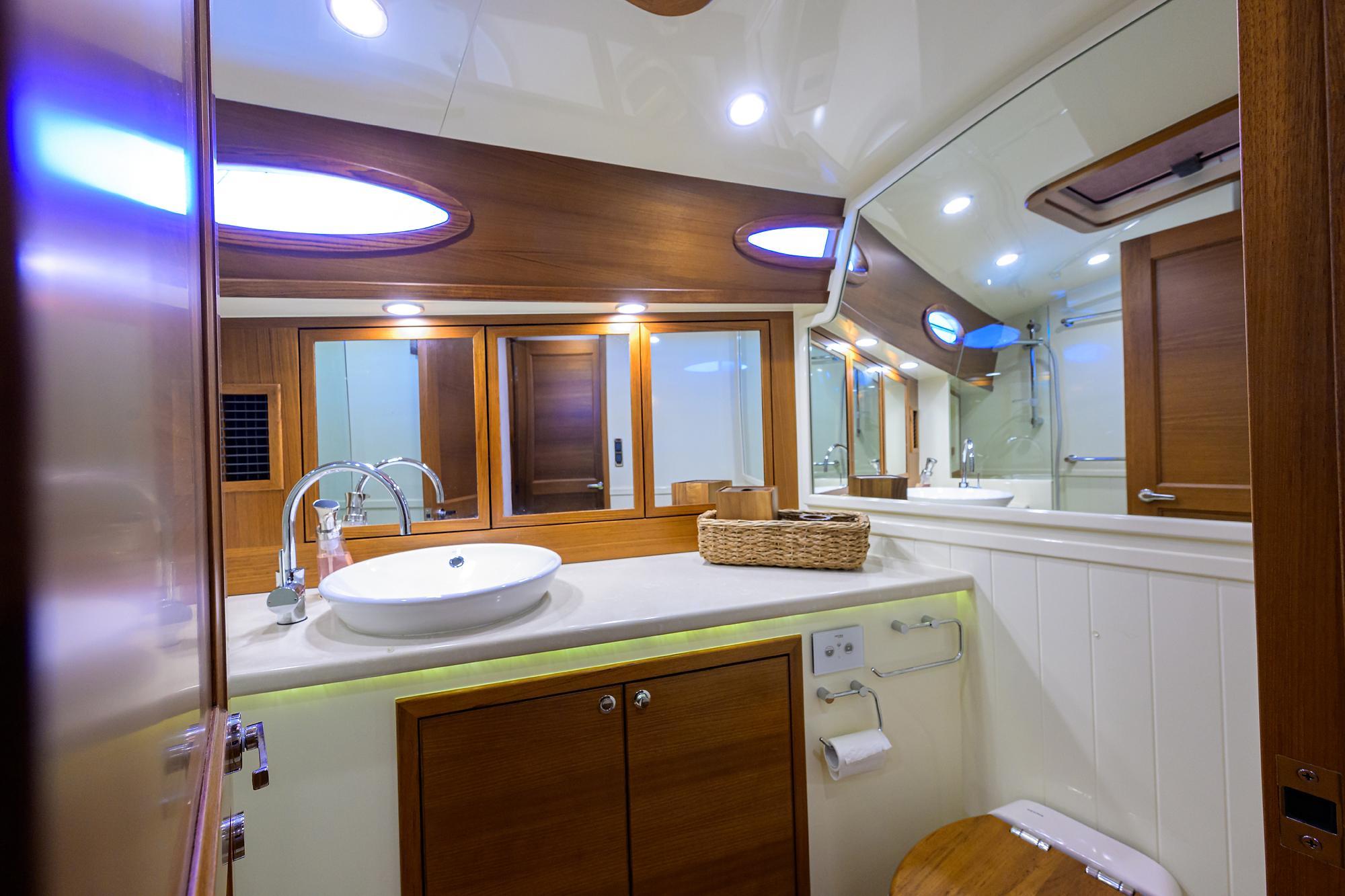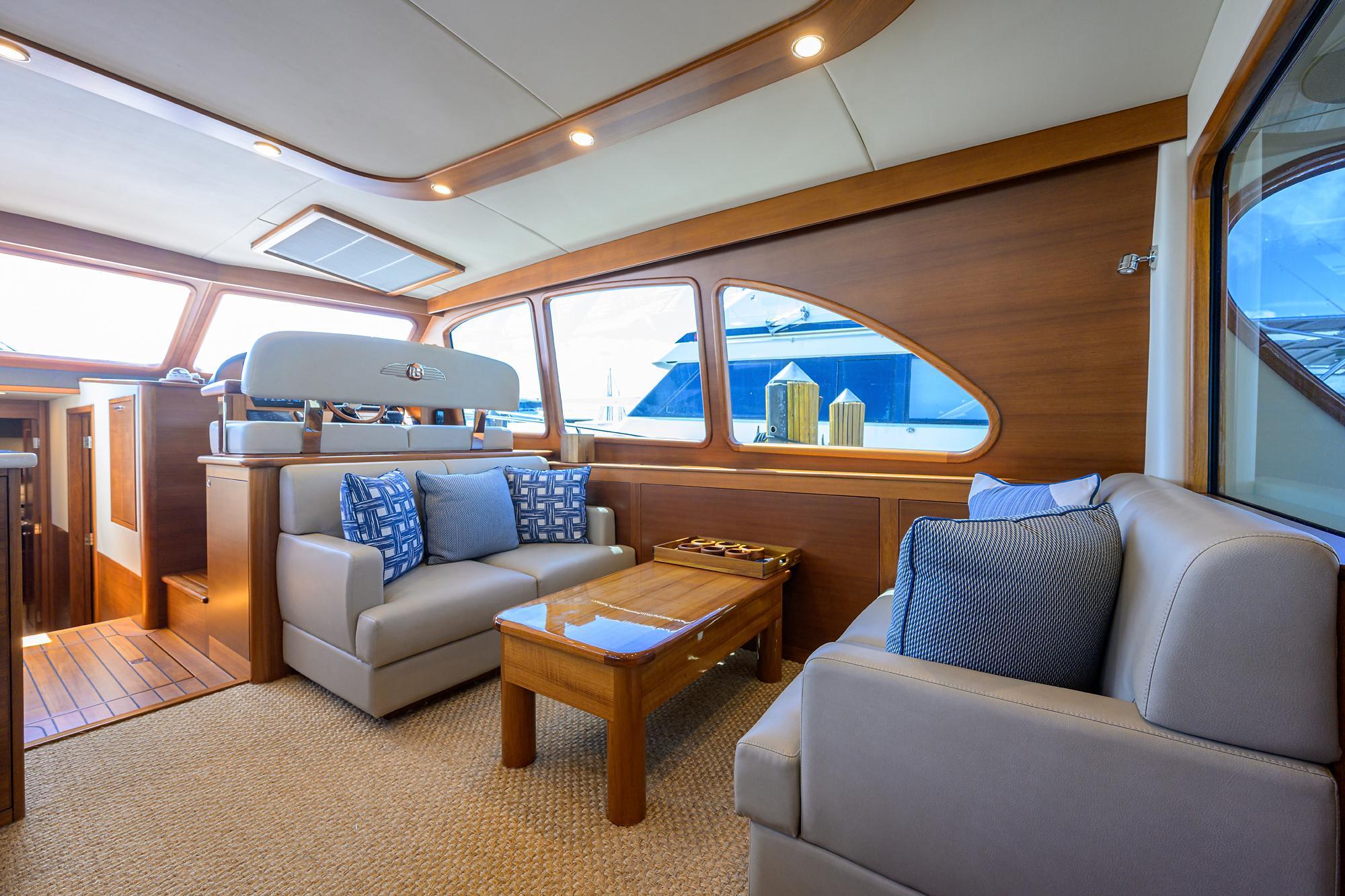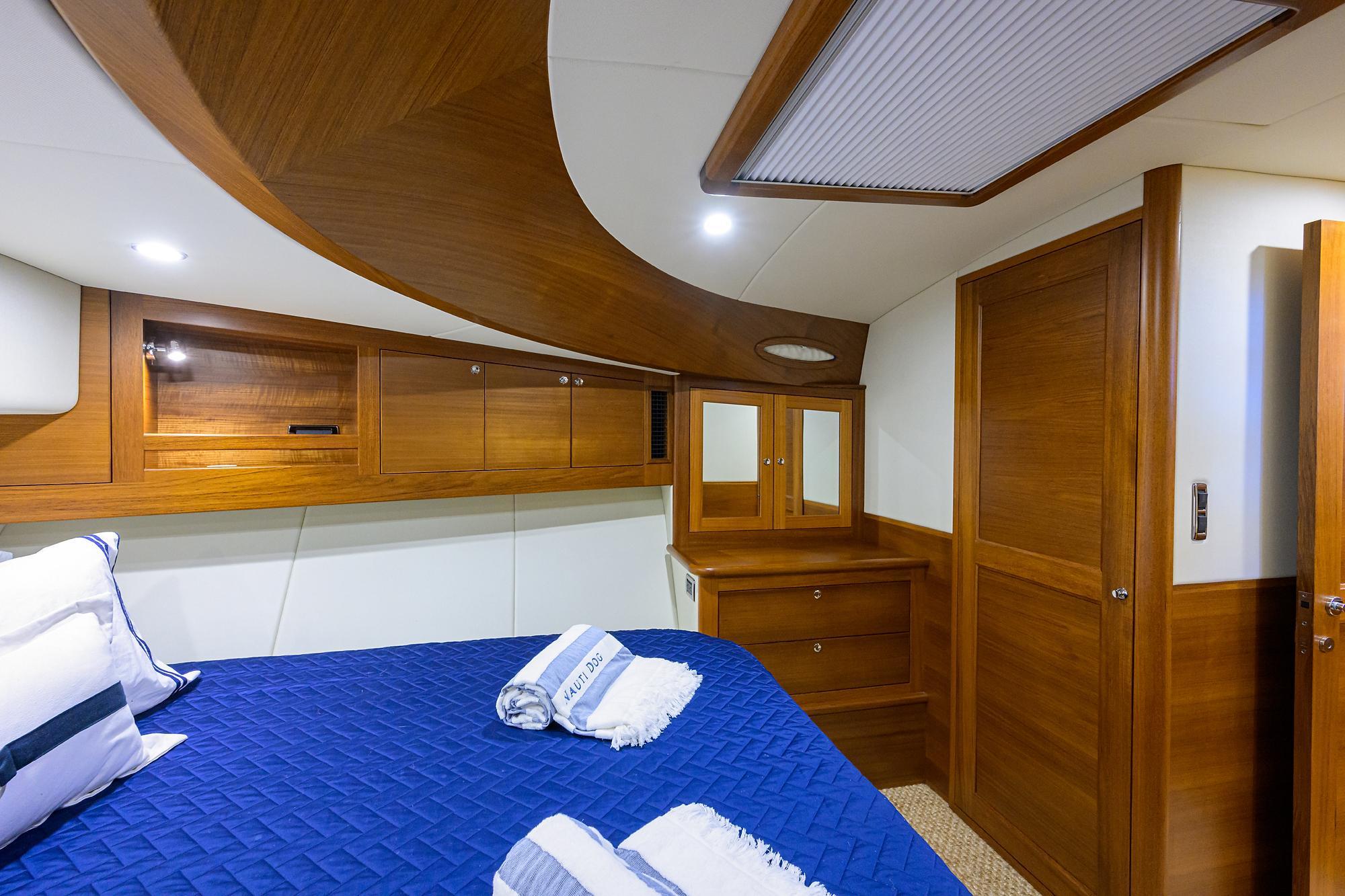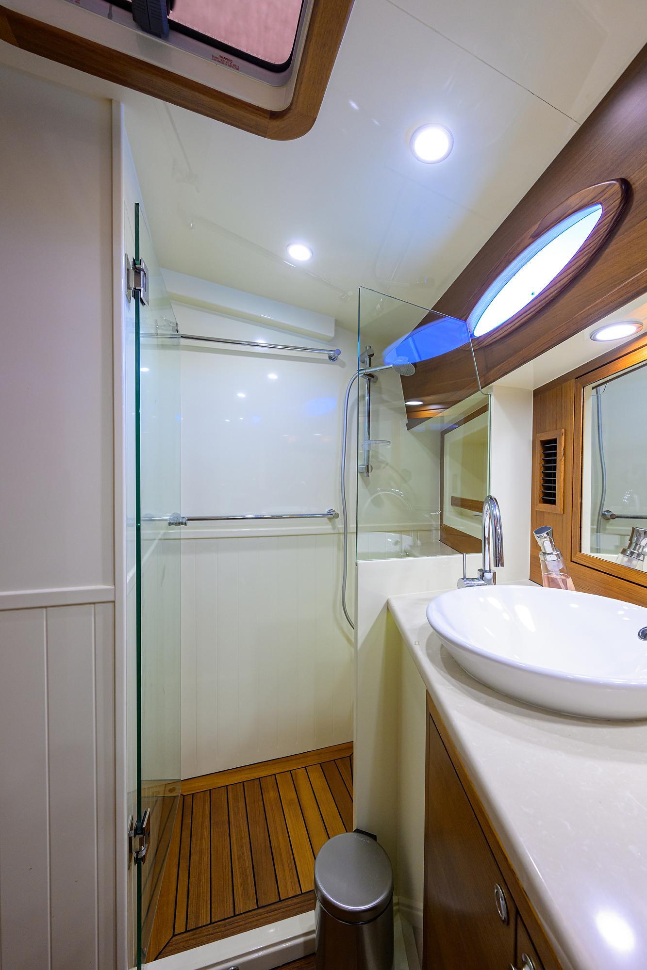 This PB55 offers three beautifully appointed staterooms, making her ideal for family cruising or hosting guests. The master stateroom is a private retreat with a queen island berth, ample storage, and a luxurious en suite head. A set of twin bunks that convert into a queen berth in the VIP and twin bunks in the guest cabin provide comfortable accommodations for six.