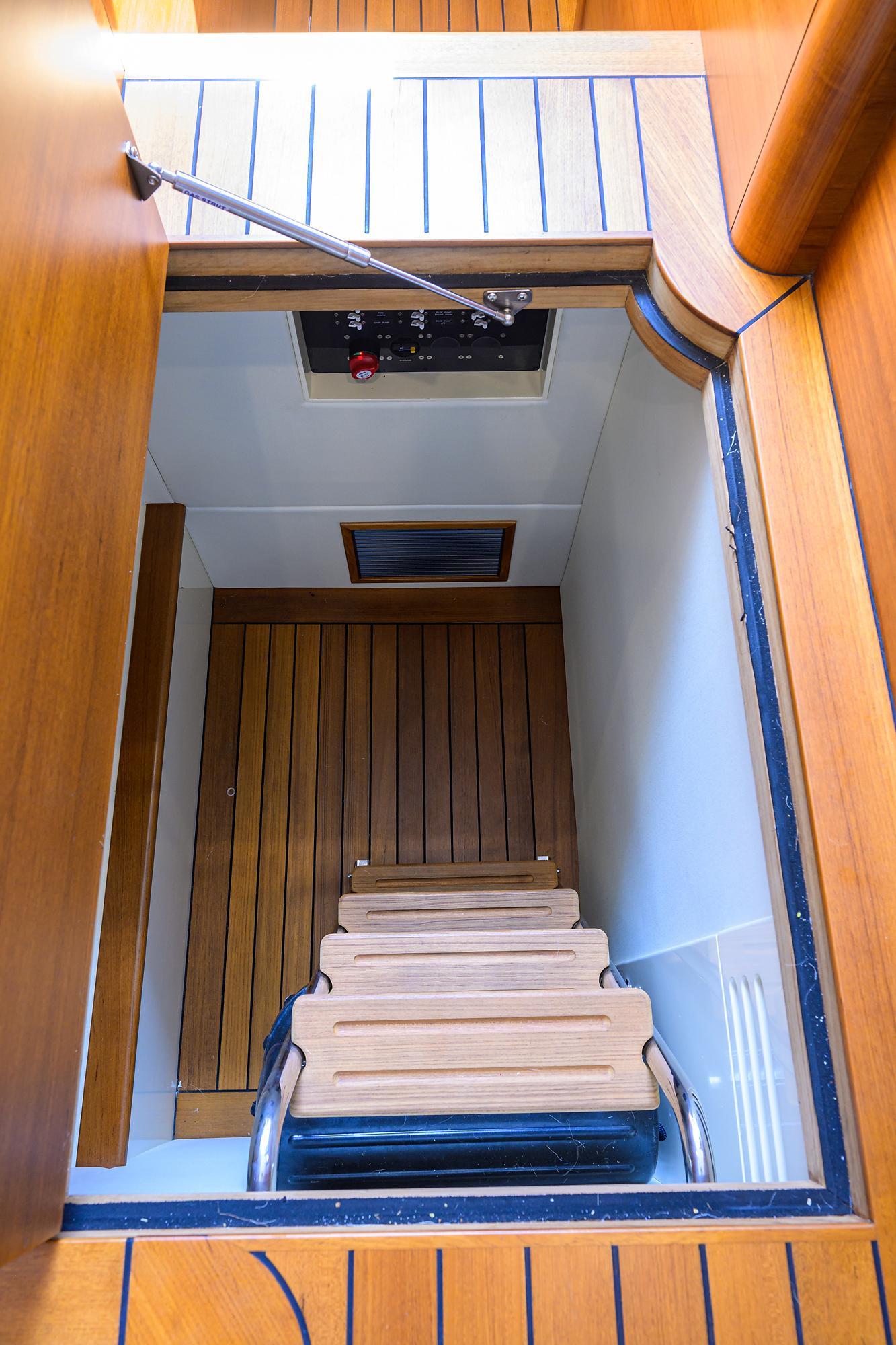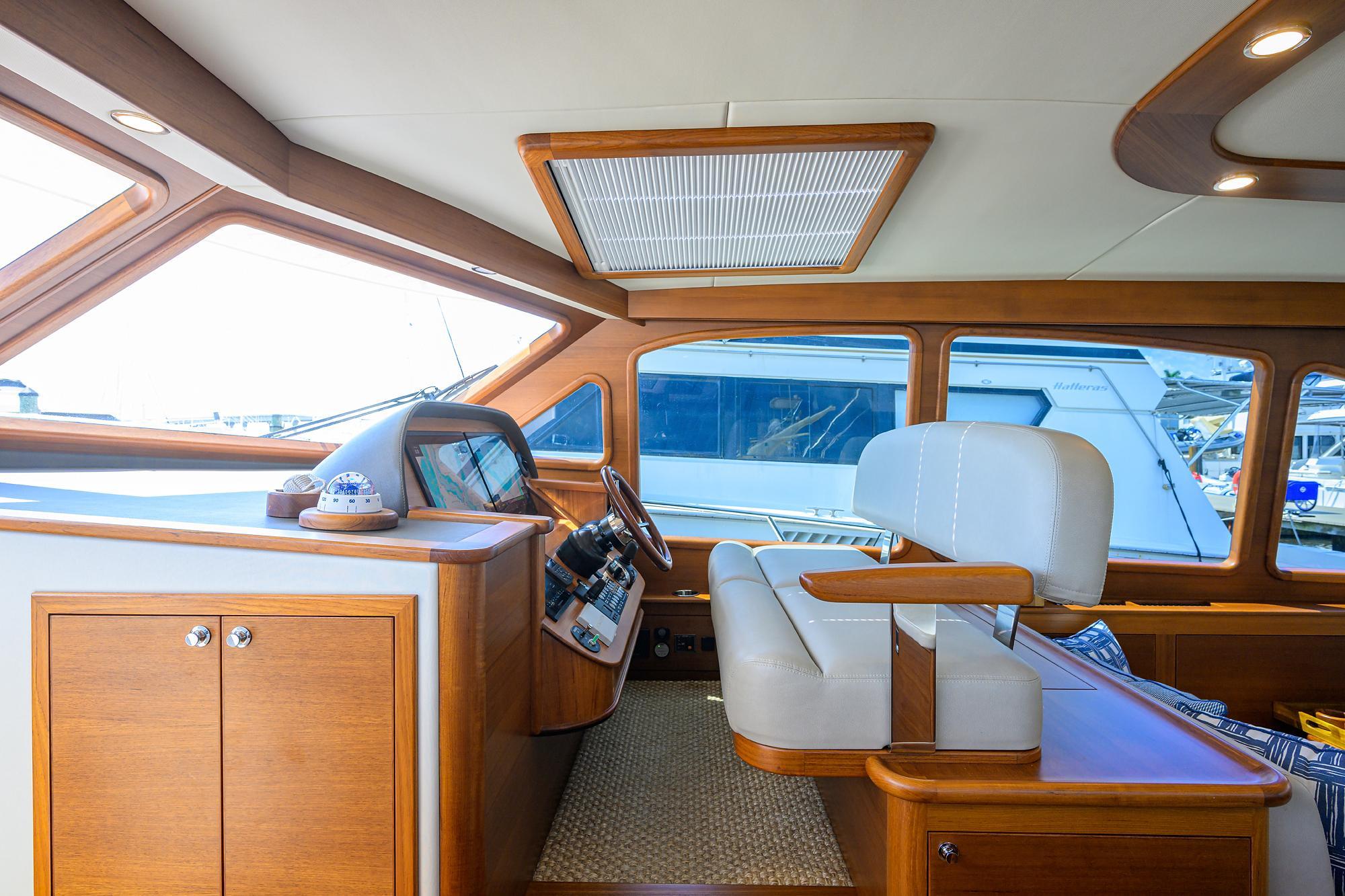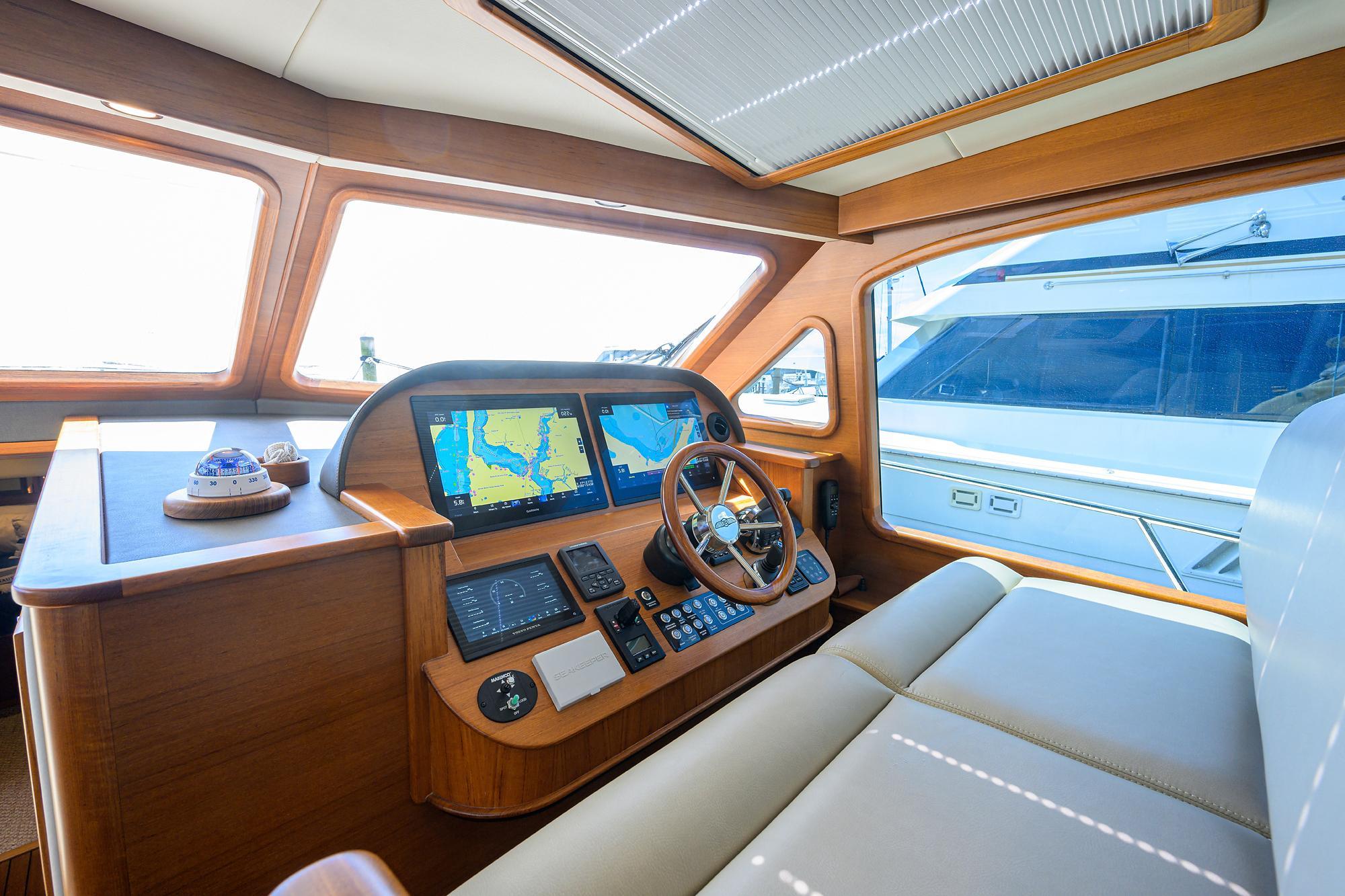 - Ergonomically designed helm station, electronic instrument panel, teak steering wheel and custom helm seating