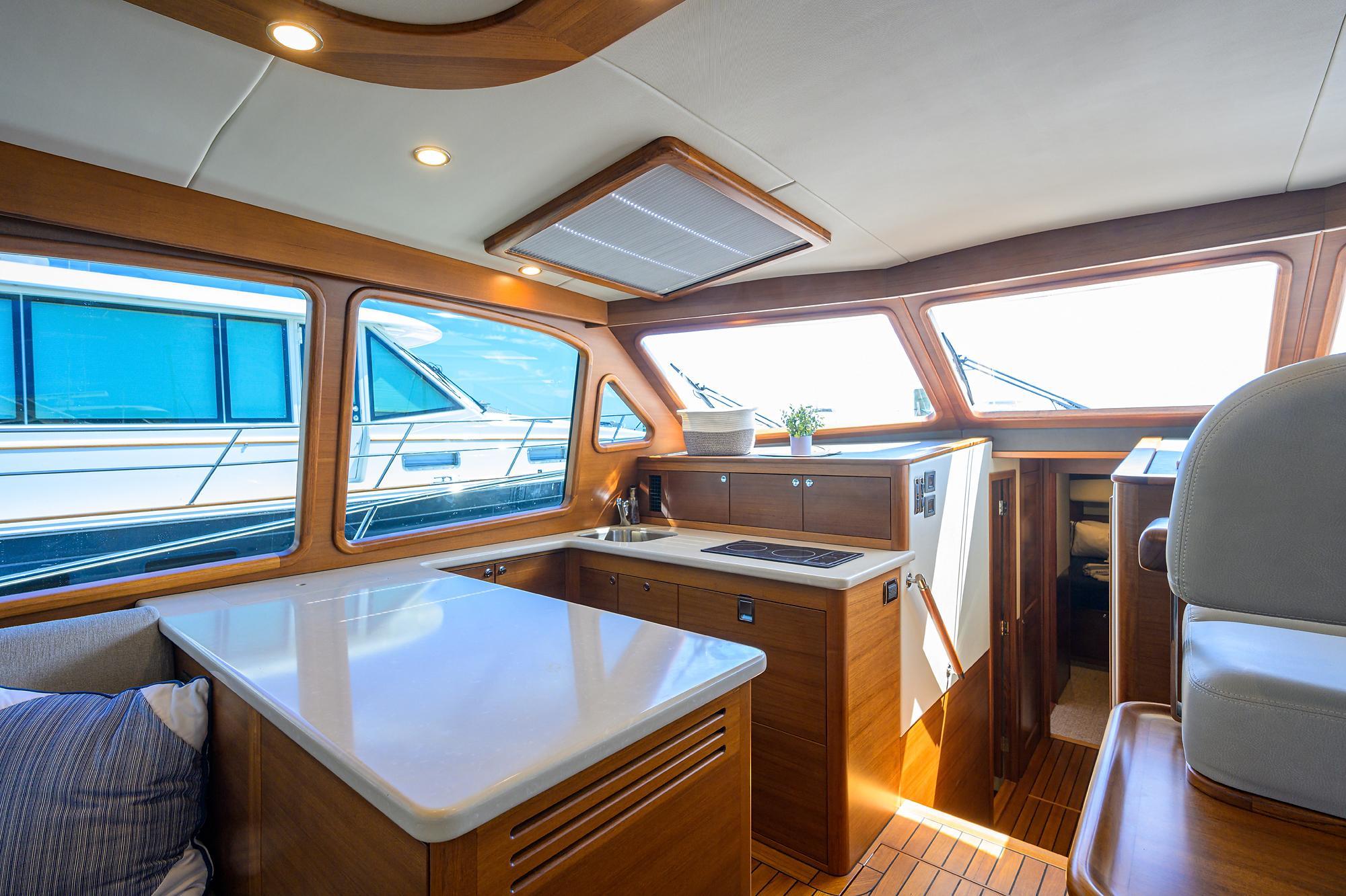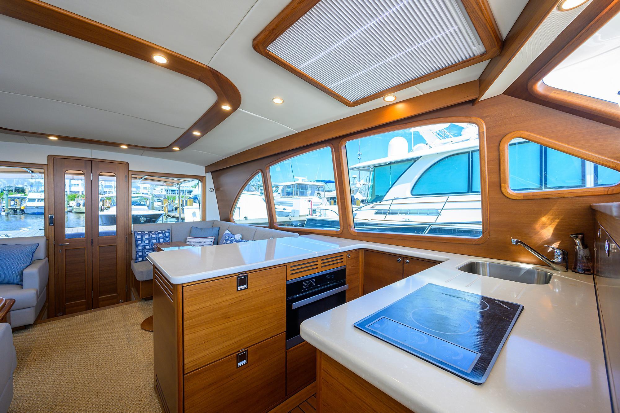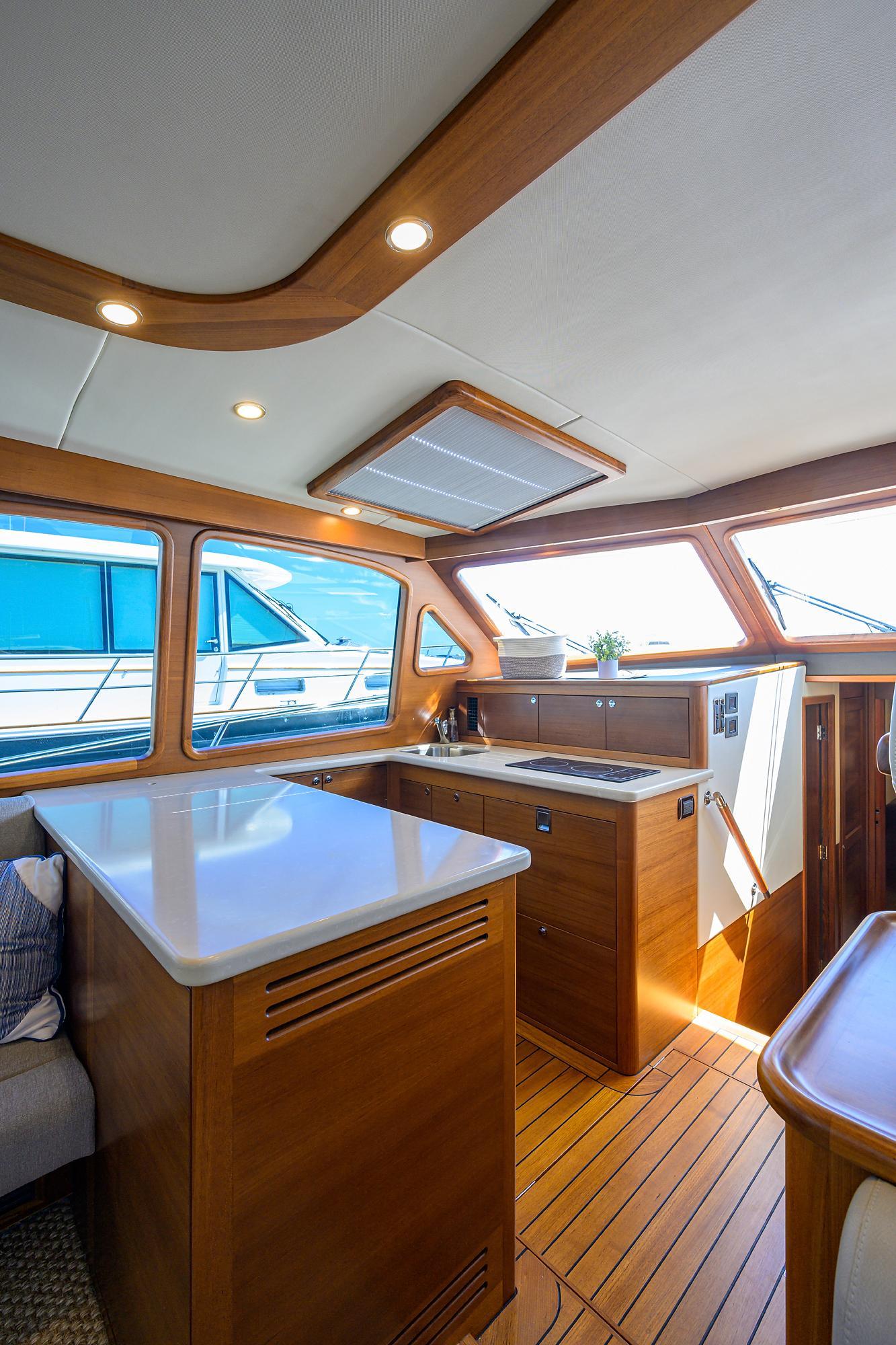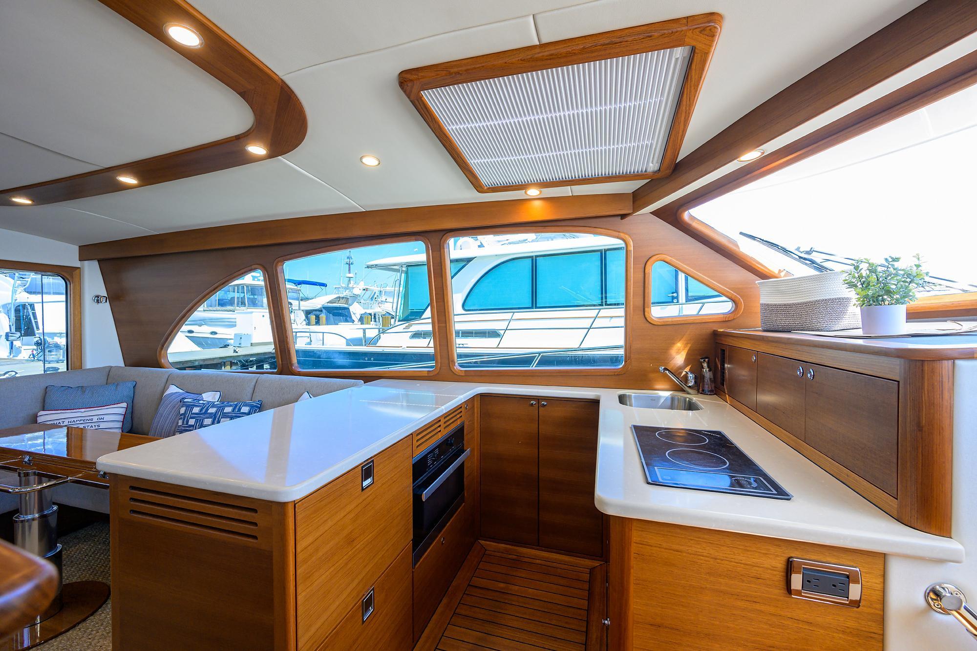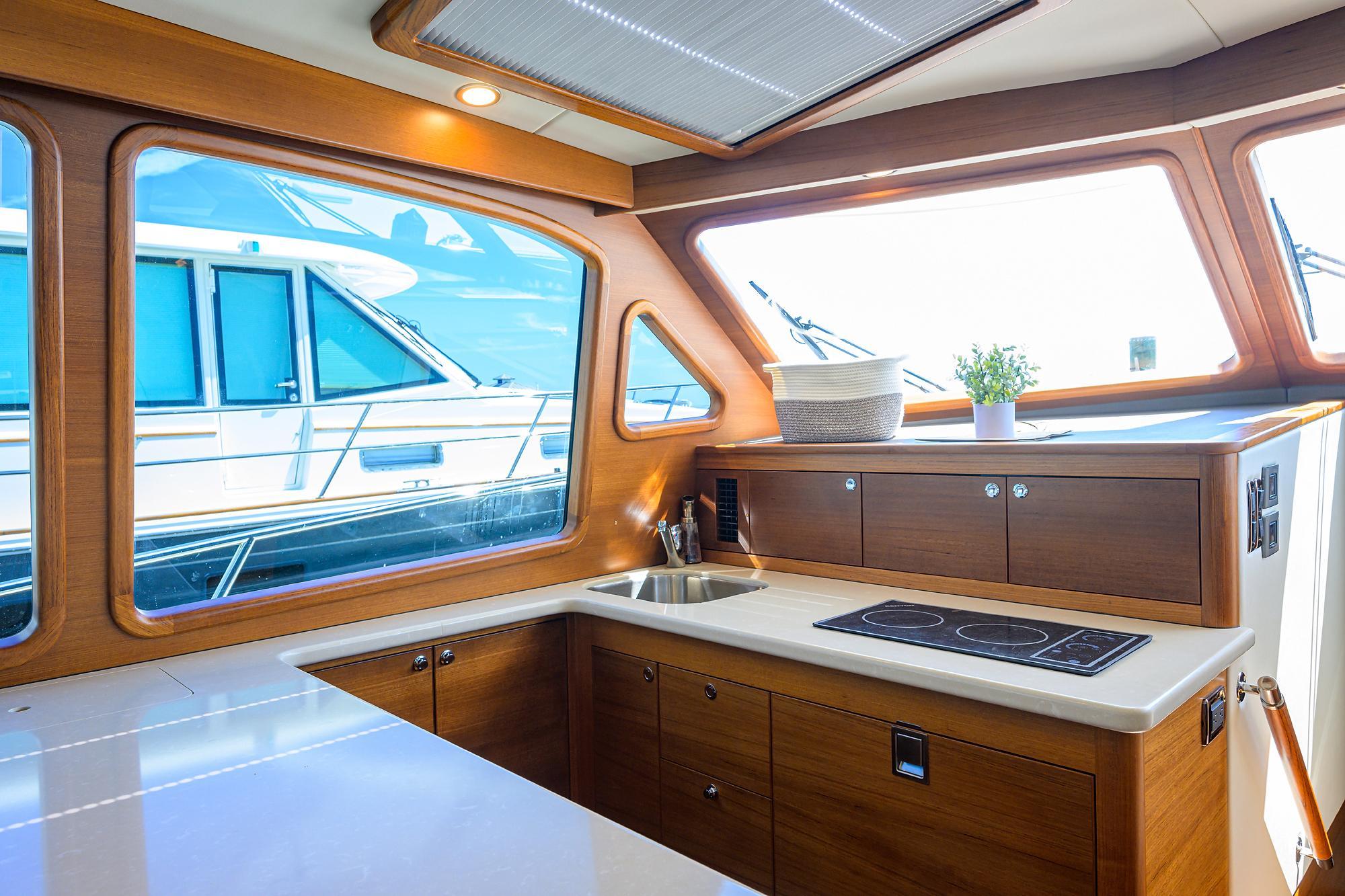 Flooded with natural light through large electrically opening windows, the salon offers a bright, comfortable living space. Opposing lounges, high-gloss teak table, and retractable HDTV create a versatile environment for entertaining or relaxing. Forward, the galley is fully equipped with premium appliances and elegant finishes, designed to meet the needs of extended cruising.