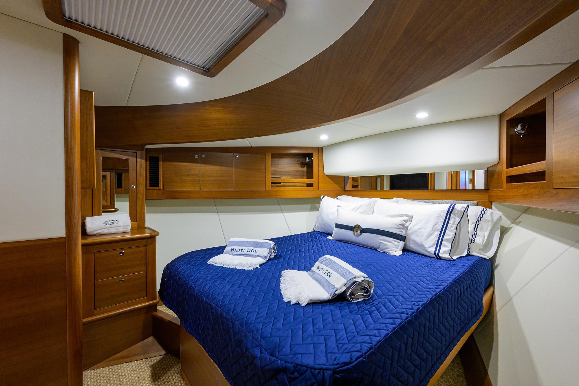 Designed for confident passagemaking, NAUTI DOG balances speed, comfort, and control. Her twin Volvo IPS 950s deliver smooth power and responsive handling, cruising efficiently at 26–28 knots with a top speed of ~33 knots. The Seakeeper 9 stabilizer ensures a level ride, while the Volvo joystick and Dynamic Positioning System simplify docking and station-keeping.
