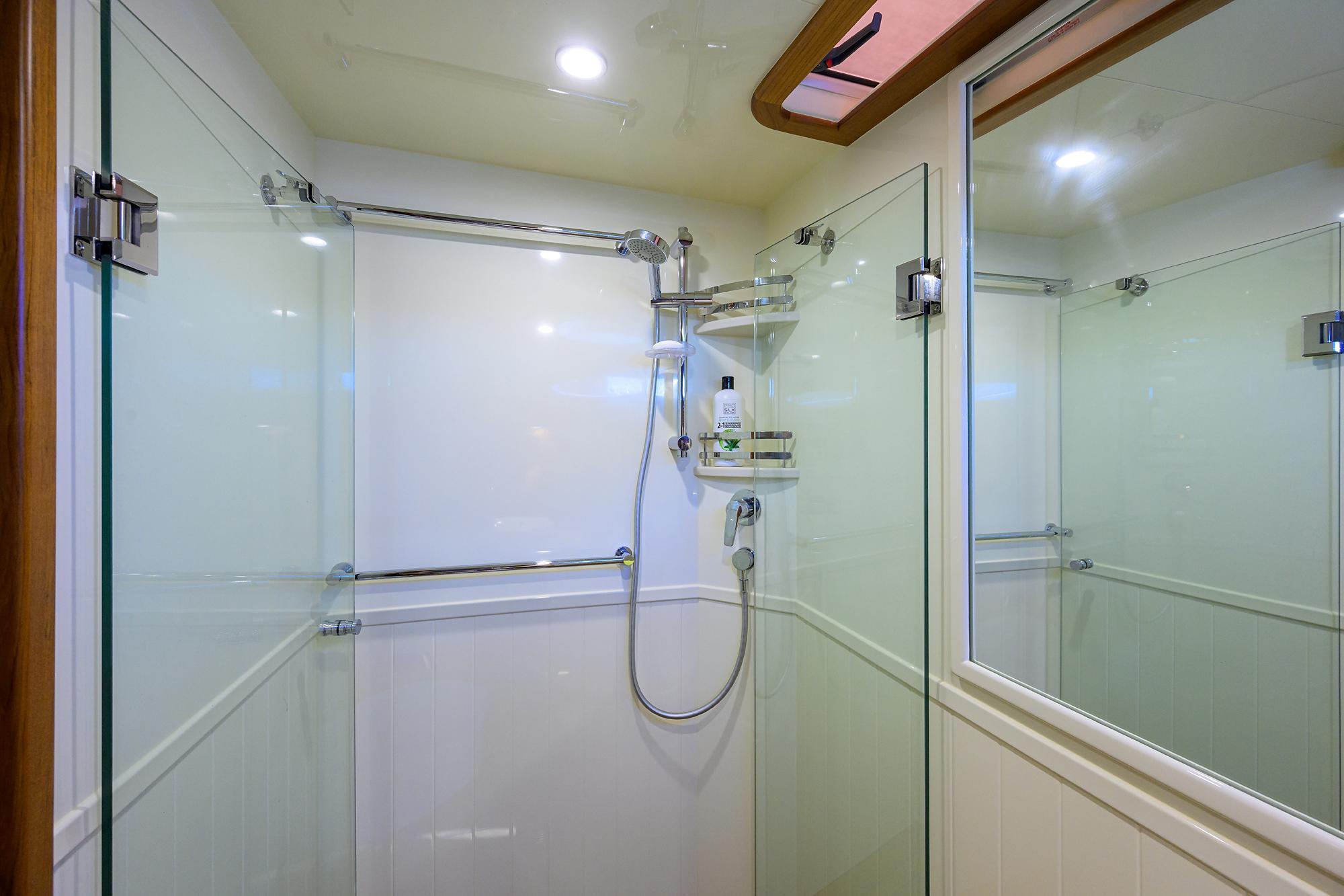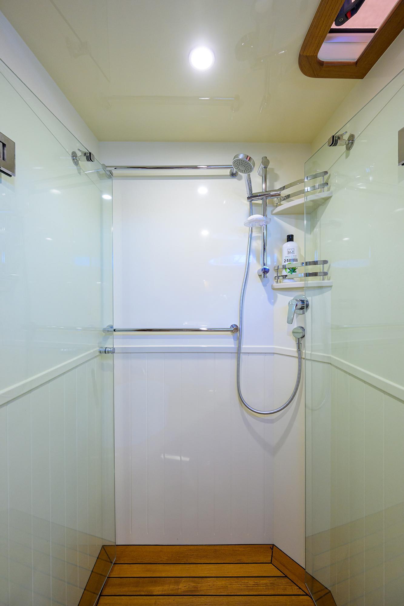 - En suite, fully enclosed comprising of a shower stall with glass partition, frameless glass door and teak flooring