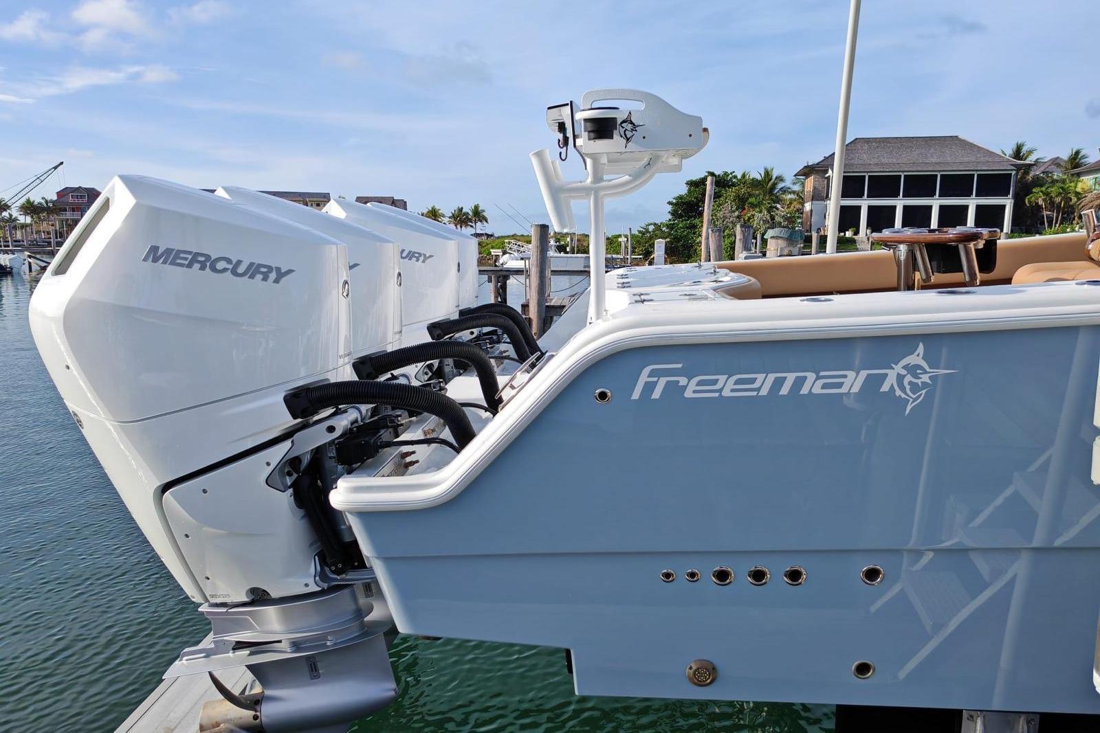 42 ft 2025 Freeman 42Quad Mercury V10 400 hp outboards (1600 hp total) · 40 hoursGarmin helm display · Garmin at rear-facing seats · Garmin in tower · Fusion head unit sound system · StarlinkCruising 45 kn · Max 75 kn · Fuel 800 gal · Fresh water 2 gal · Max bridge clearance 16 ft · Center-console layout · Head in center console · Inverter · Zip Wake attitude control · Custom toggle switch panelPamlico Blue hull · Custom Pipe Designs gap tower · Custom windlass (Coast 2 Coast install) · Carbon-fiber outriggers · 3 SHOX pedestal bases · Custom plexiglass windshield · Teak trim on seating · Teak helm wheel · Full Deckit on deck & in all hatches · Chiller plates (drink boxes & starboard coffin box) · 4 electric-reel outlets—Built to fish hard and run fast, this 2025 Freeman 42 shows a meticulous custom spec from topside to transom. The Pamlico Blue hull, gap tower by Custom Pipe Designs and carbon outriggers set the tone, while Garmin displays at the helm, rear-facing seats and tower keep navigation and bite intel visible from every station. Starlink adds reliable connectivity offshore, and the custom toggle panel keeps frequently used systems at your fingertips.On deck, SHOX pedestals and full Deckit traction support long days on the run. Chiller plates in the drink boxes and starboard coffin box keep provisions and catches cold, the Coast 2 Coast windlass simplifies anchoring, and Zip Wake helps dial in attitude at speed. With an inverter, a head in the console, teak details throughout and just 40 hours on quad Mercury V10s, this 42 is turnkey and tournament-ready.Contact Allegiance Yachts to arrange your private viewing.