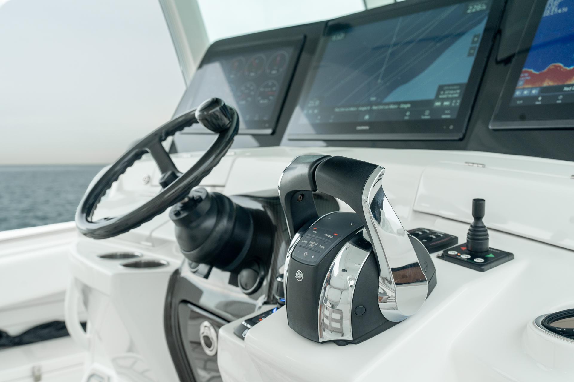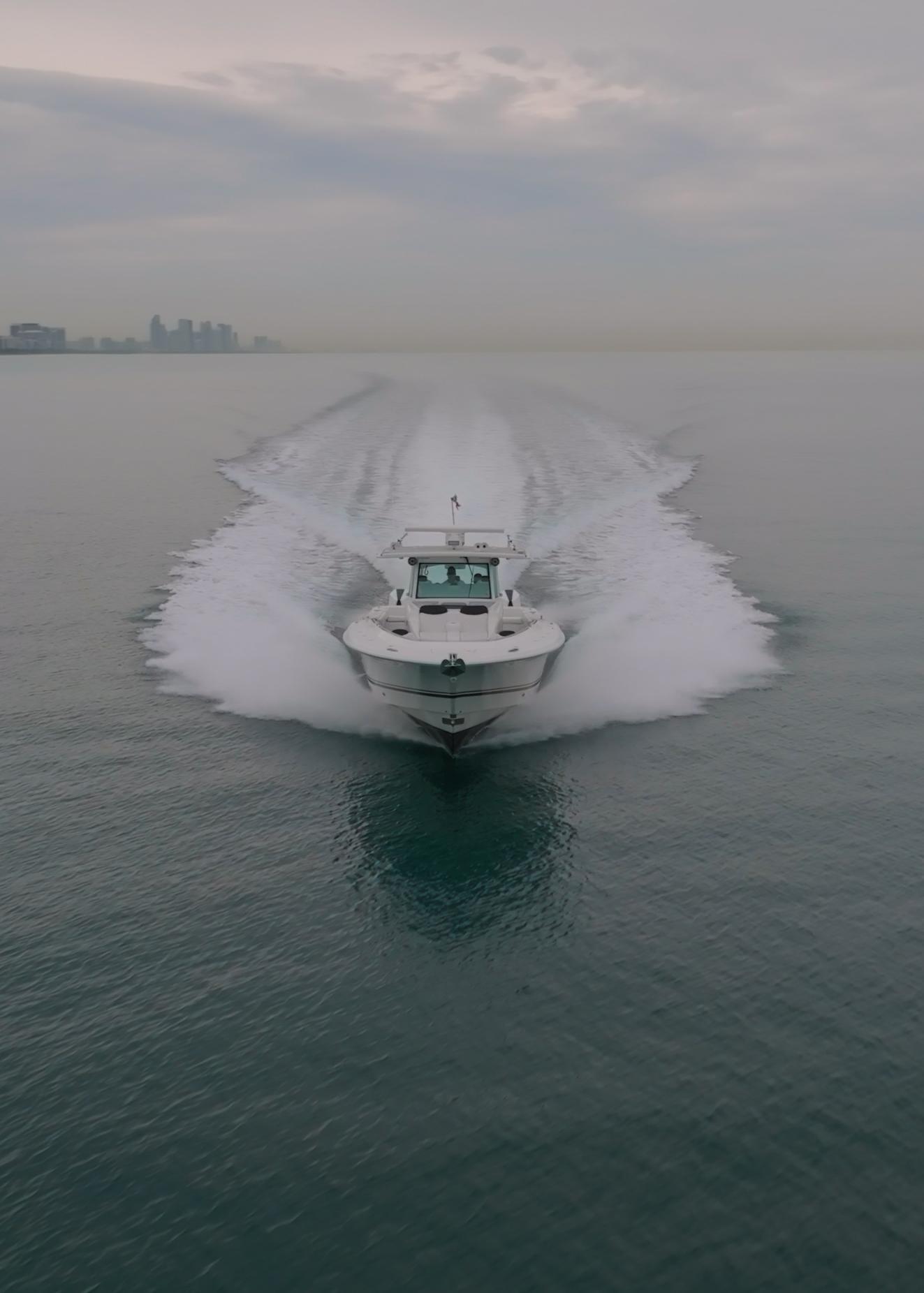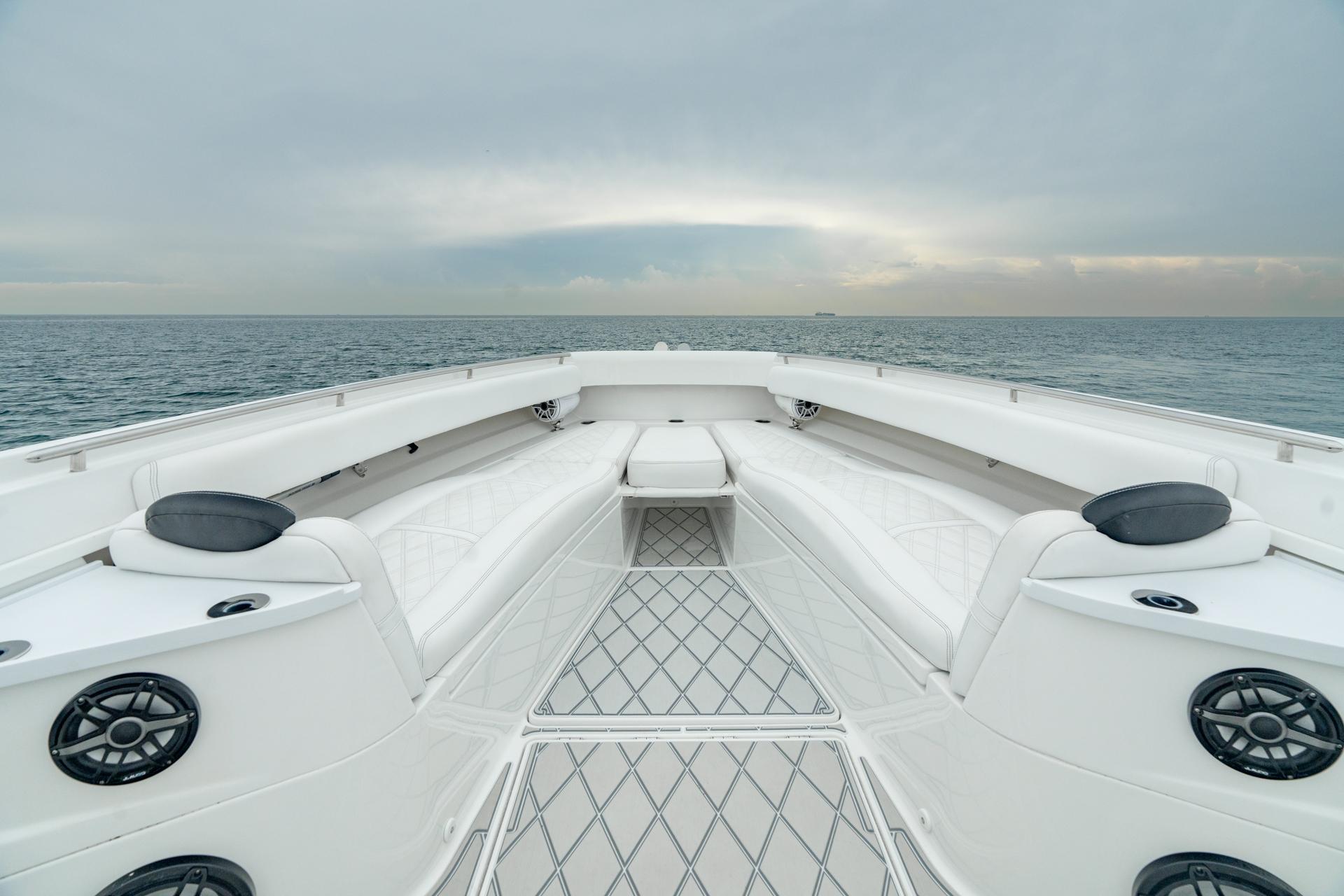 Finally, a large center console yacht with the sophisticated design to perfectly balance speed, ride, comfort, and all of the luxury of your “dream” yacht. The bow area is dual purpose with seating to accommodate guests on the forward-facing lounger or around bow seats and table that convert to a large sun pad for lazy days catching rays; or remove the cushions for a fully functional fishing platform. The luxuriously functional cabin with queen sized berth, storage galore, galley kitchen, and separate head/shower compartment is the perfect place for air-conditioned comfort on hot days as well as longer trips with overnight stays. An automotive inspired helm station allows the captain to be fully aware of the surroundings while staying in tune with the endless functionality on-board including: charts and navigation, Sea Keeper®, generator, ample stereo system, the quad engine package, and more. For the uncompromising, the Sueños will satisfy any experience you can imagine, and take you places few other Center Console Yachts dream to embark.