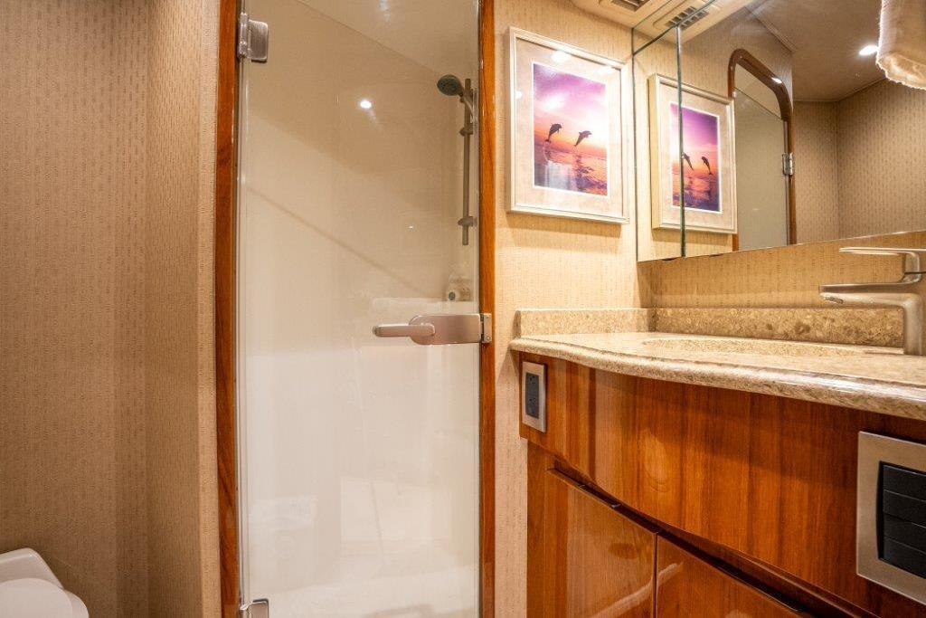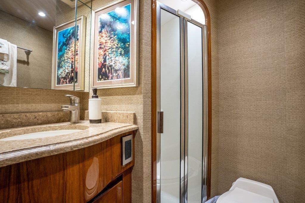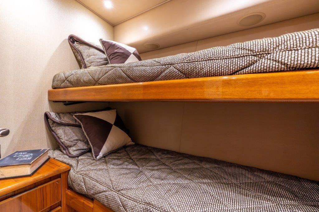 Aft to starboard featuring upper pullman and standard lower berths, TV, large hanging lockers and credenza. Adjoining is a private head with stall shower. Inside access to engine room