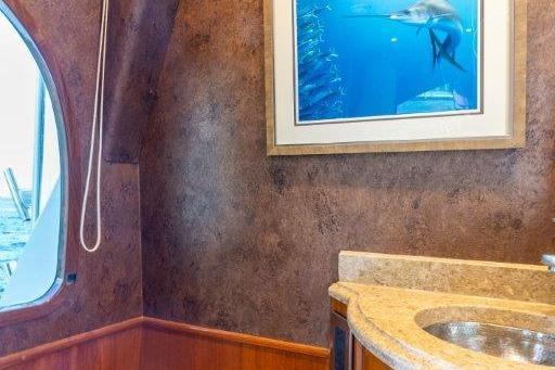 The command center was designed for ease of operation and total cruising/fishing comfort. Three Release seats at the helm, lounge seating port and starboard with rod storage, forward seat with refrigeration underneath. Electronics and controls overhead are cleverly installed in a retractable drop-down box, side access compartments that close to conceal and protect the equipment, helm air conditioning, custom Palm Beach Towers tuna tower with controls and electronics.