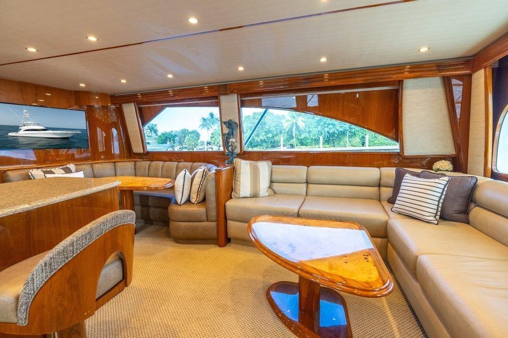 To starboard aft is the L-shaped lounge and cocktail/dining table. Forward is the comfortable 6 place dinette with additional TV forward, opposite is the galley with an island counter, microwave/convection oven, under counter refrigeration, (2) bar stools and an abundance of door and slide out storage. Aft to port is the entertainment center with a pop-up TV. The convenient day head is aft to port.
