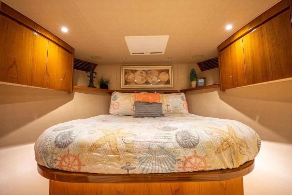 Centerline queen berth, flanked by generous storage, entertainment center, ample storage in hanging lockers and beneath berth. Overhead hatch for natural light and ventilation. Adjacent aft to port is the very spacious head with stall shower.