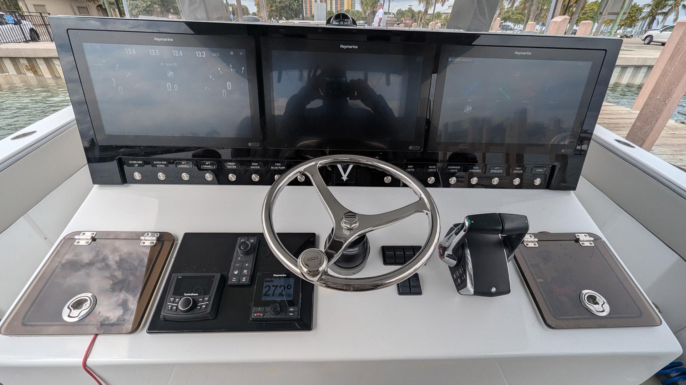 The Vela 368 Catamaran brings the best of both worlds. With the incredibly smooth ride that only a cat hull can provide. One part performance fishing boat, one part luxury cruiserWith comfortable bench seating in the bow, and transom fold-down cushioned seating in the stern, the Vela 368 is perfect for a full day of deep-sea fishing or a comfortable day at the sandbar. The clean layout, dash, and components are intuitive, easy to use, and make a day on the water a breeze. Complicated start-up/shut down procedures are a thing of the past. The simple cockpit layout allows you to fight a fish without obstacles in your way. The boat has 4x2025 Mercury Verado 300hp motors with only 10 hours. Interior soft goods are also new in 2024.