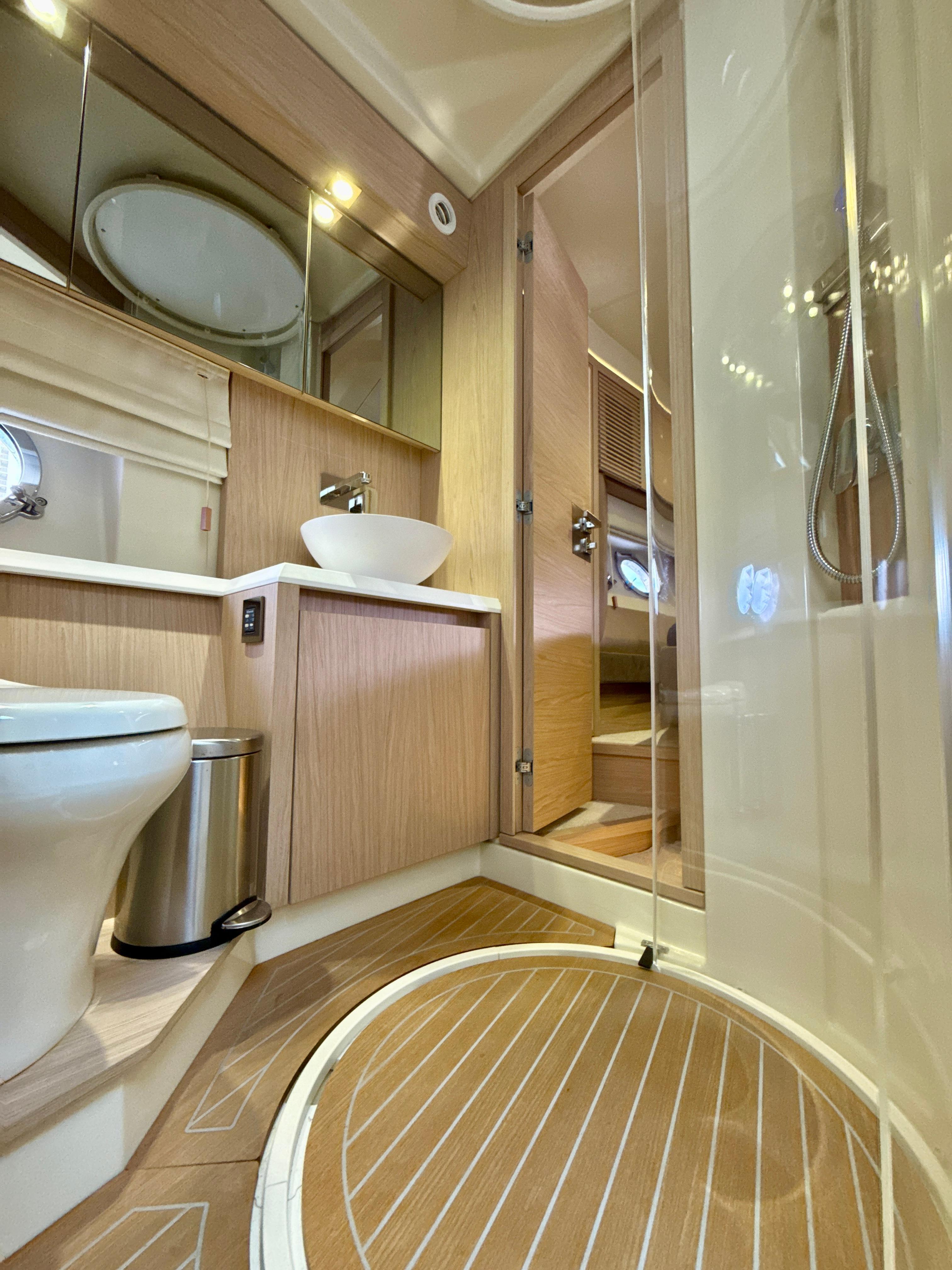The Owner's Cabin is midship, under the Salon. It's a spacious, inviting room with lots of natural light coming from two nearly floor-to-ceiling round windows (with smaller opening ports inside), as well as a skylight. The bed has a beautiful back rest, and side tables with drawers and plugs. There are bench seats by each windows that could sleep small children. For storage there are 2 hanging lockers, and three storages underneath the Starboard seating (big enough for a carry-on luggage in each), and storages underneath the large flat screen TV (With it's own sound system). Finally, there is an en-suite head with a large separate shower. True "owner's quarters".