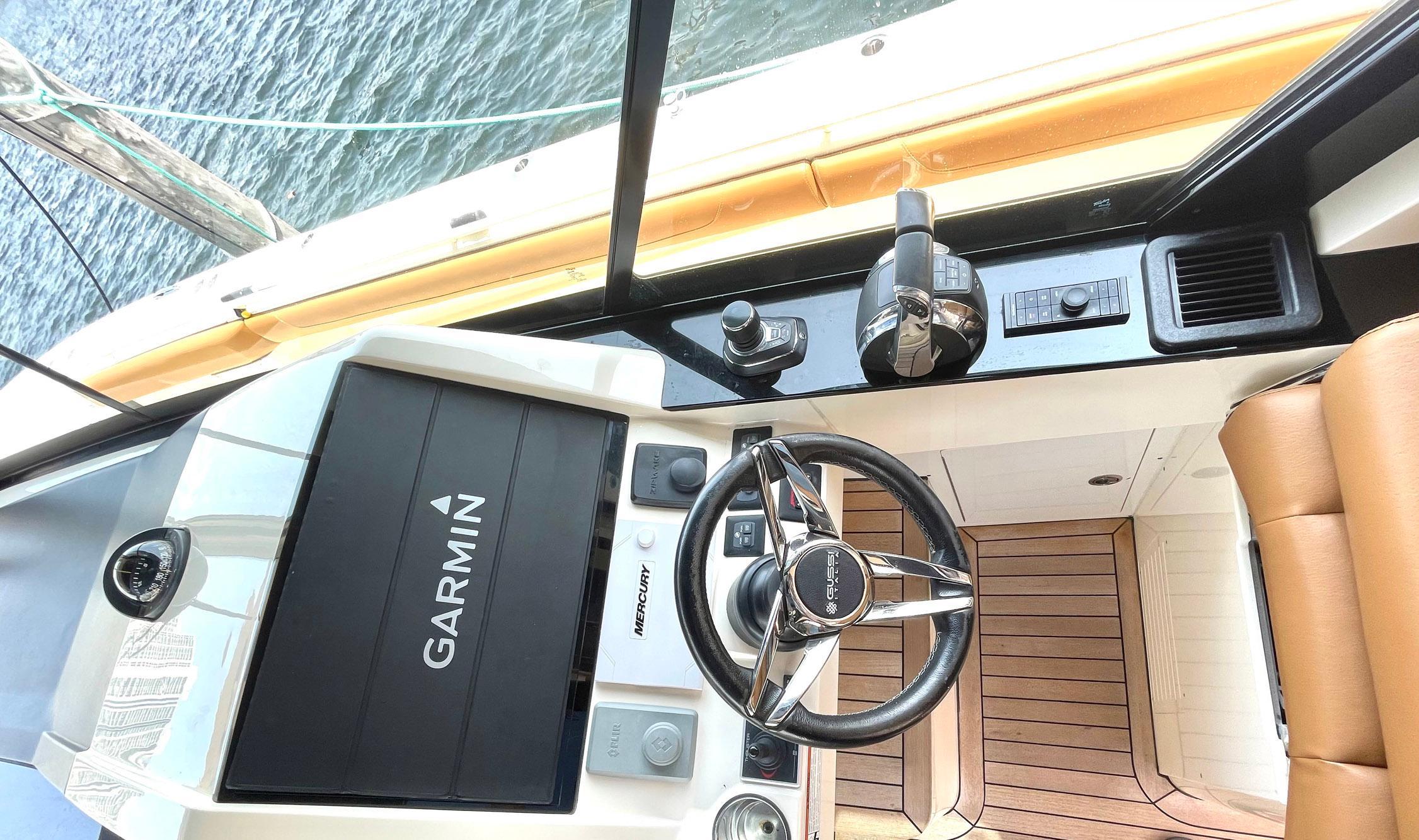 - Main helm located to the starboard side with adjustable captains helm chair, Garmin 8624 GPS touchscreen, bow thruster control, go light searchlight control, FLIR night vision, Mercury view digital display, Zipwake tabs digital display, Ritchie compass, Mercury Joystick with Skyhook feature, Garmin auto-pilot, another touchscreen garmin & switches located over head, & Garmin VHF 315 radio, &Garmin VHF 800 AIS Radio