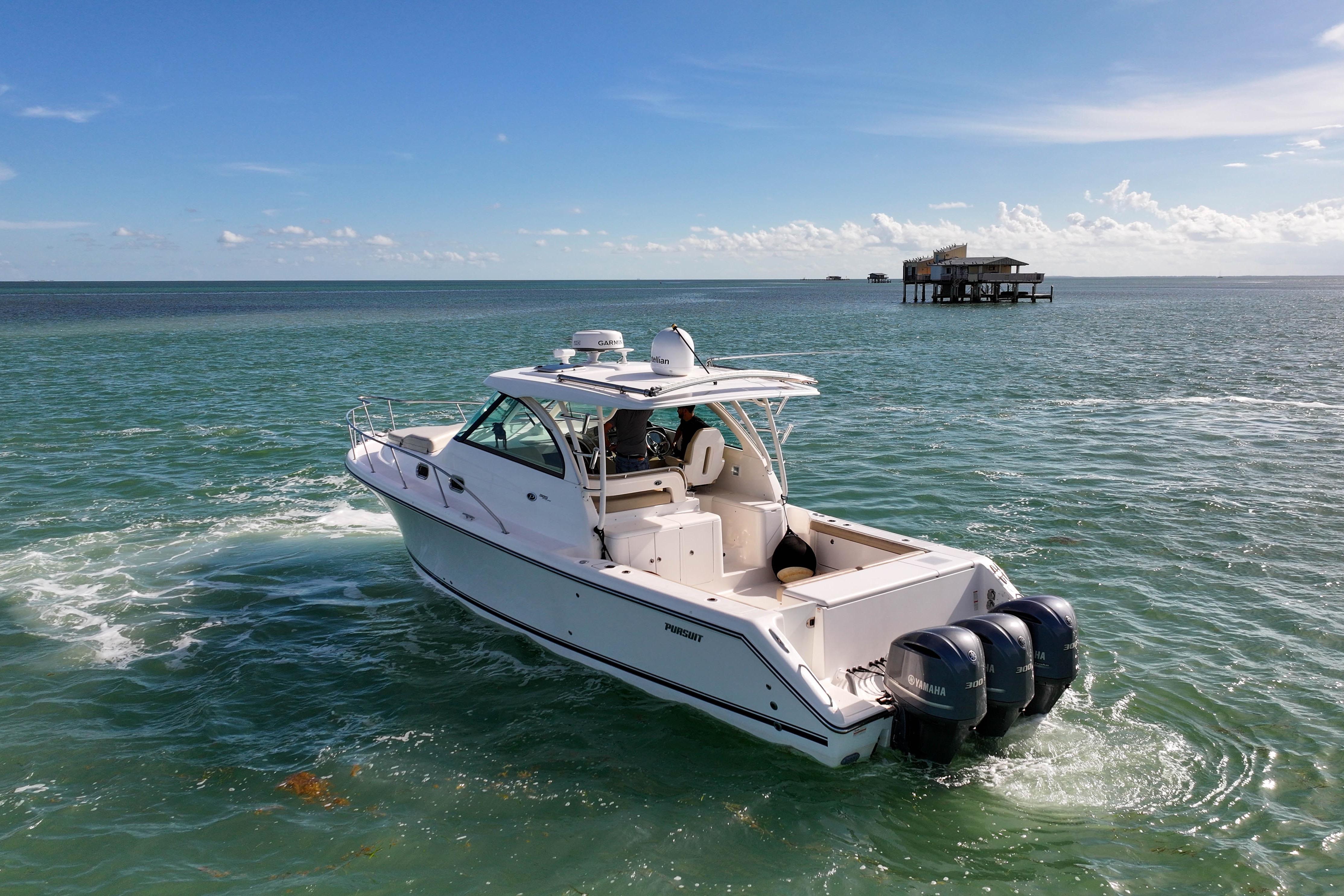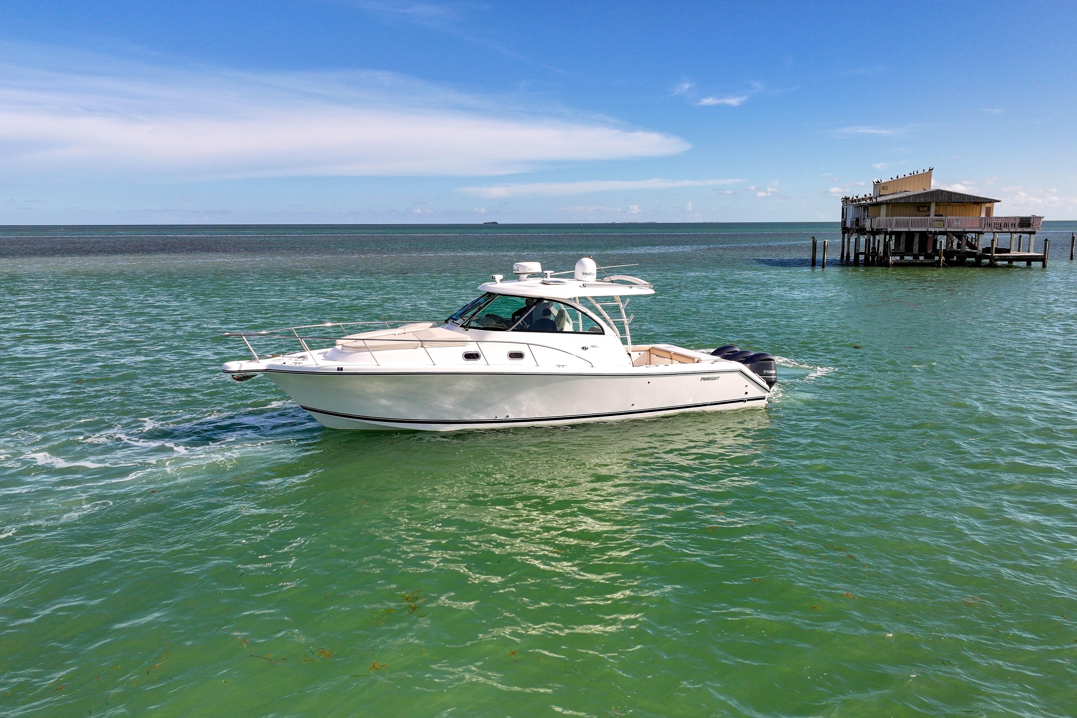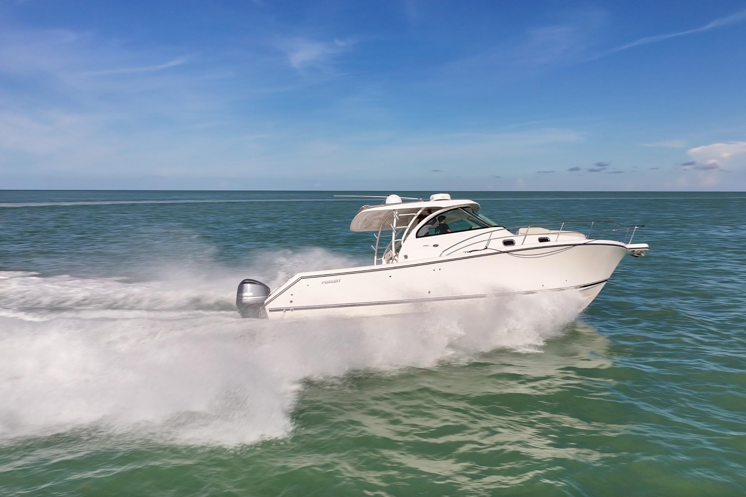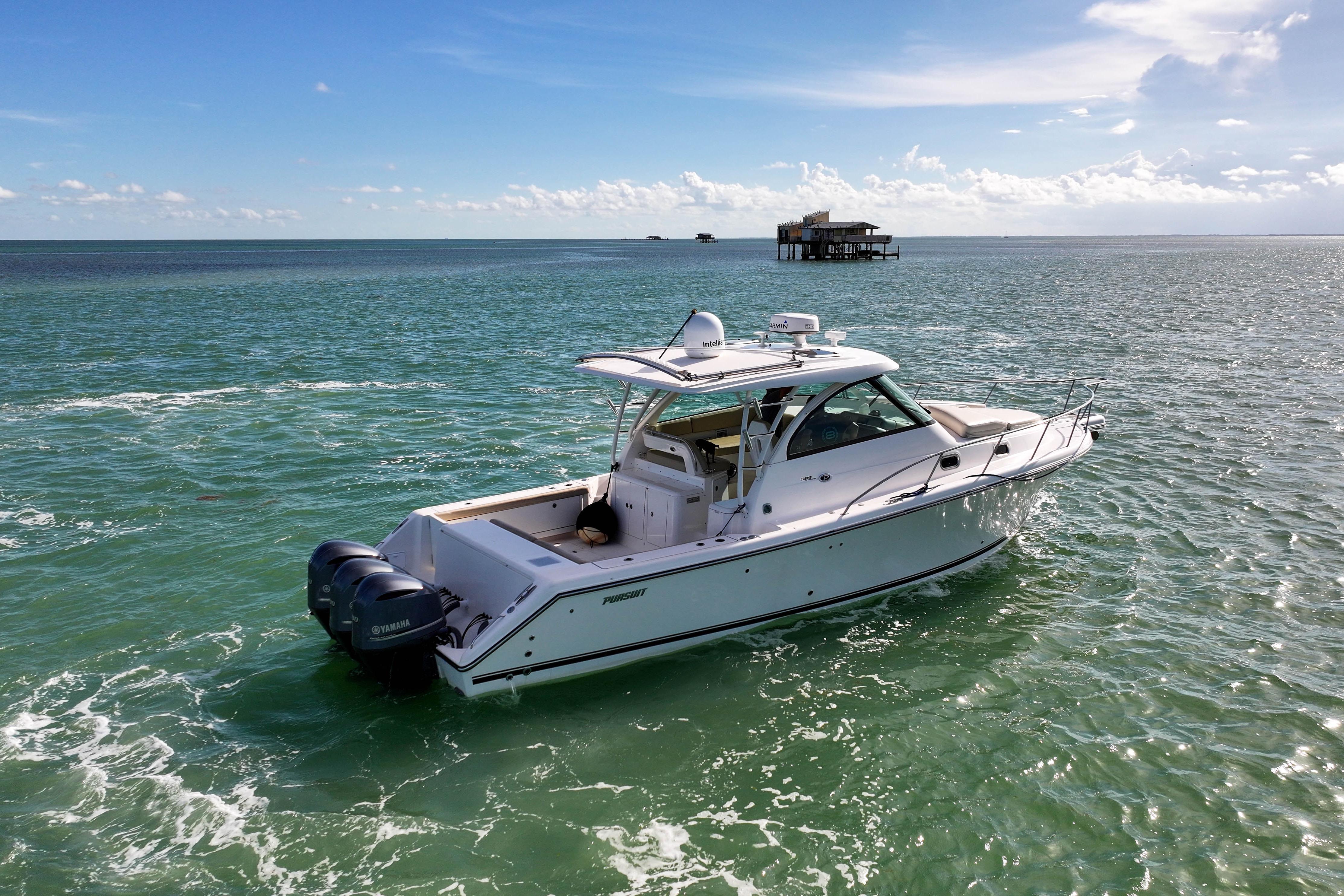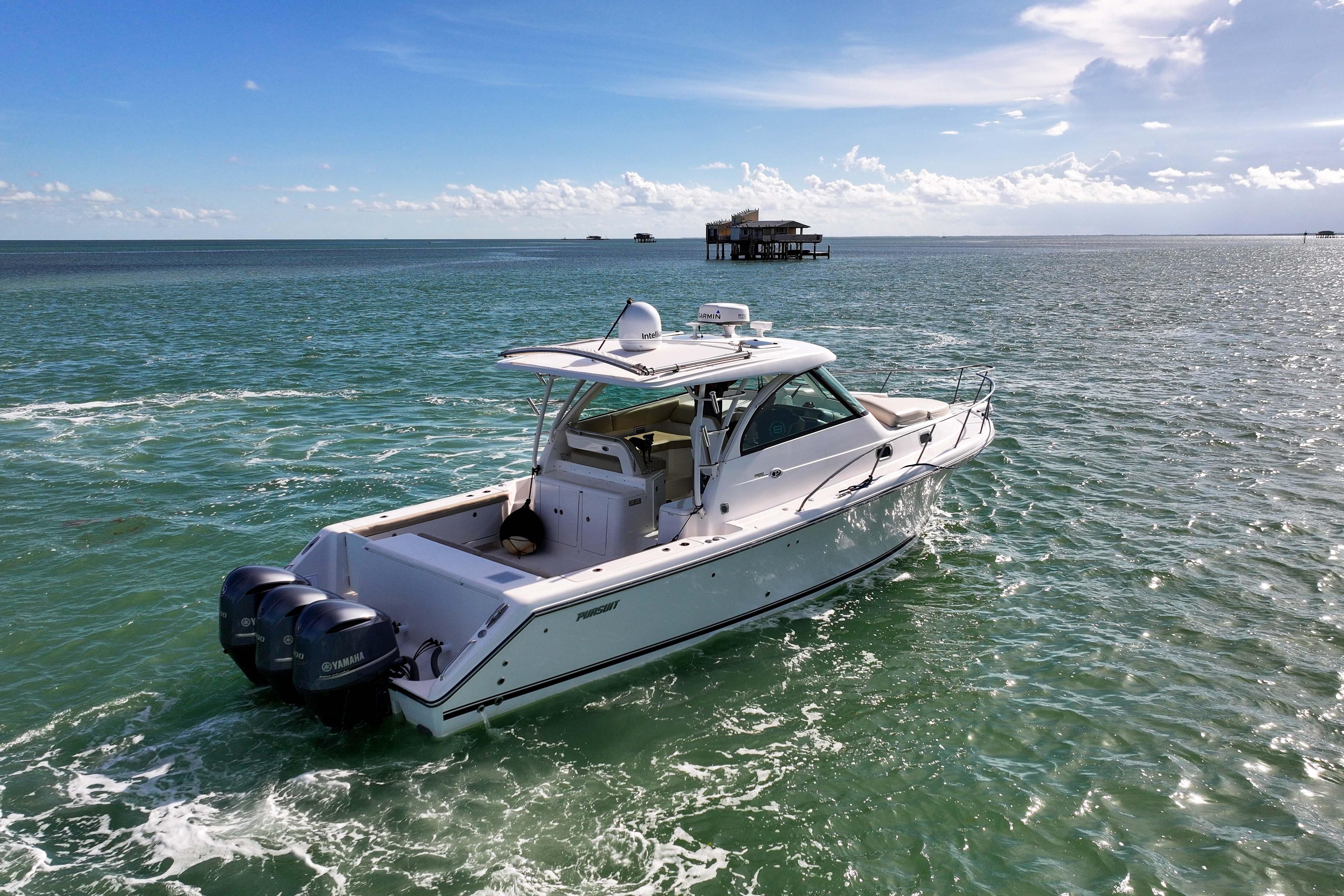 The OS 385 is the flagship model of the Pursuit fleet of premium offshore boats. Measuring just under 40 feet in length, this vessel has all the comforts of home plus a 360-degree water view.The fully integrated hardtop and windshield are engineered to support an optional factory built tower with combination cushioned seating/leaning post. The 385 combines the performance, seaworthiness and fishability of the world’s top inboard convertible and express offerings with the luxury interior appointments of most comfortable cruisers. Dependable Yamaha outboards on the transom not only increase her overall performance but also open up valuable space for additional storage and accommodations. Its sleek, express style with a 13-foot beam results in an expansive cockpit and roomy interior below decks.Structural and sound deadening insulation materials matched to proprietary stringer and assembly processes result in one of the quietest cabin environments in the market.Every inch of this boat exudes yacht caliber fit and finish, from its beefy grab rails, to its bow thruster, to its Corian®-countered gourmet kitchen — complete with a two-burner glass stovetop, microwave, 7.5 cubic-foot stainless steel refrigerator/freezer and fiberglass sink with hot and cold pressurized water.If you’ve been yearning for outstanding performance and yacht class design, without the constant maintenance and expense, the OS 385 is the answer to your dreams. Below decks, light-colored interior woods, exquisite fabrics and strategically located ports make the interior spacious, stylish and inviting. Forward of the galley, the convertible dinette seats you and your guests for a comfortable dinner at the custom lacquered wood table. Amidships you’ll find a double berth that can accommodate two adults, complete with a convenient settee with sitting headroom and reading lights. The head features a separate standalone shower compartment finished in a frosted smoked green acrylic.