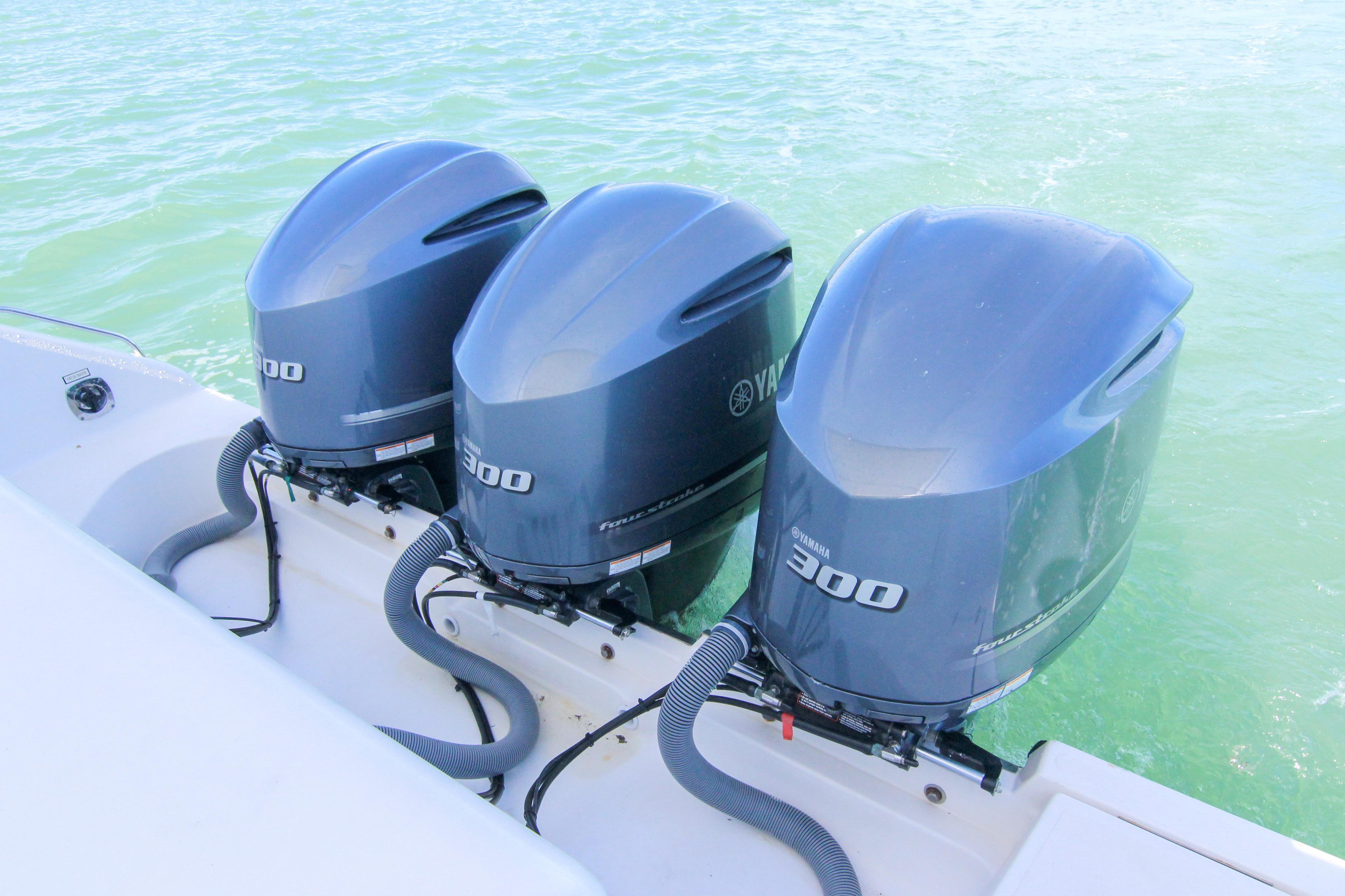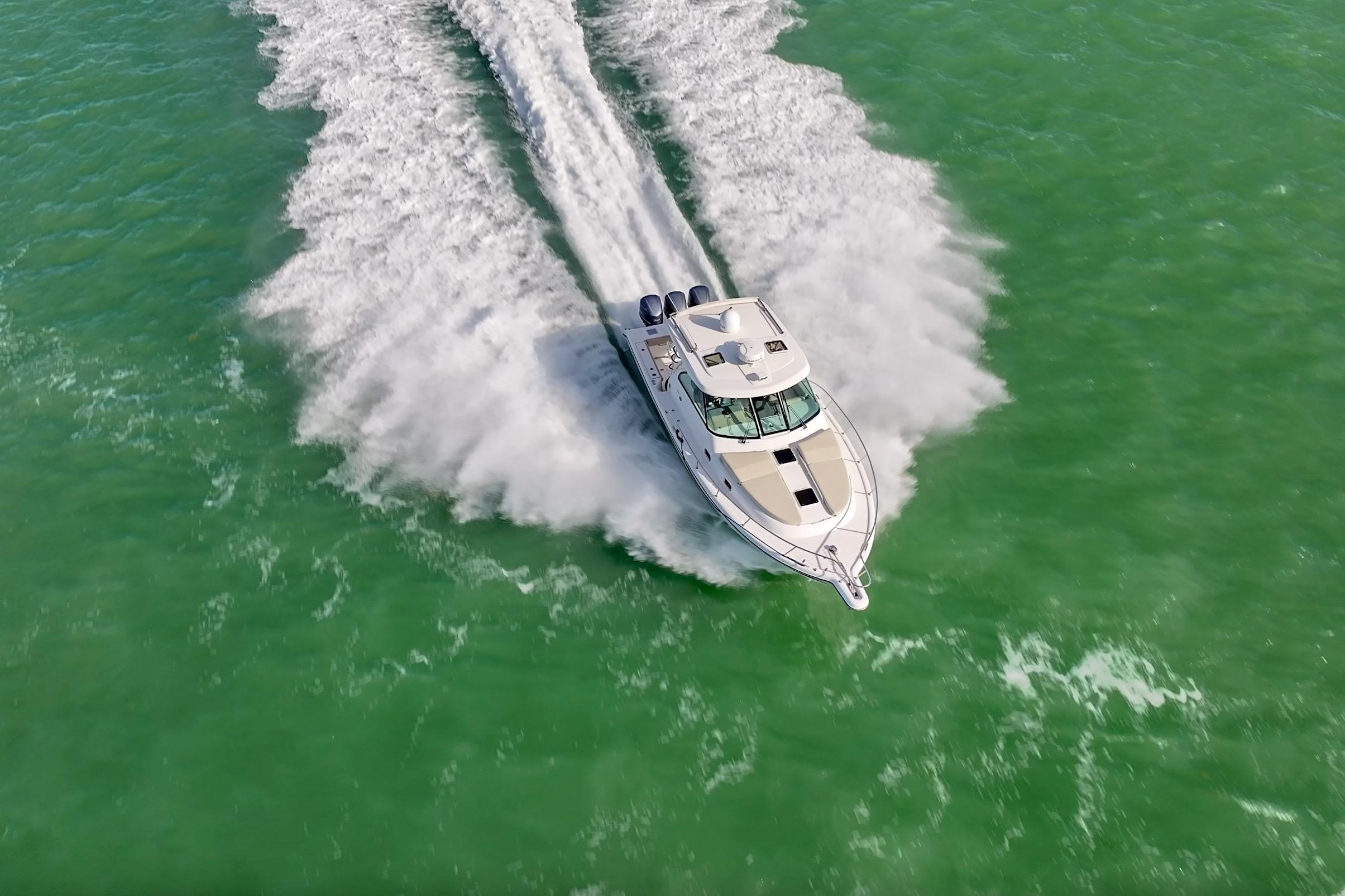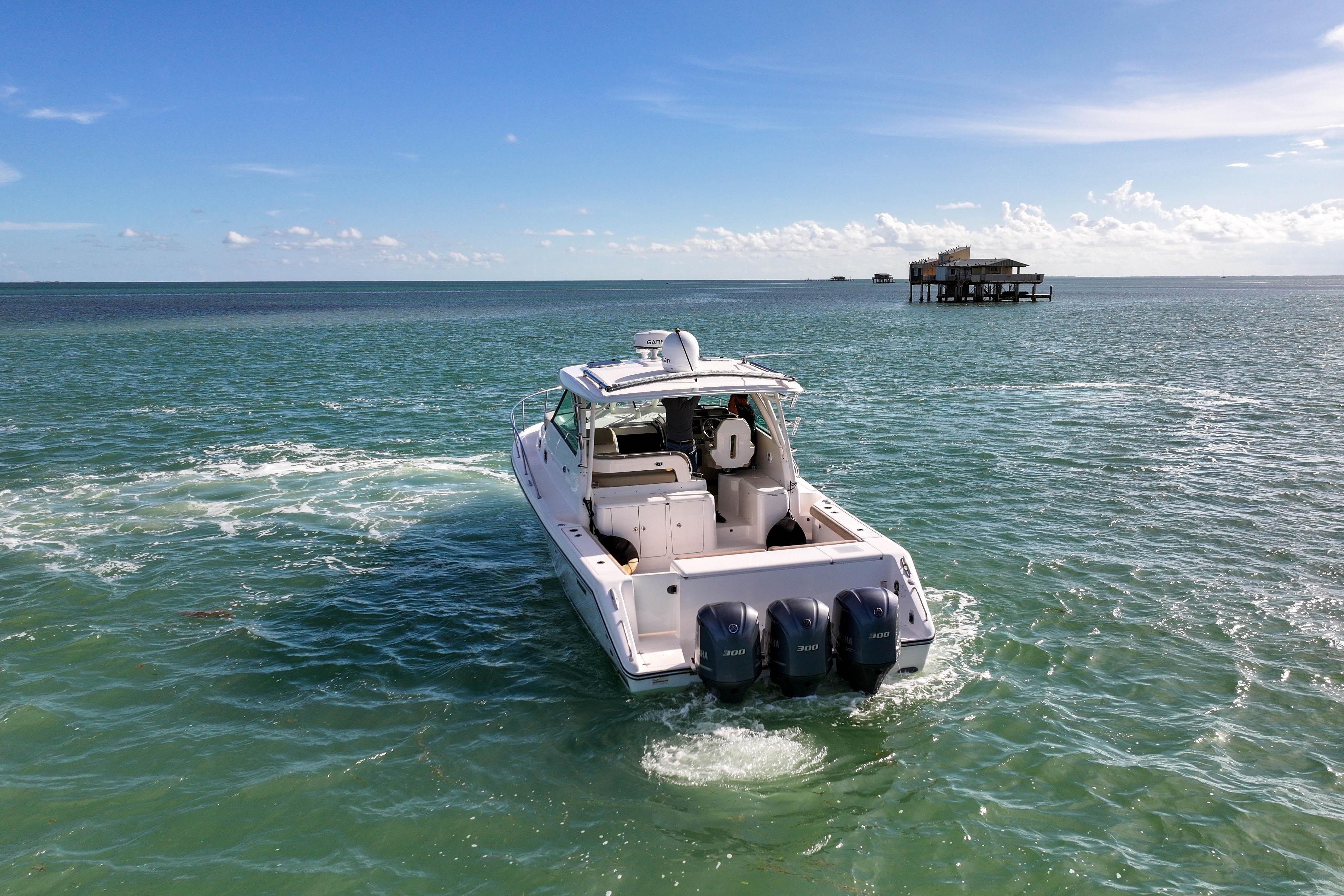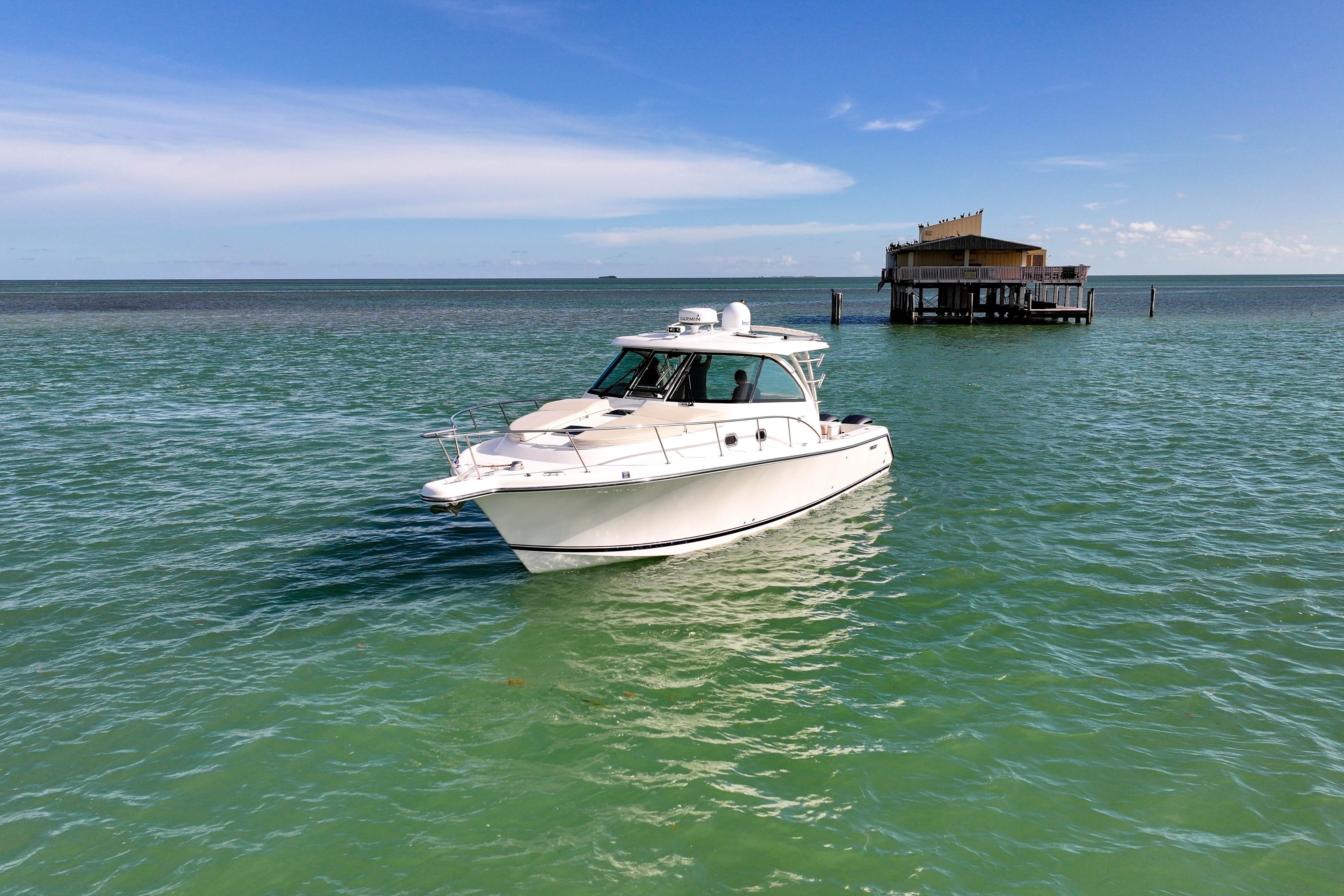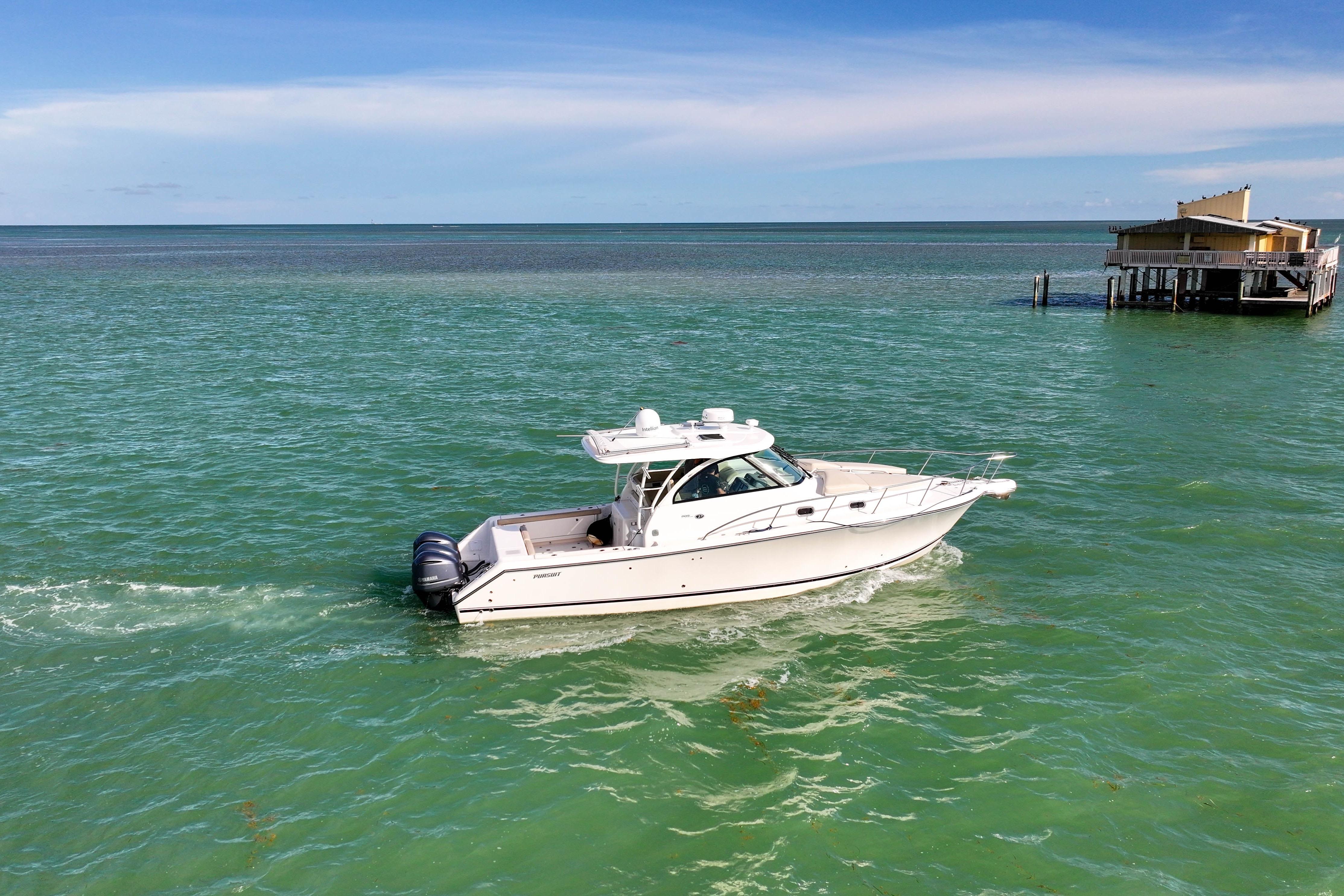 The OS 385 is the flagship model of the Pursuit fleet of premium offshore boats. Measuring just under 40 feet in length, this vessel has all the comforts of home plus a 360-degree water view.The fully integrated hardtop and windshield are engineered to support an optional factory built tower with combination cushioned seating/leaning post. The 385 combines the performance, seaworthiness and fishability of the world’s top inboard convertible and express offerings with the luxury interior appointments of most comfortable cruisers. Dependable Yamaha outboards on the transom not only increase her overall performance but also open up valuable space for additional storage and accommodations. Its sleek, express style with a 13-foot beam results in an expansive cockpit and roomy interior below decks.Structural and sound deadening insulation materials matched to proprietary stringer and assembly processes result in one of the quietest cabin environments in the market.Every inch of this boat exudes yacht caliber fit and finish, from its beefy grab rails, to its bow thruster, to its Corian®-countered gourmet kitchen — complete with a two-burner glass stovetop, microwave, 7.5 cubic-foot stainless steel refrigerator/freezer and fiberglass sink with hot and cold pressurized water.If you’ve been yearning for outstanding performance and yacht class design, without the constant maintenance and expense, the OS 385 is the answer to your dreams. Below decks, light-colored interior woods, exquisite fabrics and strategically located ports make the interior spacious, stylish and inviting. Forward of the galley, the convertible dinette seats you and your guests for a comfortable dinner at the custom lacquered wood table. Amidships you’ll find a double berth that can accommodate two adults, complete with a convenient settee with sitting headroom and reading lights. The head features a separate standalone shower compartment finished in a frosted smoked green acrylic.
