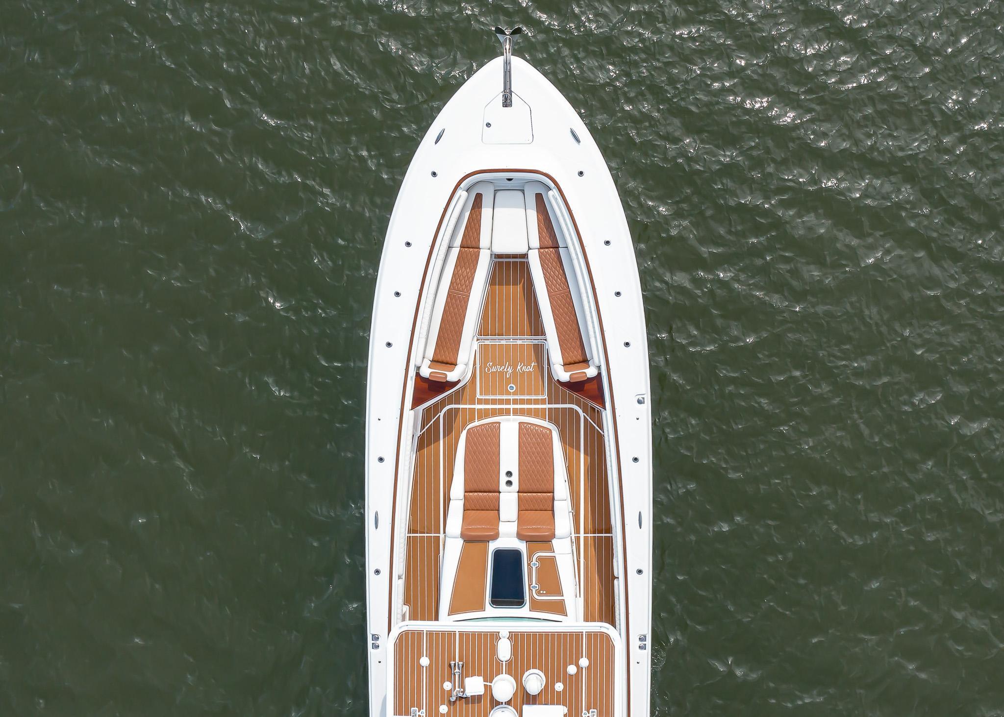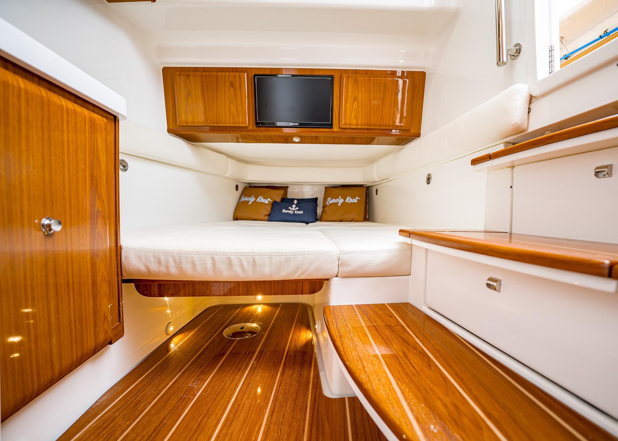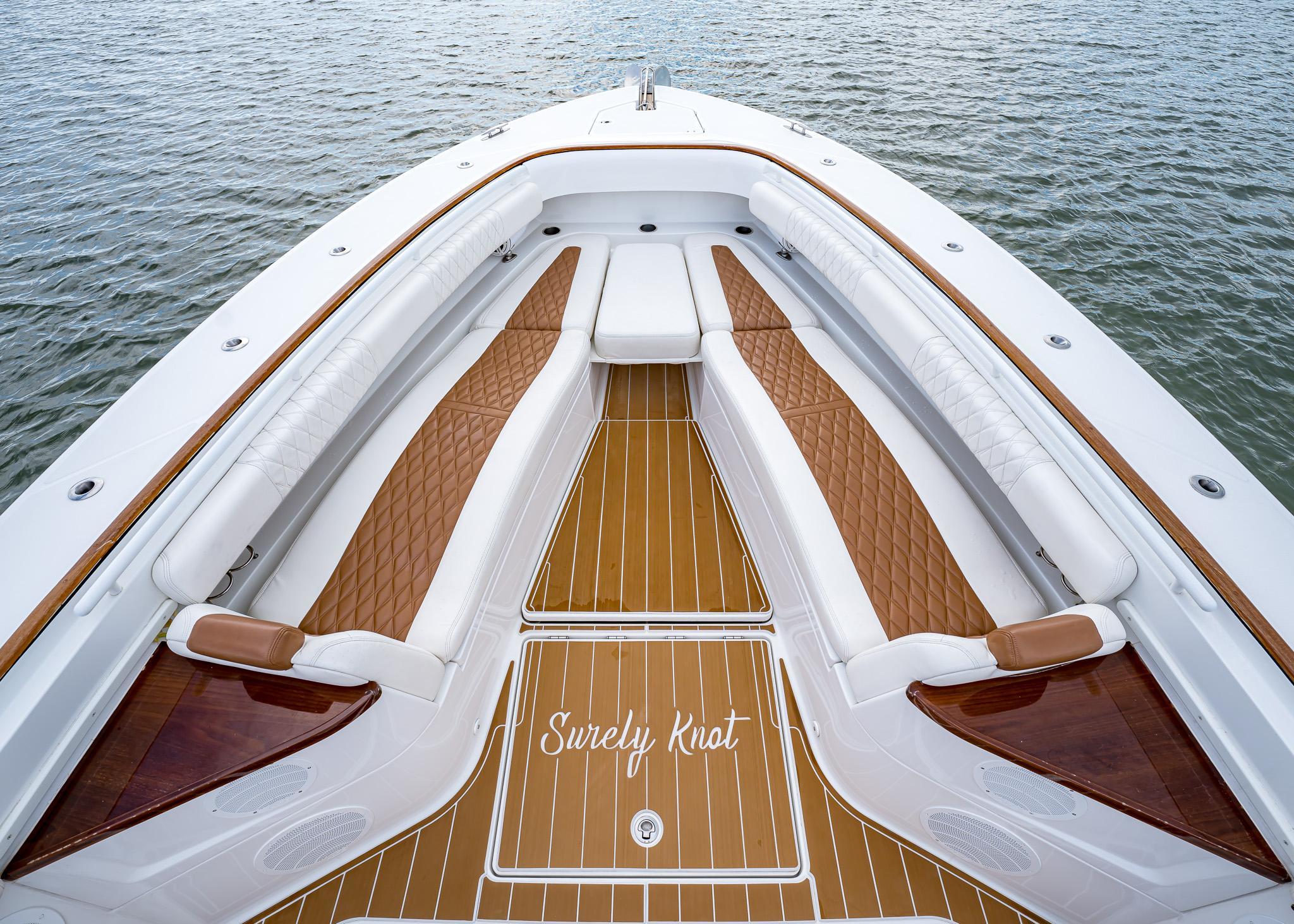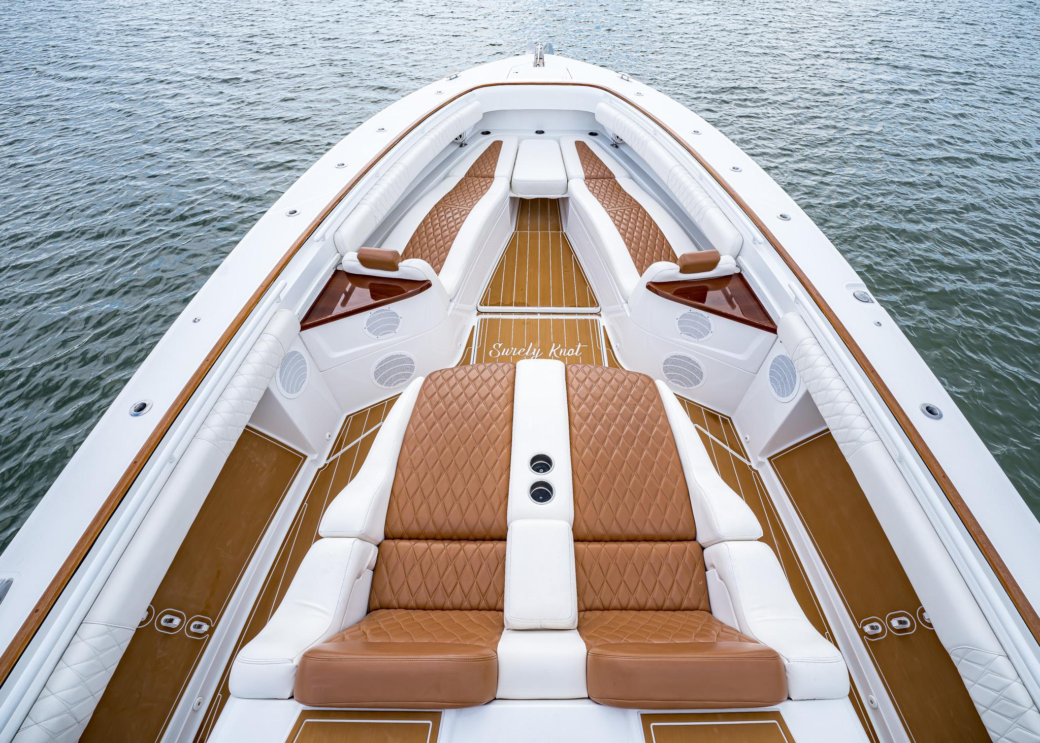 Finally, a large center console yacht with the sophisticated design to perfectly balance speed, ride, comfort, and all of the luxury of your “dream” yacht. The bow area is dual purpose with seating to accommodate guests on the forward-facing lounger or around bow seats and table that convert to a large sun pad for lazy days catching rays; or remove the cushions for a fully functional fishing platform. The luxuriously functional cabin with queen sized berth, storage galore, galley kitchen, and separate head/shower compartment is the perfect place for air-conditioned comfort on hot days as well as longer trips with overnight stays. An automotive inspired helm station allows the captain to be fully aware of the surroundings while staying in tune with the endless functionality on-board including: charts and navigation, Sea Keeper®, generator, ample stereo system, the quad engine package, and more. For the uncompromising, the Sueños will satisfy any experience you can imagine, and take you places few other Center Console Yachts dream to embark.